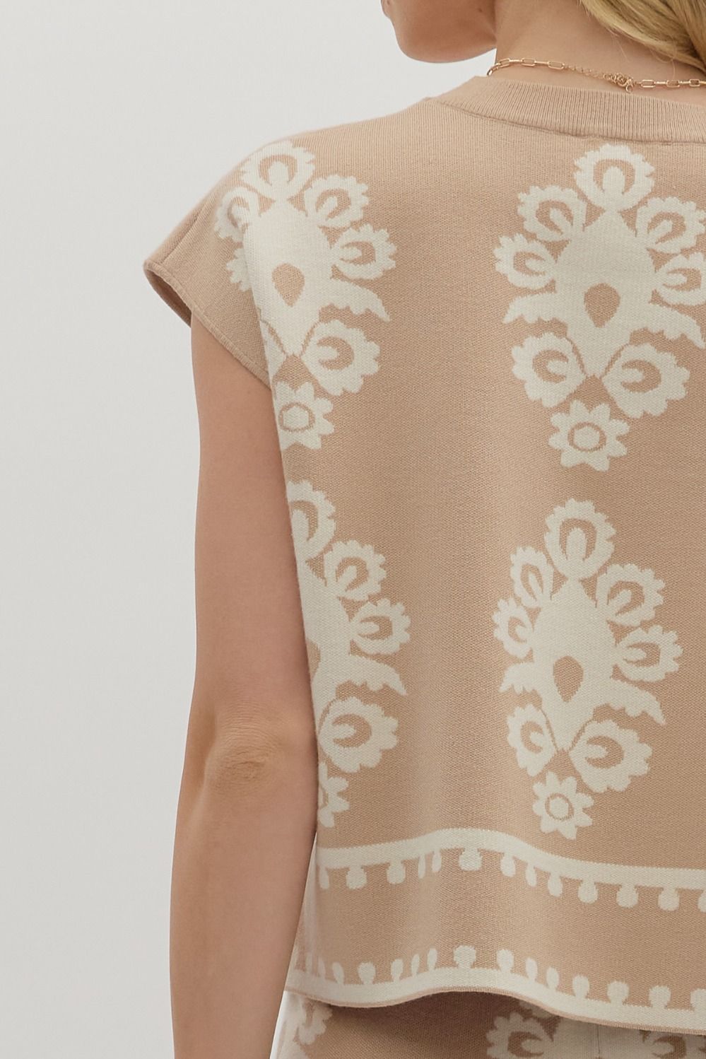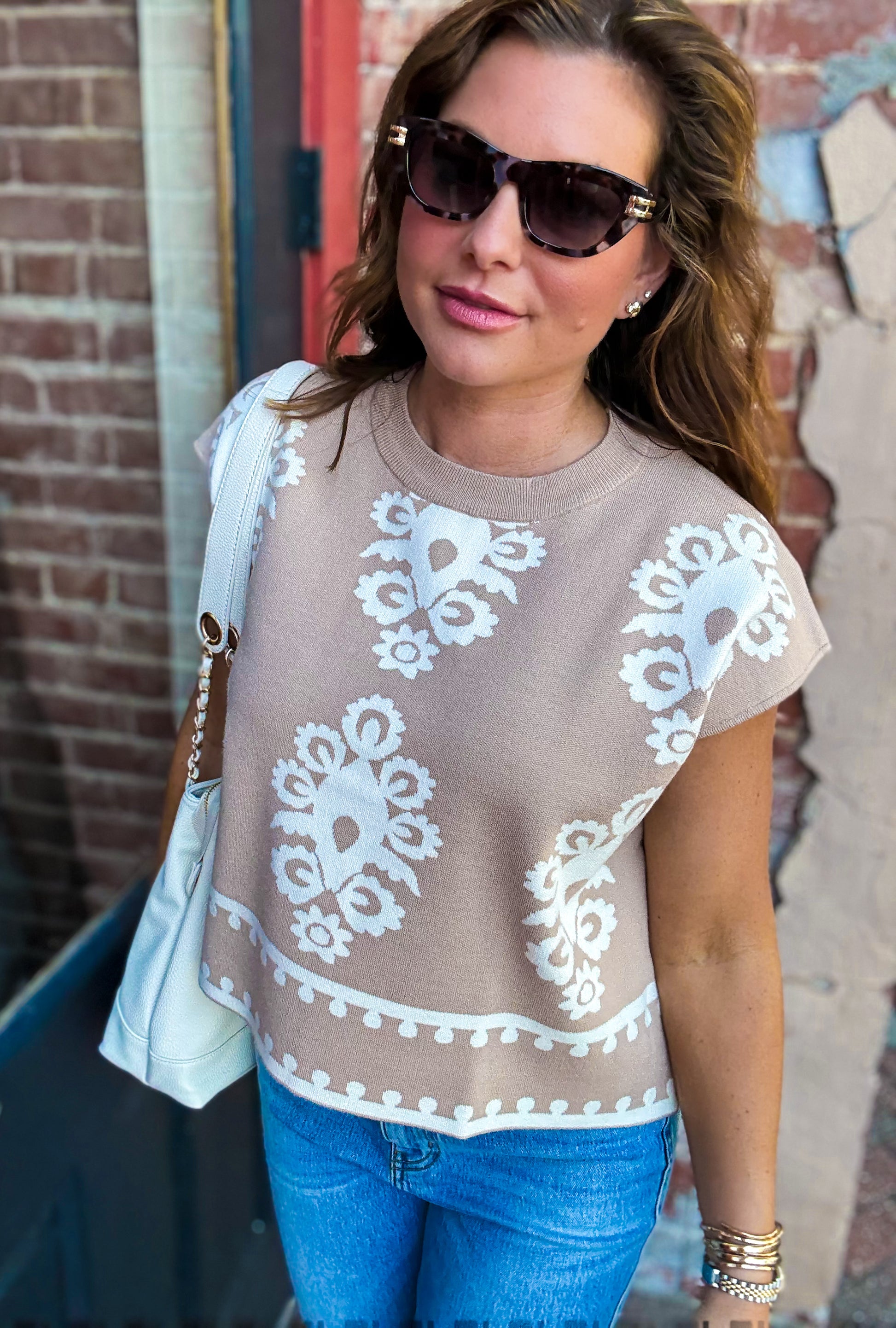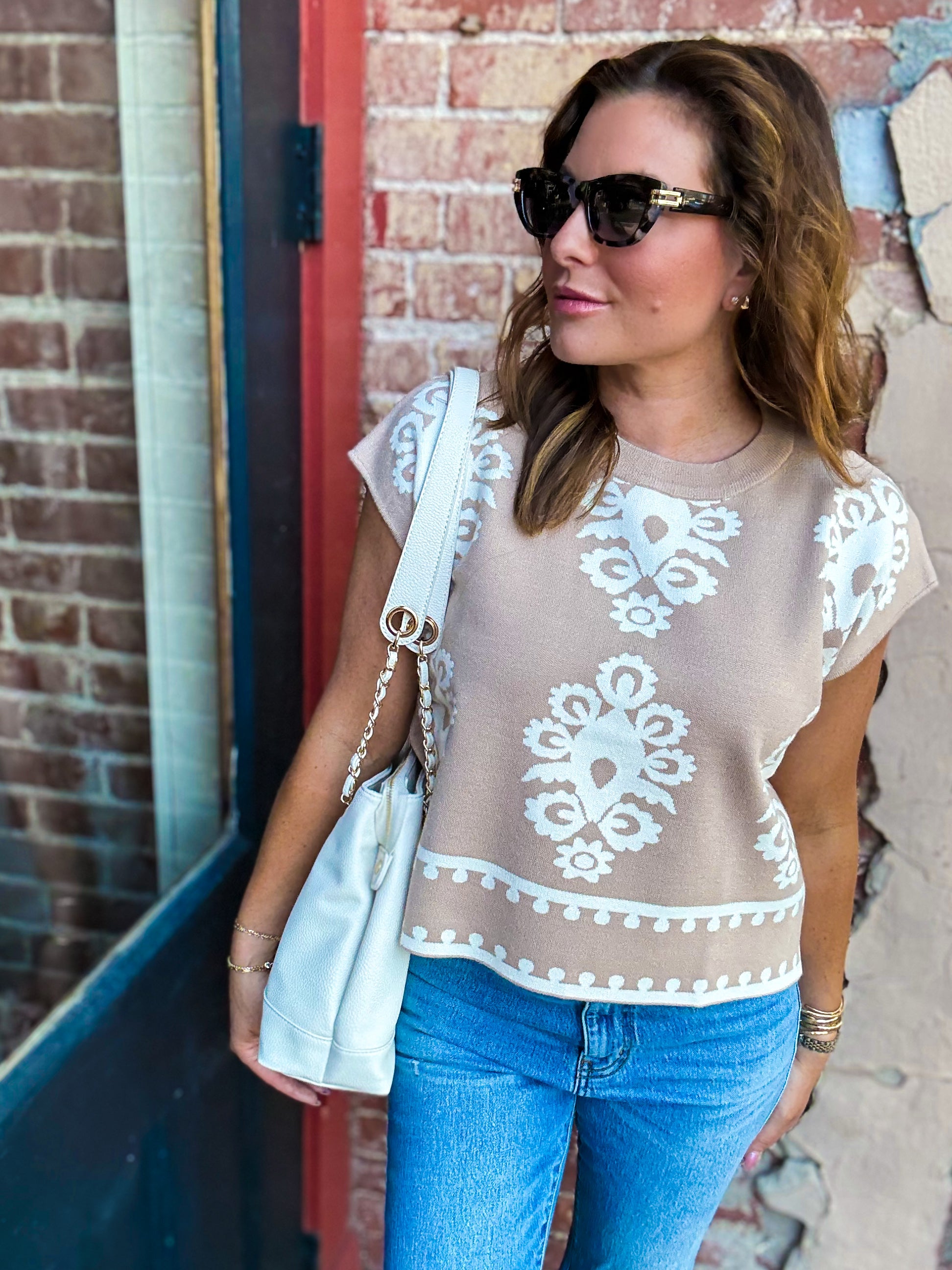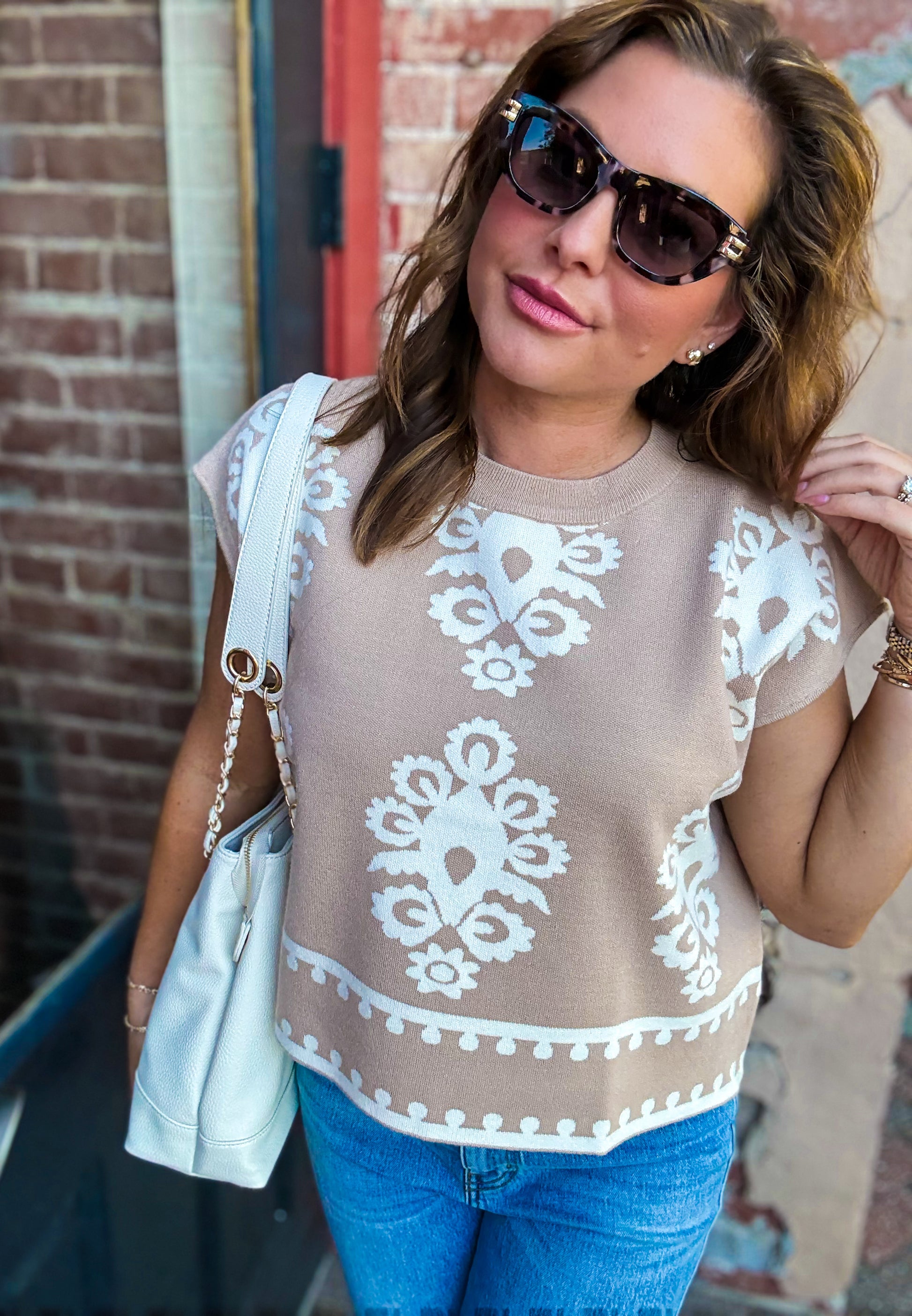 Get cozy and stylish with the Tulum Sweater Knit Top! Featuring a charming damask pattern and a muscle tee cut, this pullover blends comfort with a playful edge. Perfect for layering or wearing solo, it adds a fun twist to your everyday look.