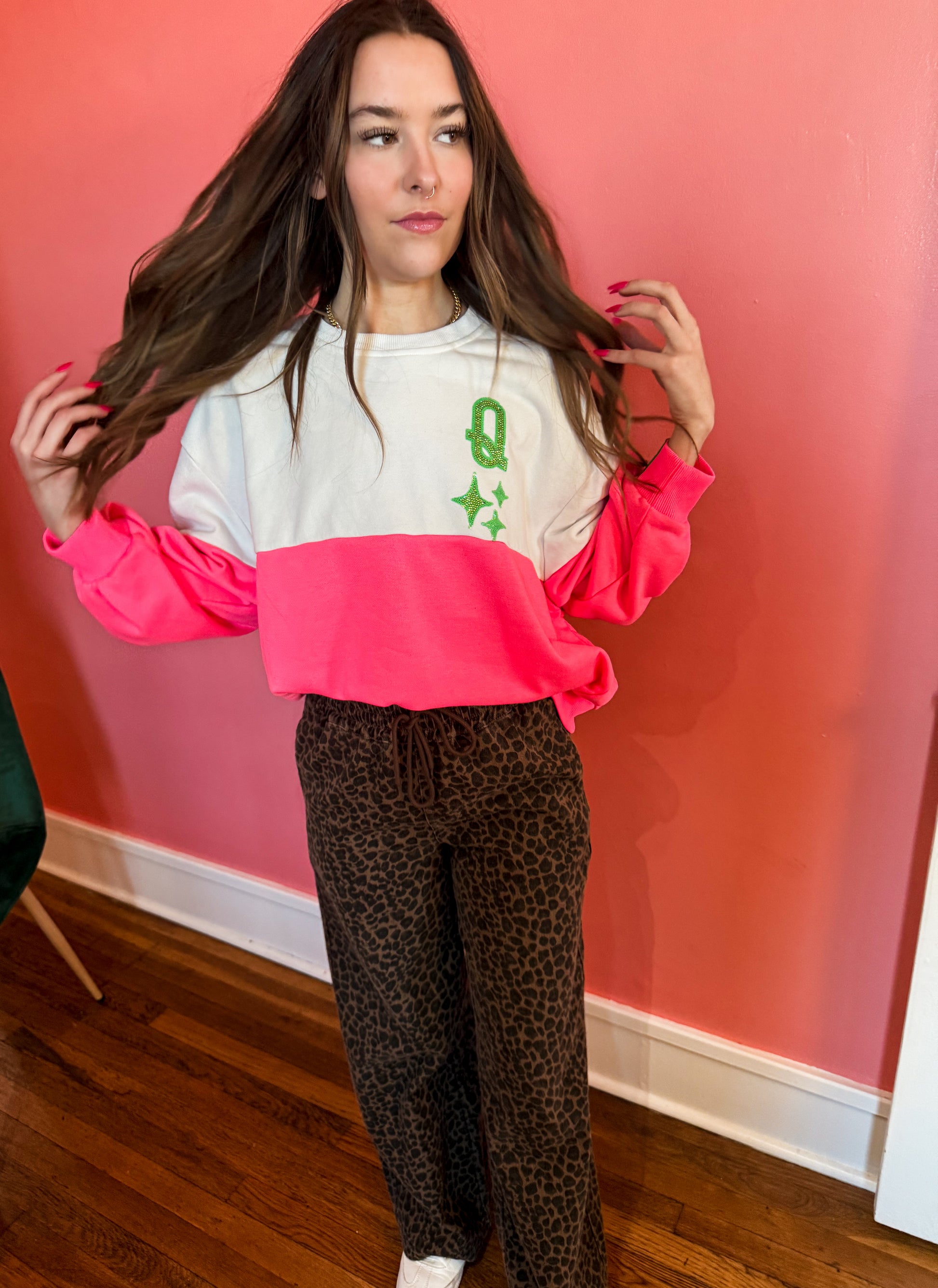 Meet the sweatshirt that turns every day into a statement. This bold pink + white colorblock pullover features Queen of Sparkles’ iconic card-queen motif—fully decked out in vibrant sequins, shimmering stars, and neon details. The front keeps it playful with a jeweled initial and stars, while the back delivers the full glittering Queen card design for maximum impact.