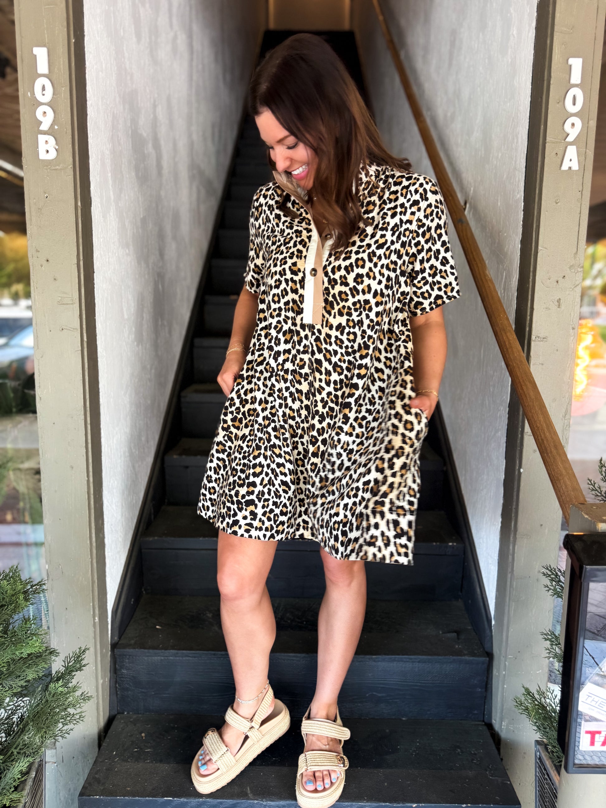 Be the wild card in this leopard print dress. Featuring a high band collar, front half button closure, and pockets, this mini dress will add a pop of color and playful style to any occasion. Its lightweight, non-sheer material ensures both comfort and confidence.