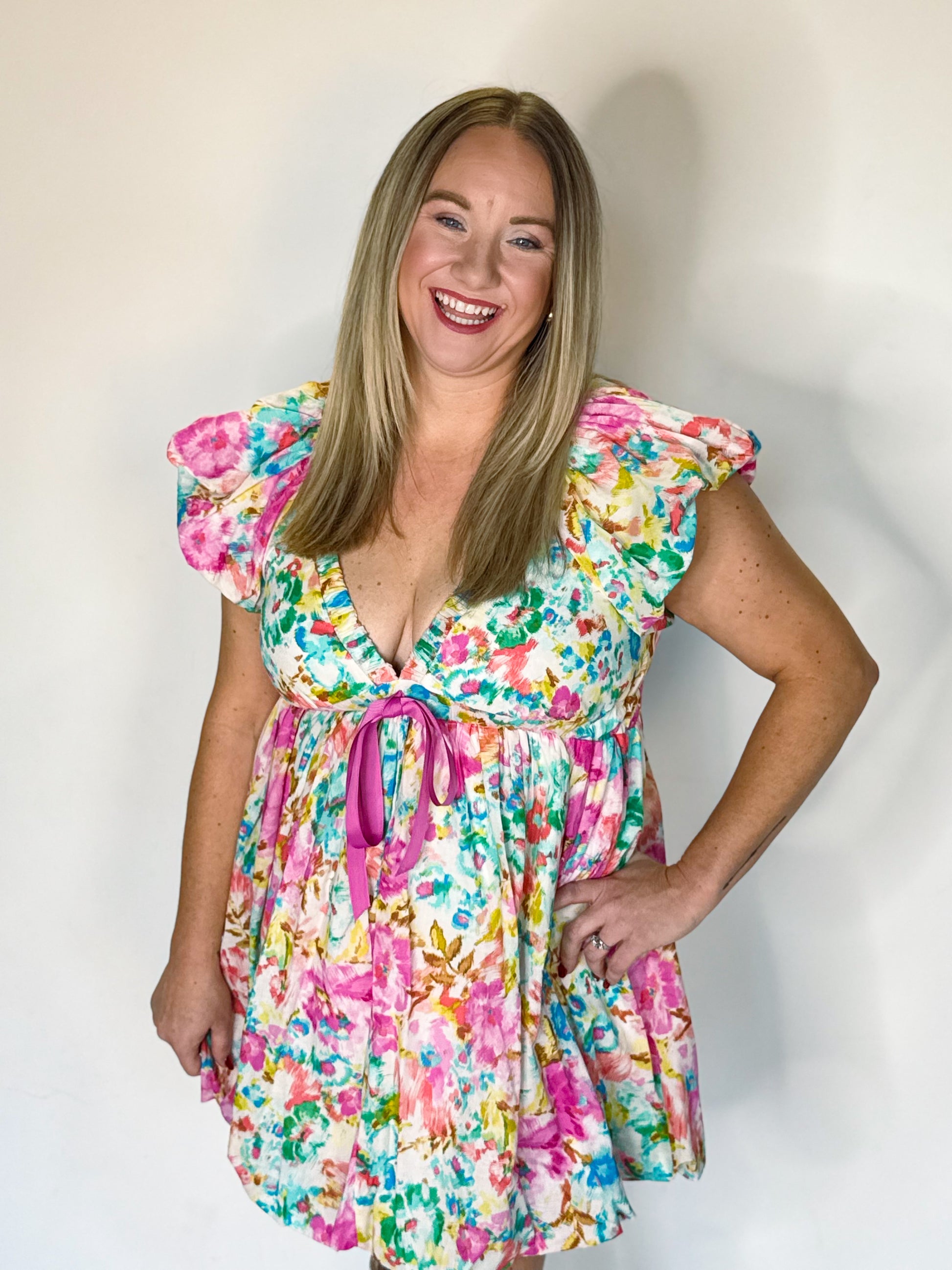 Get ready to bloom in style with our Aegean Garden mini dress! Featuring a playful pastel abstract print, a deep v neckline, and a tie ribbon bow, this dress is perfect for any occasion. Plus, the ruffle sleeves add a touch of fun to your look. Put a spring in your step with this must-have piece!