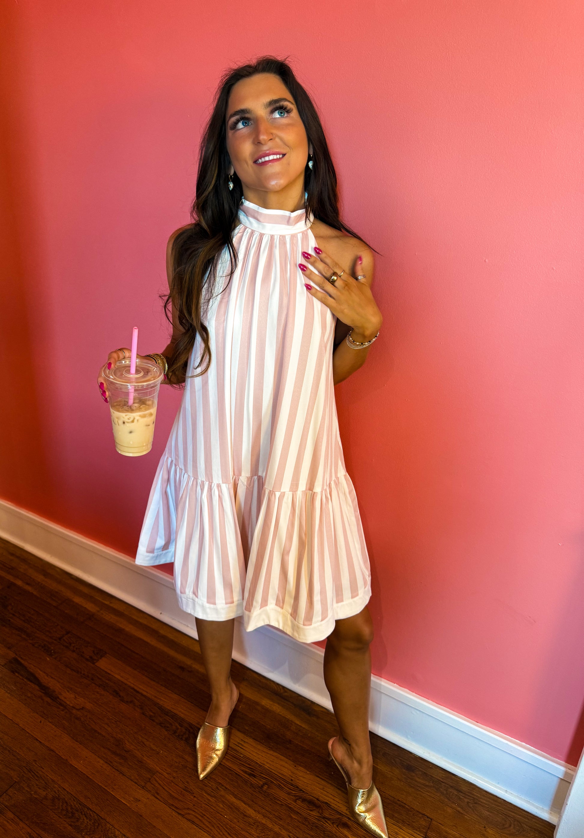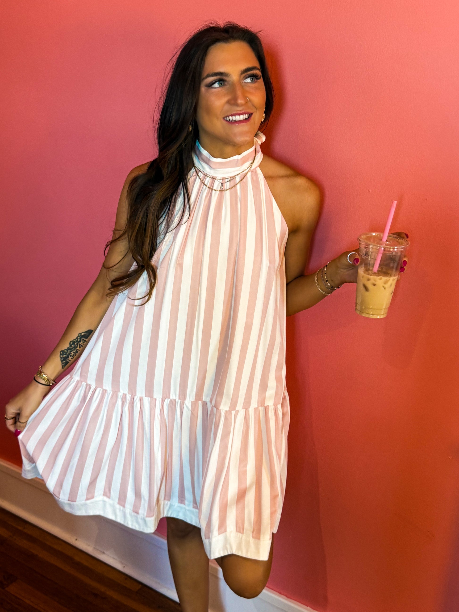 Step into vintage-inspired elegance with this charming swing dress featuring a flattering tie-back neckline and playful pink-and-white stripes. The delicate scalloped trim adds a touch of whimsy to the hemline, while the relaxed silhouette offers comfort and movement. Perfect for garden parties, brunch dates, or any occasion calling for retro flair with a modern twist. A wardrobe essential that brings joy to your everyday style.