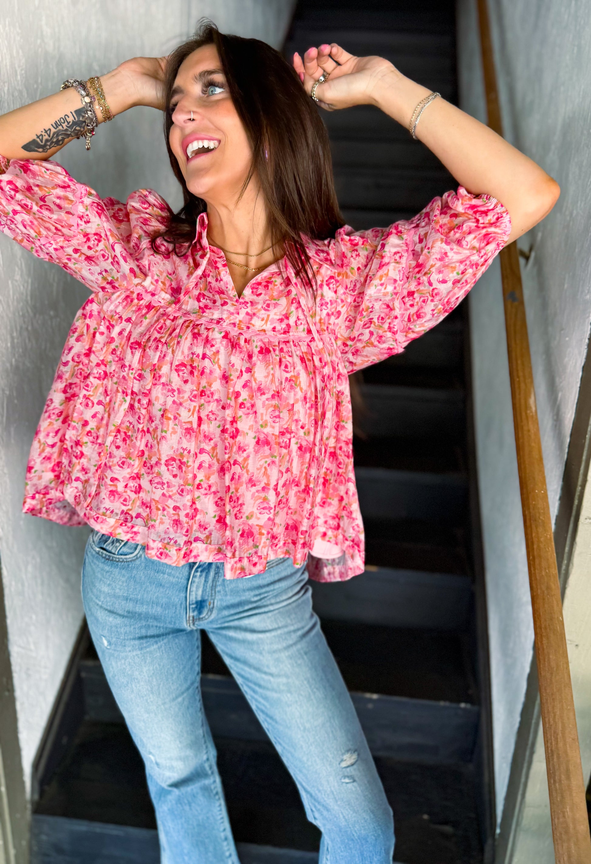 The Rosy Breeze Top is a playful floral blouse designed with a charming collared neckline and a delicate tie detail. Its flowy babydoll silhouette and puff sleeves accented with subtle lace trim create a light, breezy feel perfect for spring and summer days. Crafted from lightweight woven fabric, this top pairs effortlessly with denim, skirts, or tailored shorts to add a fresh, feminine touch to your daytime wardrobe.