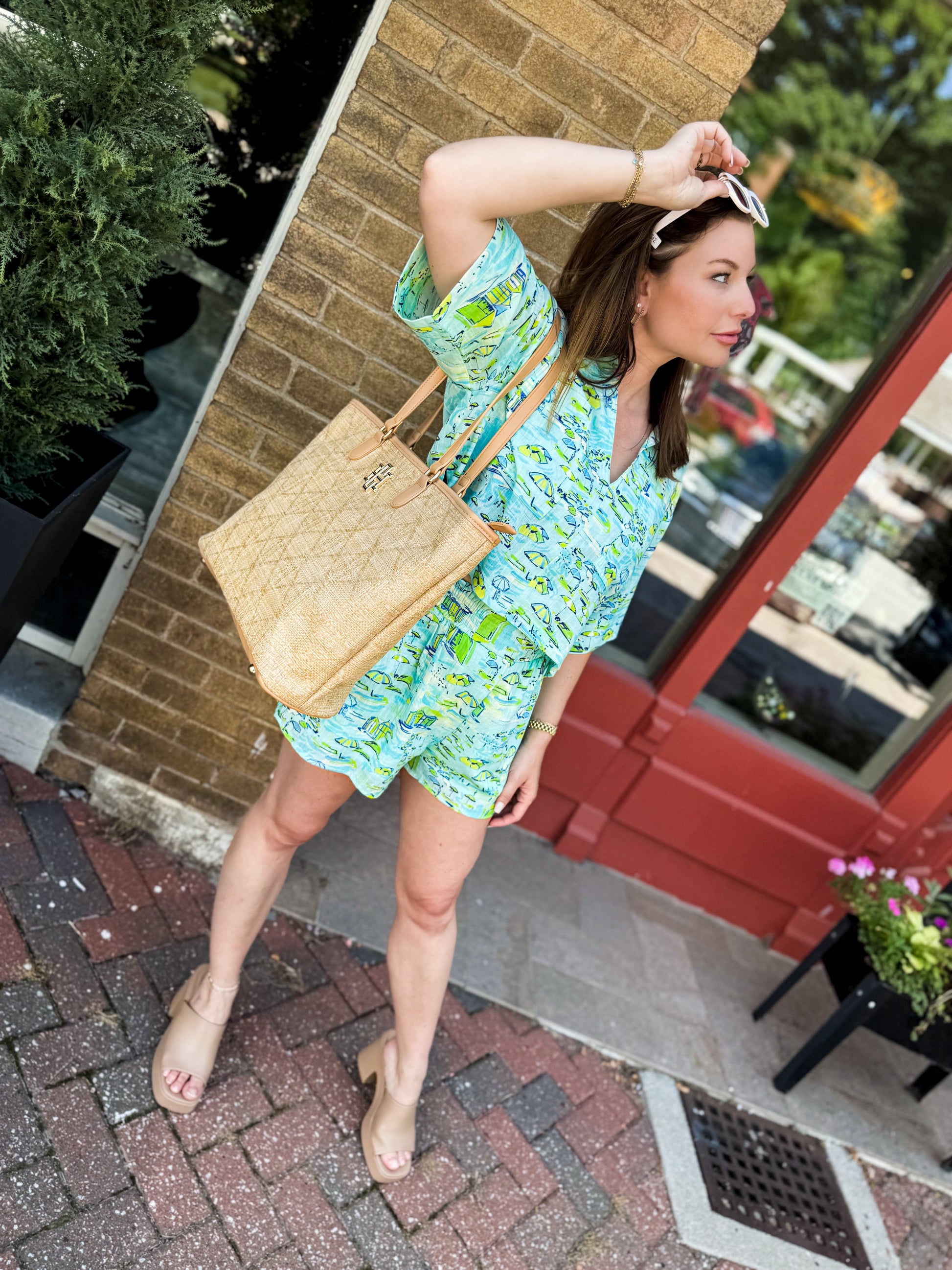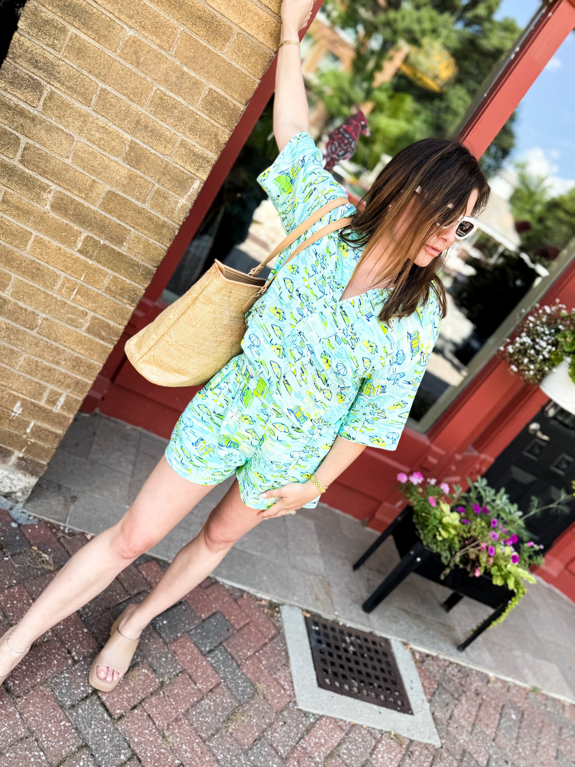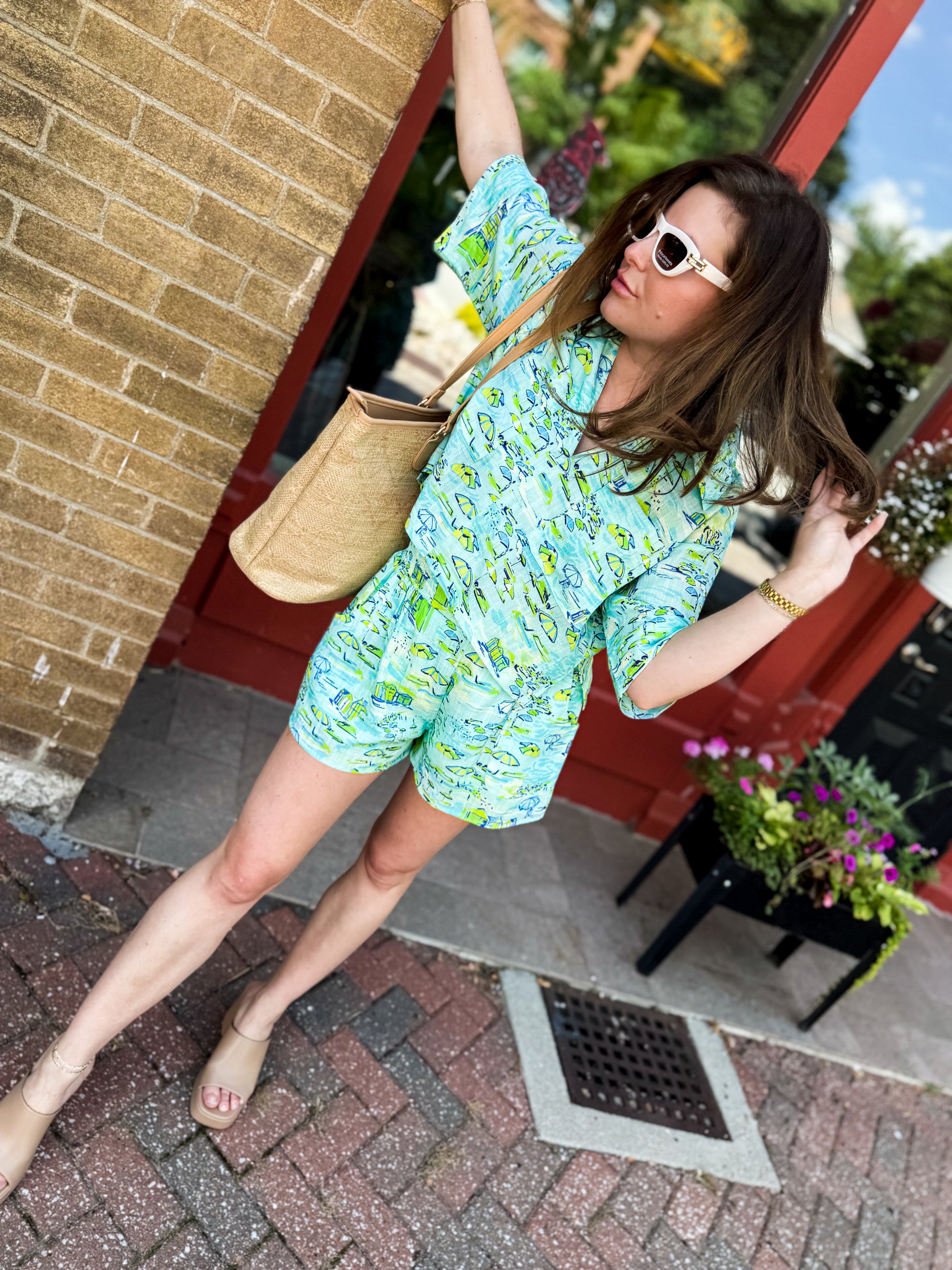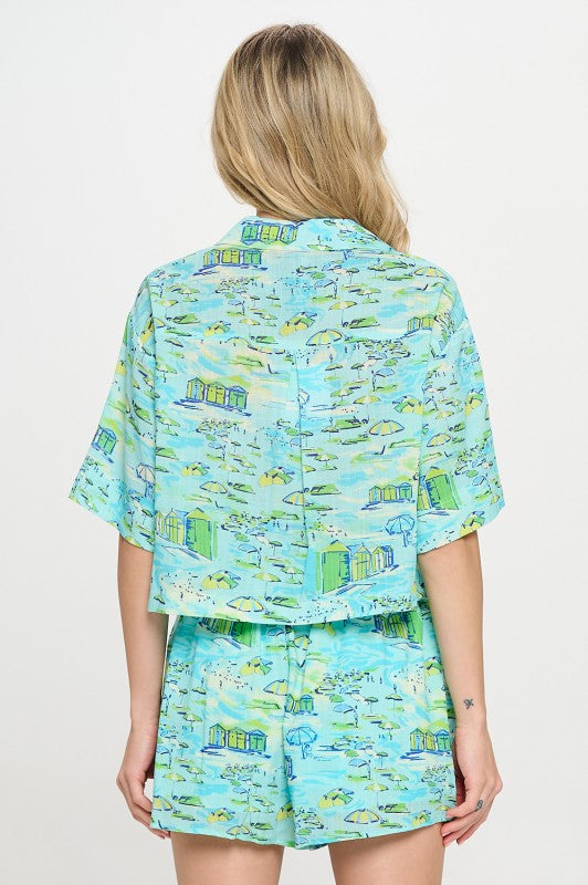 Breezy, bold, and made for coastal escapes—meet your new vacation uniform. The Azure Shoreline Set features a relaxed buttonless top with short dolman sleeves and a laid-back boxy fit, paired with easy pull-on shorts designed with a smocked waistband and side pockets for all-day comfort. Crafted in a soft, breathable fabric and adorned with a hand-sketched beachscape print, this matching set captures the carefree spirit of summer. Whether you're seaside strolling, poolside lounging, or beach bar hopping, this playful duo brings sunshine to every moment.