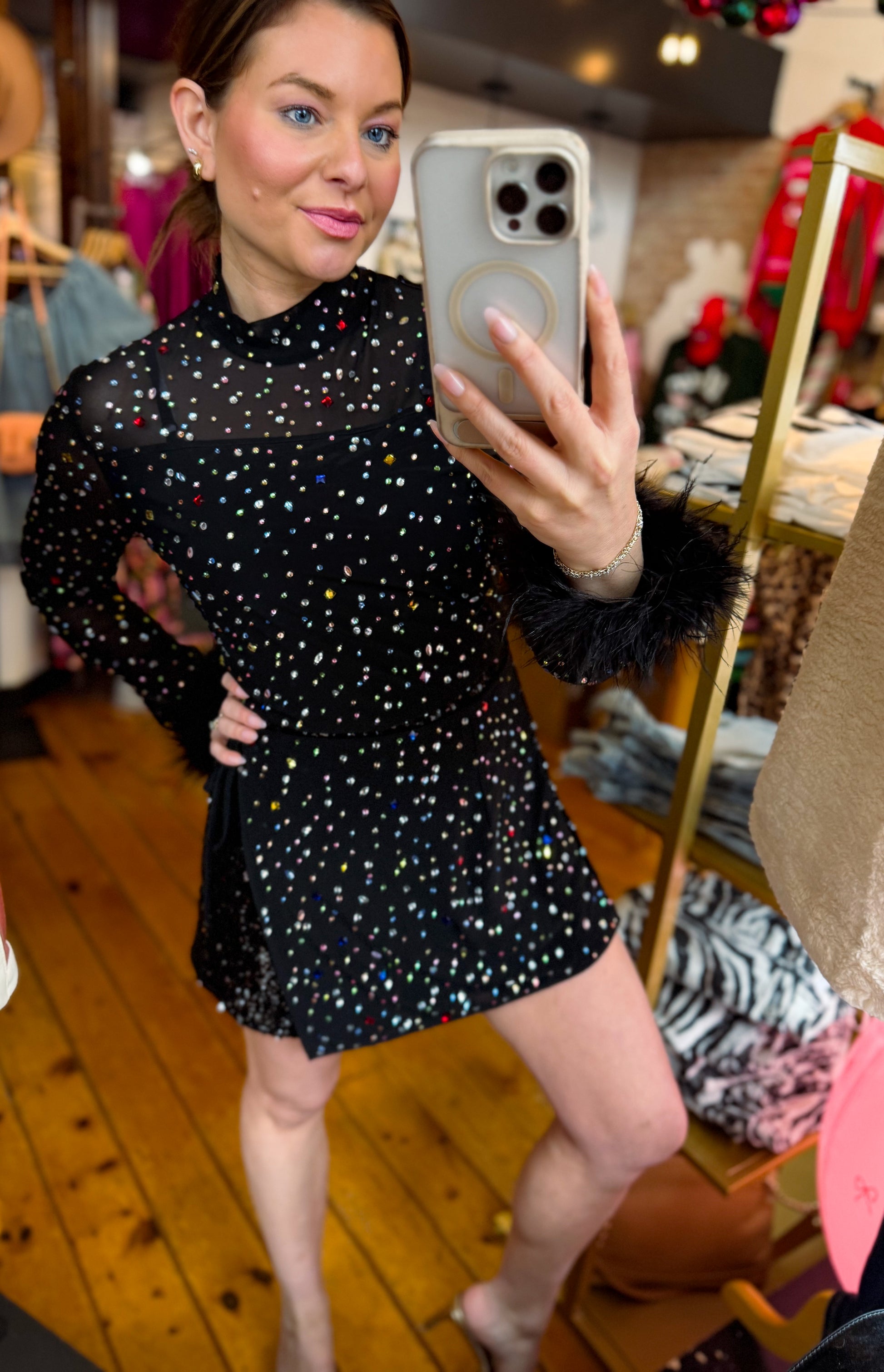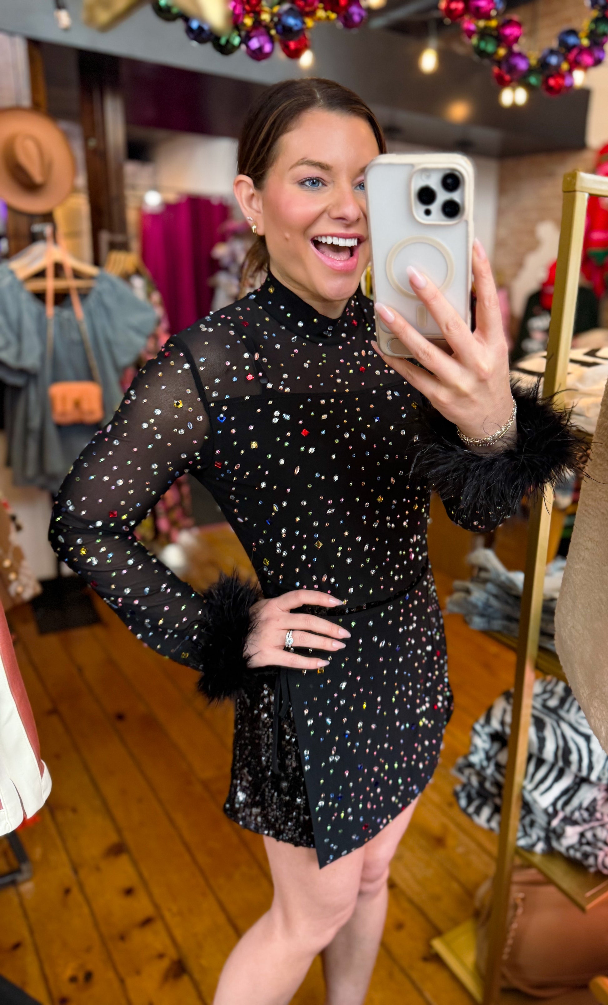The ultimate party dress just dropped — and she’s serving all the sparkle. This Queen of Sparkles stunner features a black mesh overlay drenched in multicolor rhinestones that catch every ounce of light. The flattering wrap silhouette ties at the waist, and the sleeves are finished with luxe feather cuffs for that extra dramatic moment.