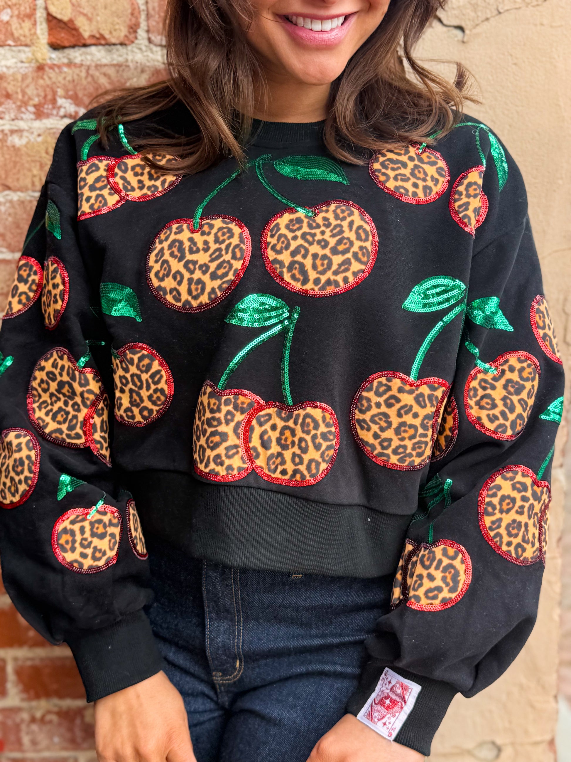 Turn up the fun with this statement sweatshirt that’s anything but ordinary. Featuring bold cherry motifs decked out in leopard print and sparkling sequins, this top brings playful glam to an everyday silhouette. The classic crew neckline and relaxed fit keep it comfy, while the allover sparkle makes it unmistakably Queen of Sparkles. Perfect for pairing with denim, faux leather, or the matching shorts when you’re feeling extra.