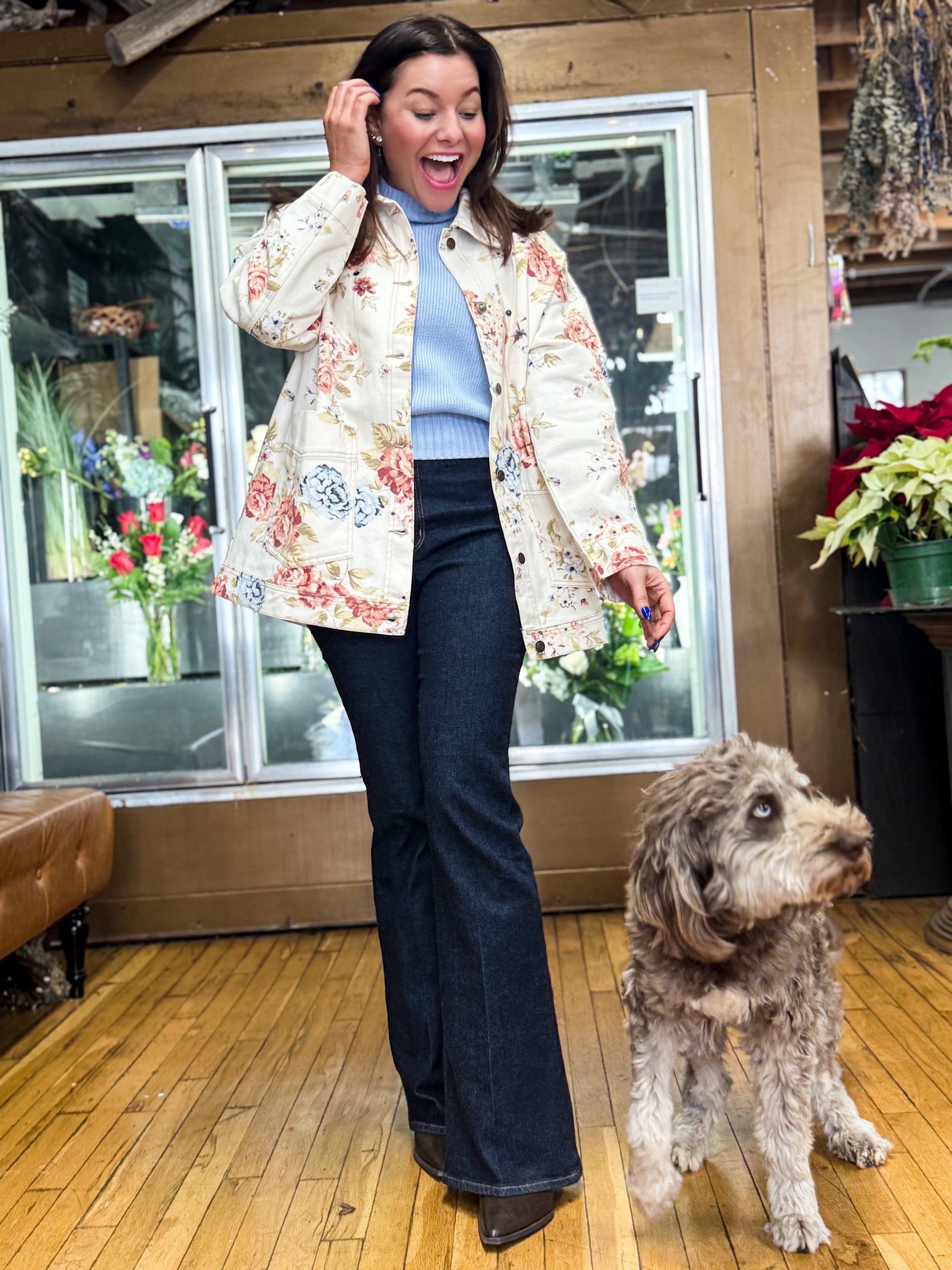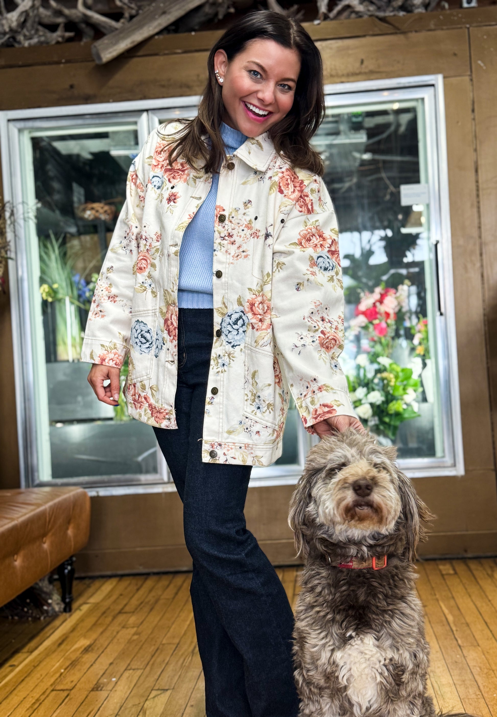 The jacket that instantly pulls an outfit together. The Blossom Market Utility Jacket features a soft cream base with a timeless floral print, blending feminine charm with an easy, everyday silhouette. Designed with a relaxed fit, functional front pockets, and lightweight structure, this piece is perfect for layering through early spring and beyond. Toss it on over knits, tees, or dresses for that effortlessly put-together, cottage-meets-cool look.