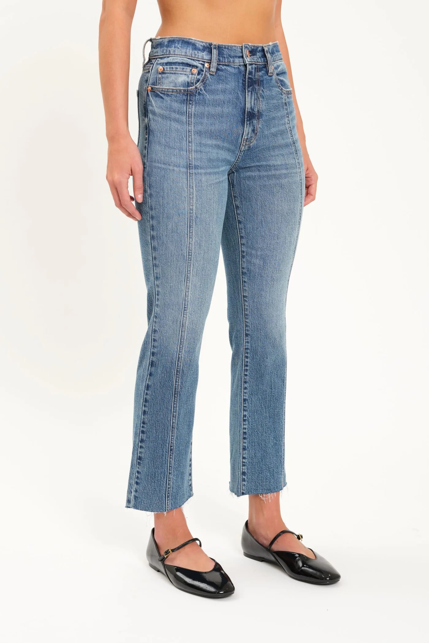 In a medium wash with sophisticated front seams, the Shy Girl is a cropped flare that can be worn with any kind of shoe. Constructed in our "Tough Love" denim, it makes it look like an authentic vintage fit - mostly rigid but yields to your body in all the right ways.