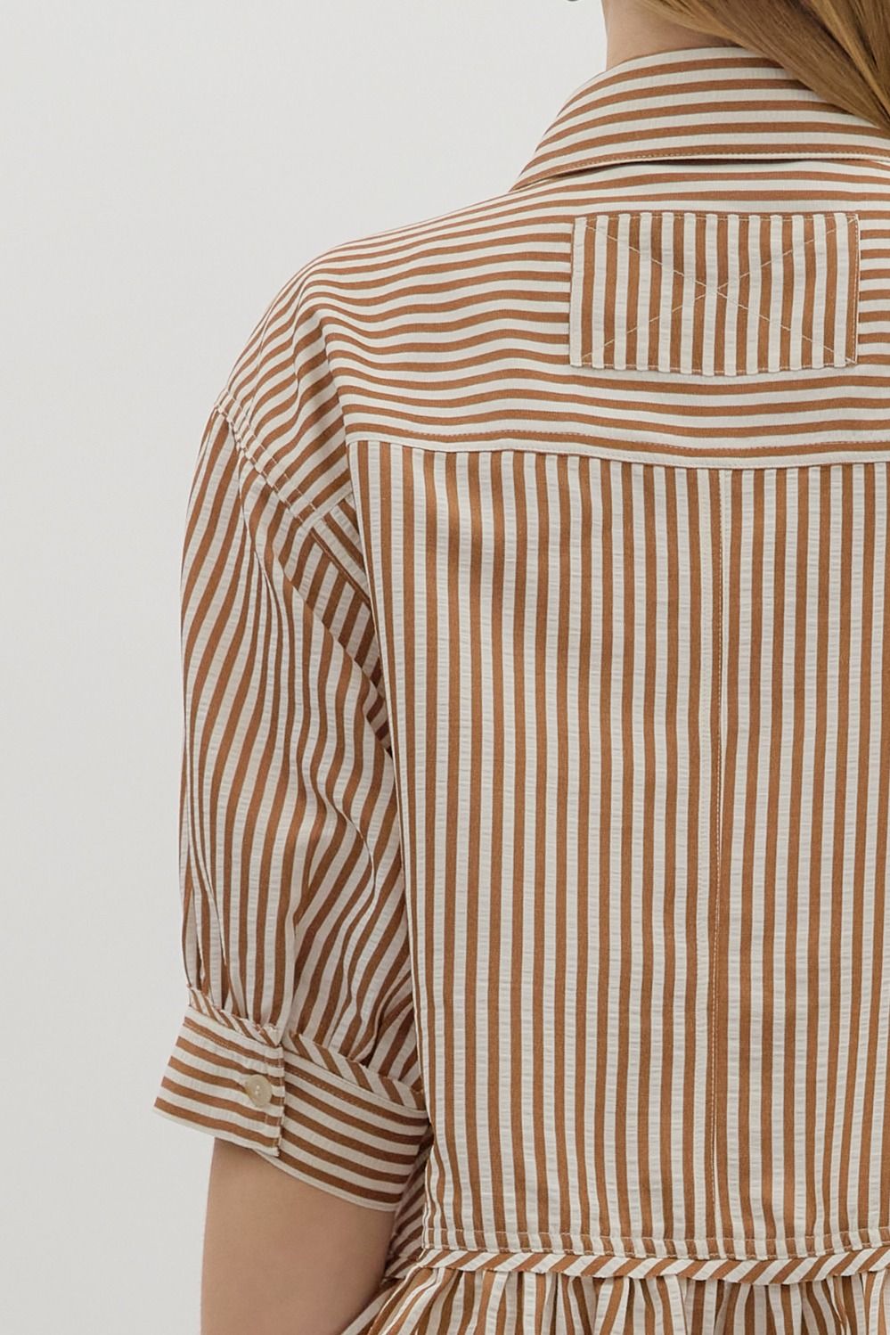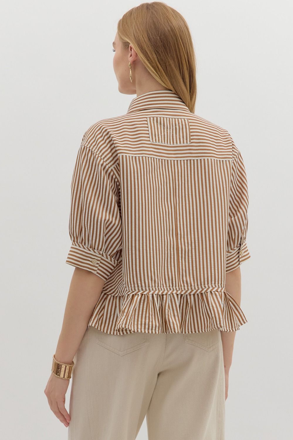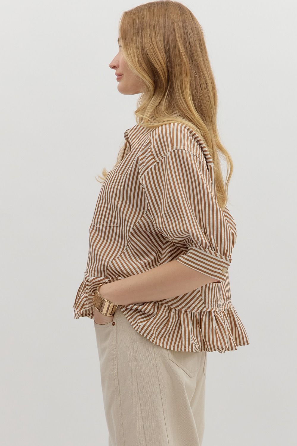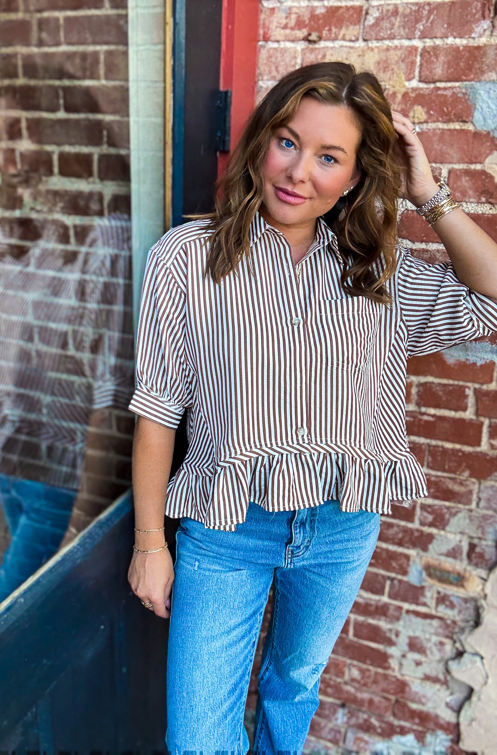 Add a splash of fun to your wardrobe with the Caramel Latte Ruffle Blouse! Featuring a charming stripe pattern cuff band and playful ¾ sleeves, this top flirts with a ruffle hem that dances with every move. The button-front closure adds a touch of classic style, making it perfect for both casual days and coffee dates. Embrace your playful side in this effortlessly chic blouse!