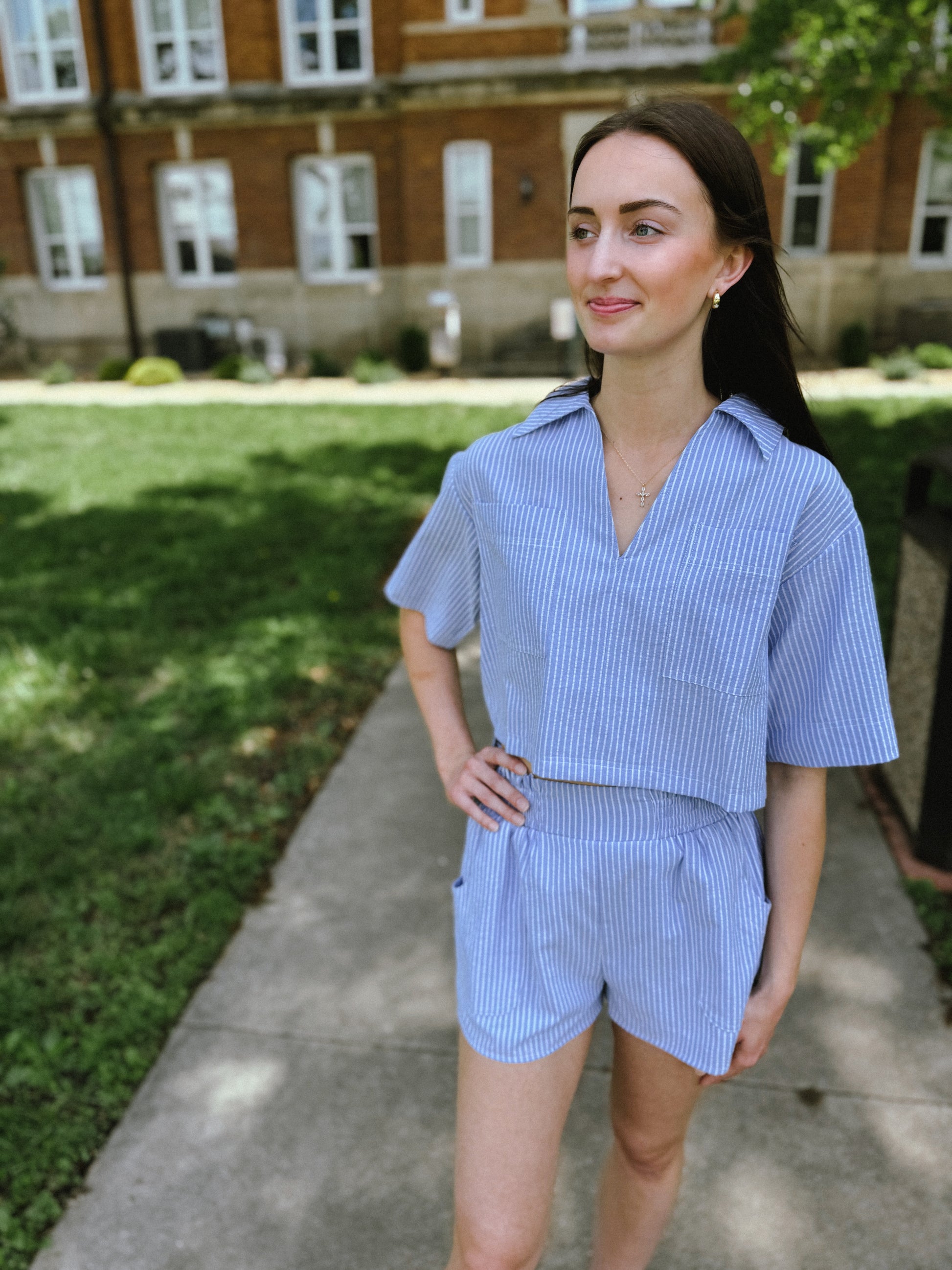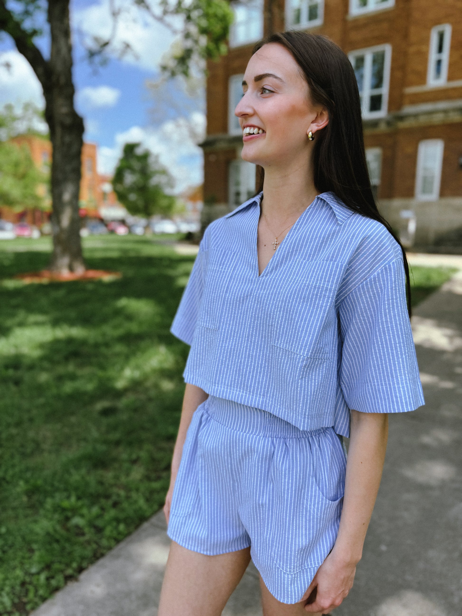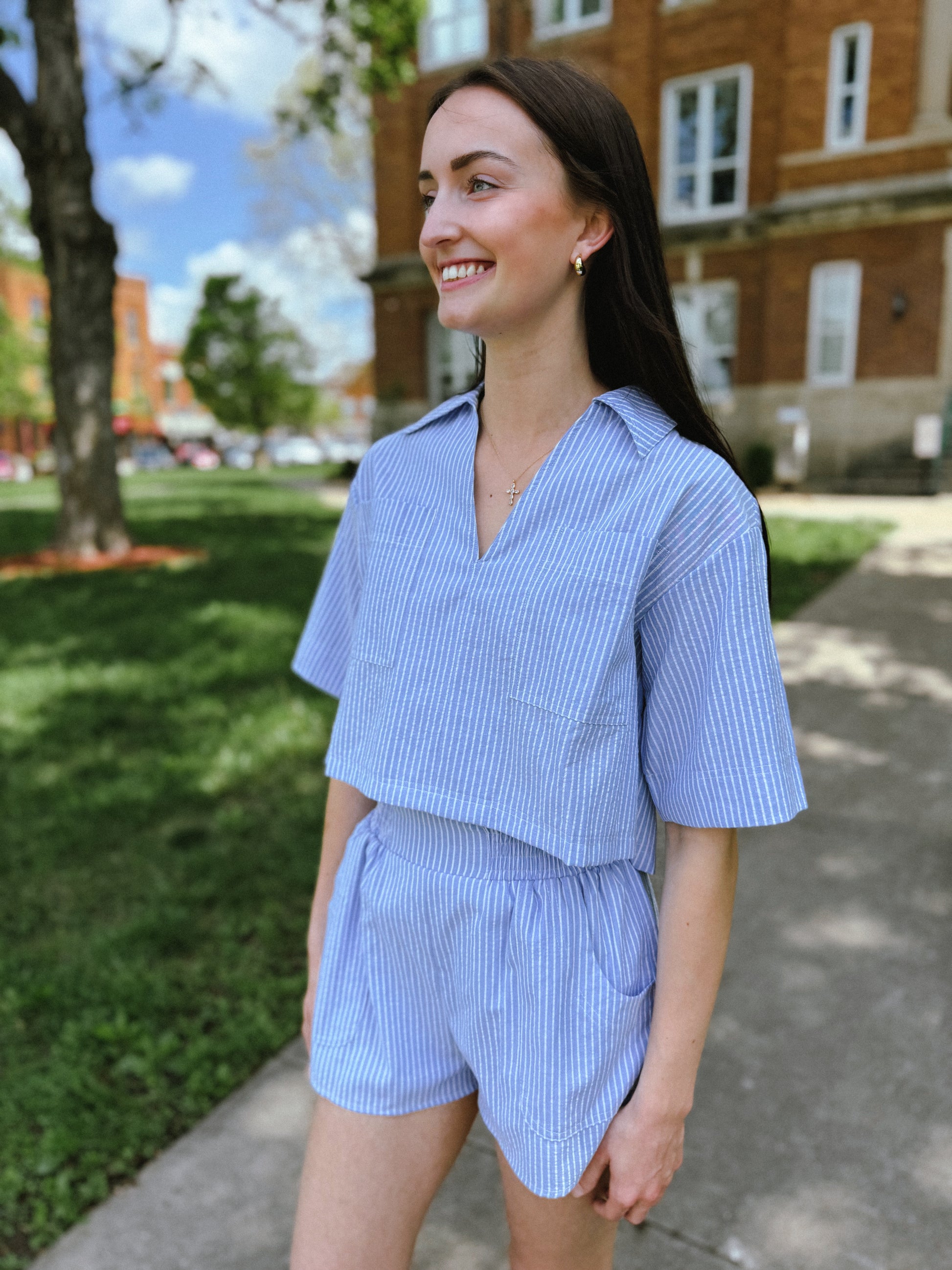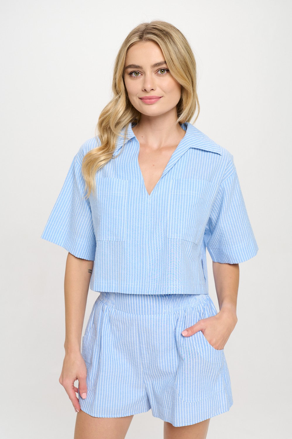 This striped cotton top and short set blends casual polish with coastal ease. Featuring a relaxed, boxy fit and soft collar with a notched neckline, it's designed to keep you cool and stylish. Front patch pockets and short sleeves add function and flair to this breezy, easy-to-style set.
