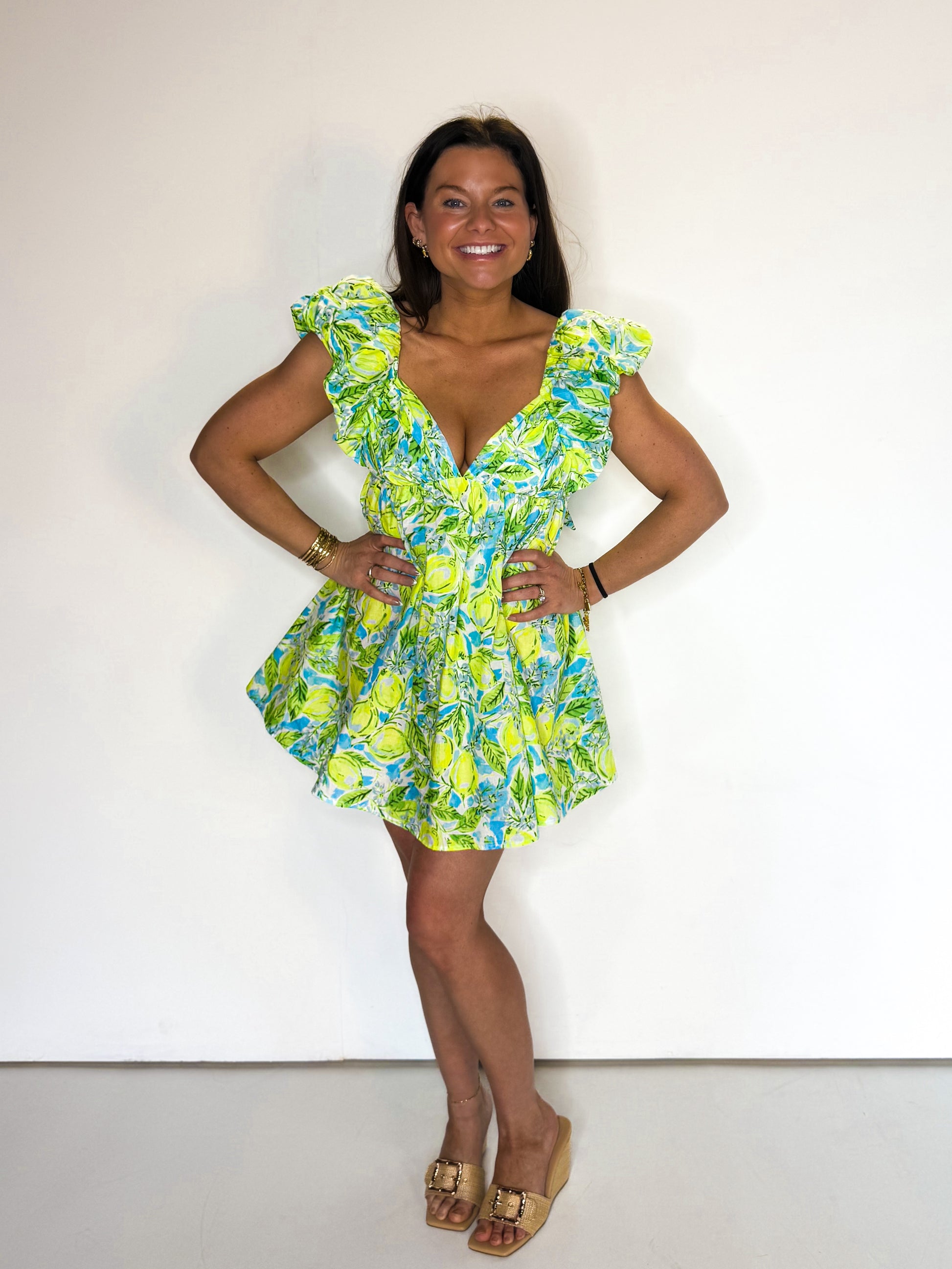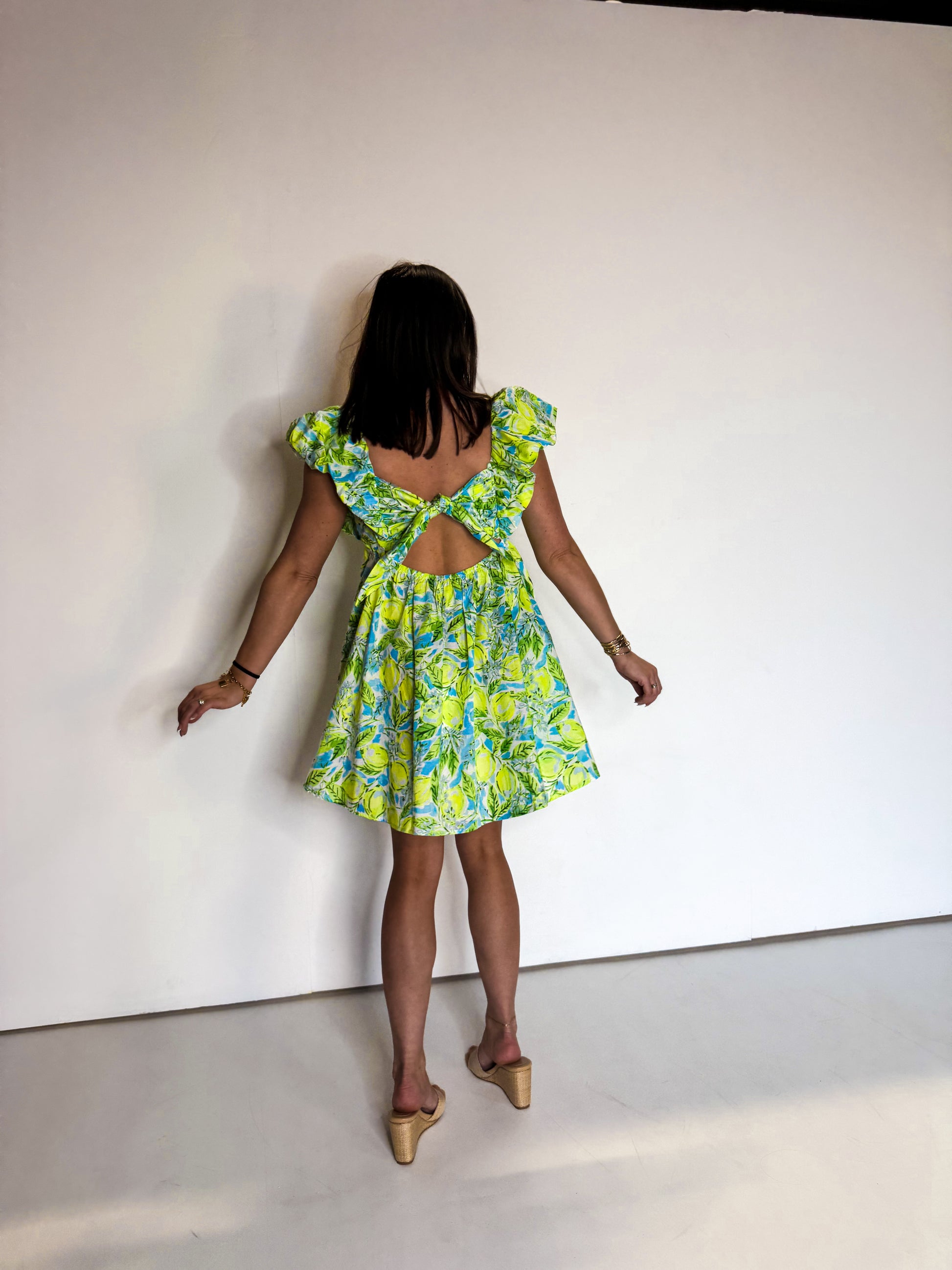 Add a touch of zesty freshness to your wardrobe with our Citrus Splash Mini Dress. Featuring a playful lemon print and vibrant blue and lime colors, it's perfect for a sunny day out. The tie back and ruffle sleeves add a playful and feminine touch. Get ready to turn heads and make a statement with this unique dress!