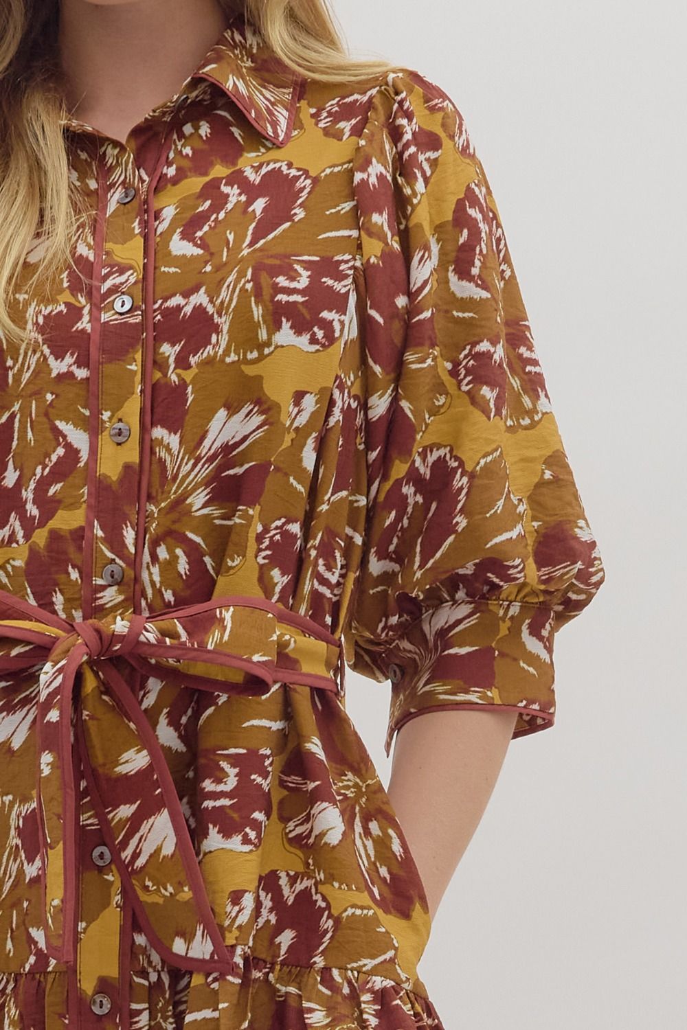 Step into fall with the Elizabeth Taylor Tie Waist Dress, a playful floral mini made for twirling through crisp days. Lightweight and lined for comfort, this woven dress features a flattering self-tie belt and charming contrast binding trim. Buttons down the front add a sweet touch, while side pockets keep essentials close. Its 3/4 sleeves keep you cozy without weighing you down—perfect for layering or wearing solo. Enjoy the ease of style and function in one fun, flirty dress!
