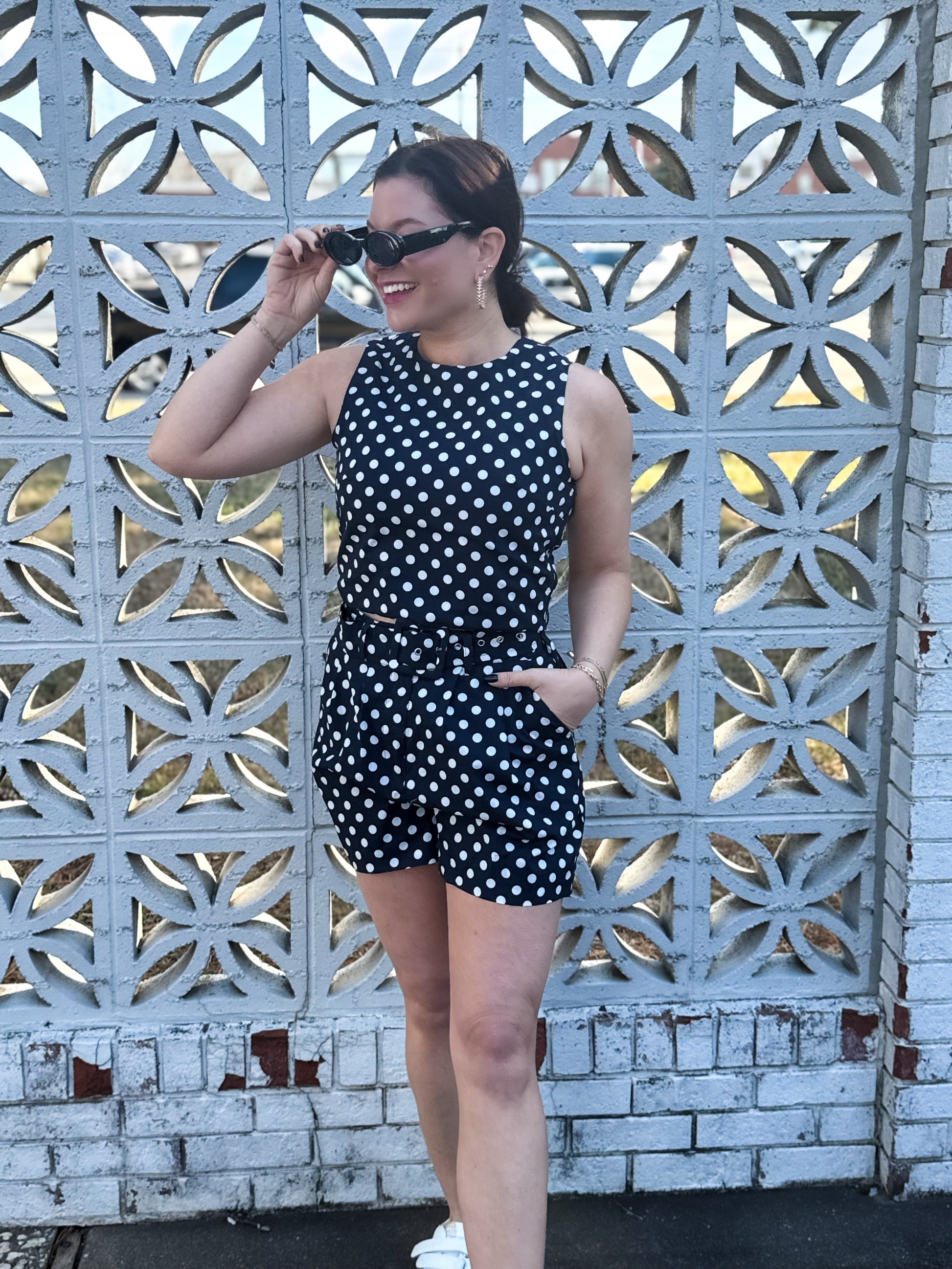 Ellie Navy Polka Dot Crop Top Rock a fun, flirty vibe with this sleeveless crop top featuring classic white polka dots on a rich navy base. Perfect for layering over your favorite bralette or pairing with high-waisted bottoms, this playful piece brings instant personality to any outfit. The cropped silhouette flatters your figure while the timeless polka dot pattern keeps things fresh and fashion-forward. Whether you're heading to brunch or a night out, this versatile top is your new go-to for effortless style.
