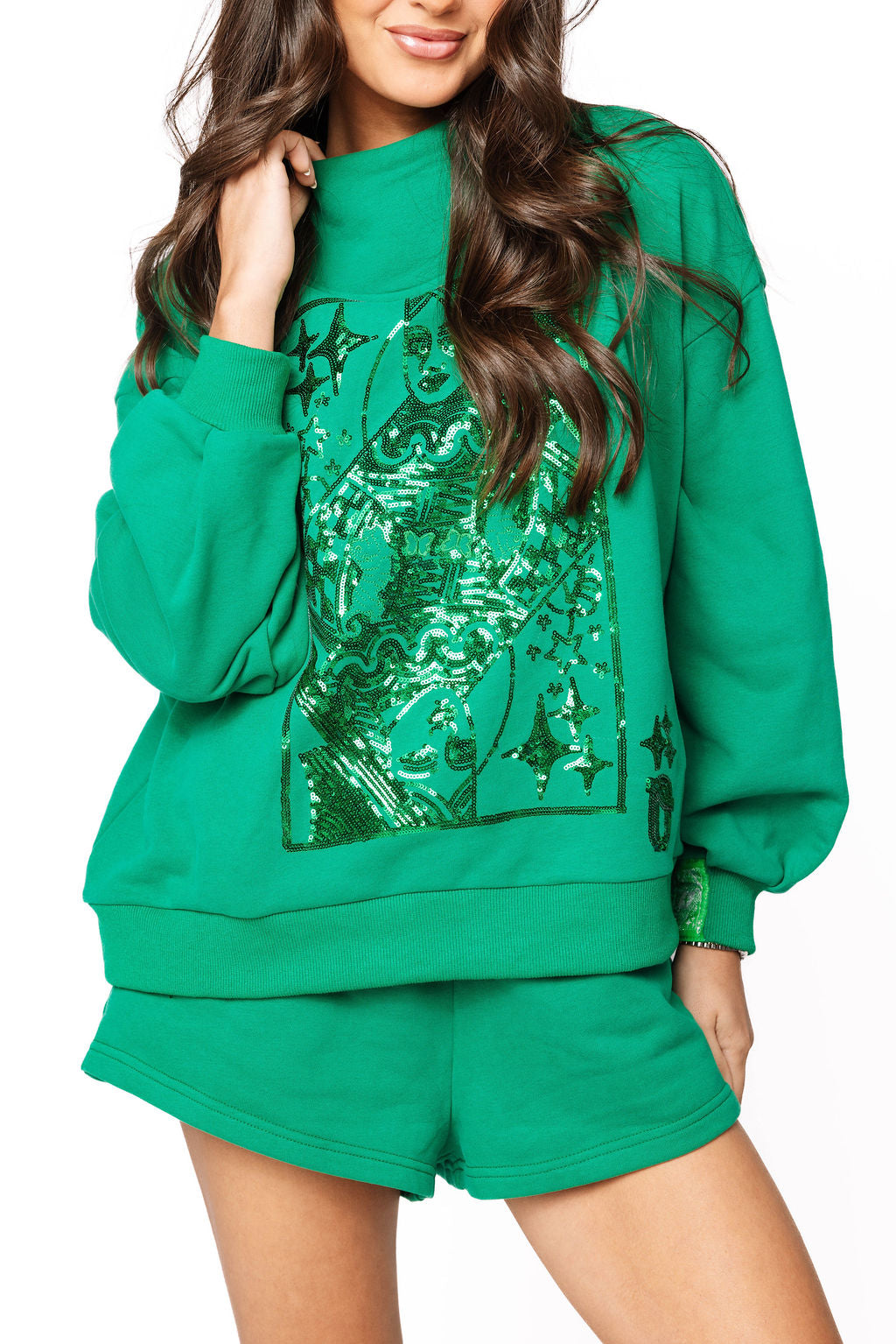 Turn heads in the emerald green Queen of Sparkles mockneck sweatshirt! Adorned with a sequin Queen of Clubs design, this sweatshirt is both cozy and eye-catching. Pair it with the matching sparkle shorts for a luxe winter statement or wear solo for casual glam.