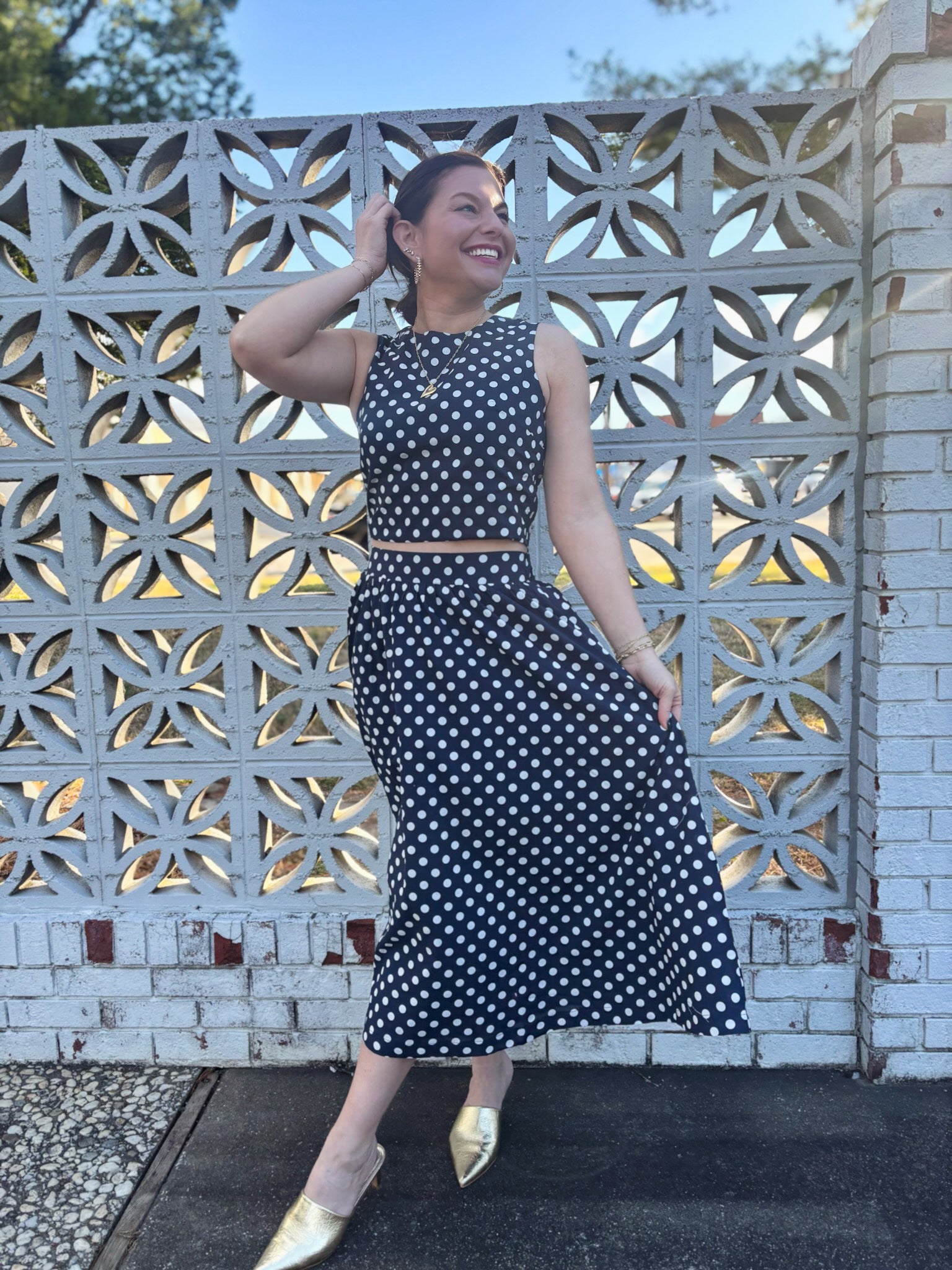 Twirl into your day with the Erica Navy Polka Dot Midi Skirt—a playful wardrobe essential that checks all the boxes. Crafted from 100% cotton for breathable comfort, this midi beauty features charming polka dots on a classic navy base. Best part? Functional pockets mean you can finally ditch the bag (or at least have somewhere to stash your essentials). Perfect for everything from casual outings to weekend adventures.