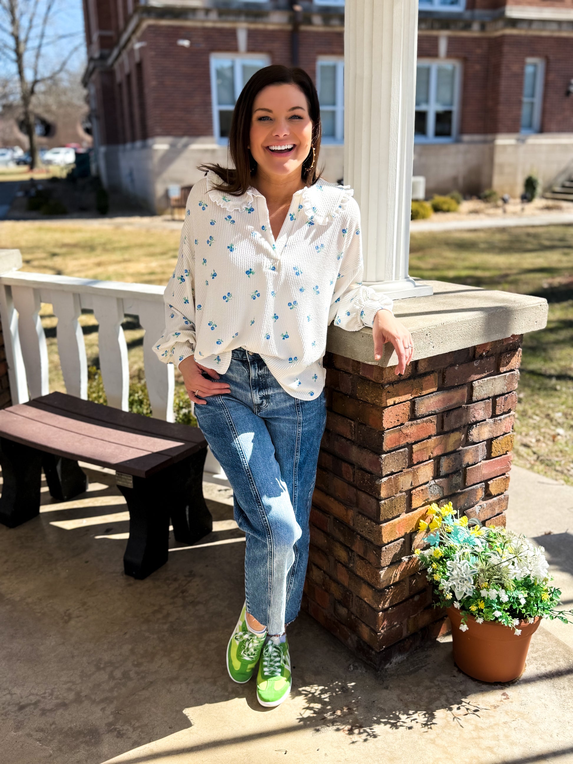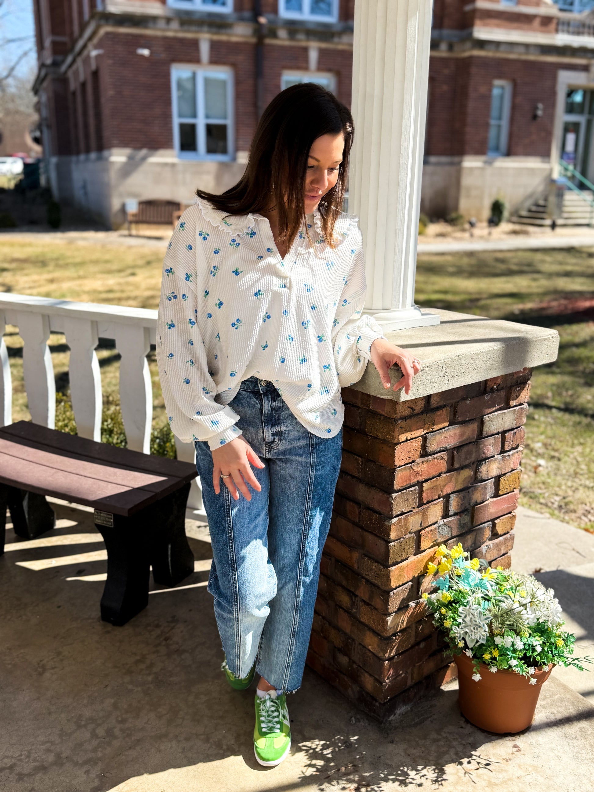 Unleash your playful side with our Floral Baby Doll Collared Top. This ribbed, knit top features a charming floral print, a flirty ruffle collar, and long balloon sleeves that add a touch of whimsy to any outfit.
