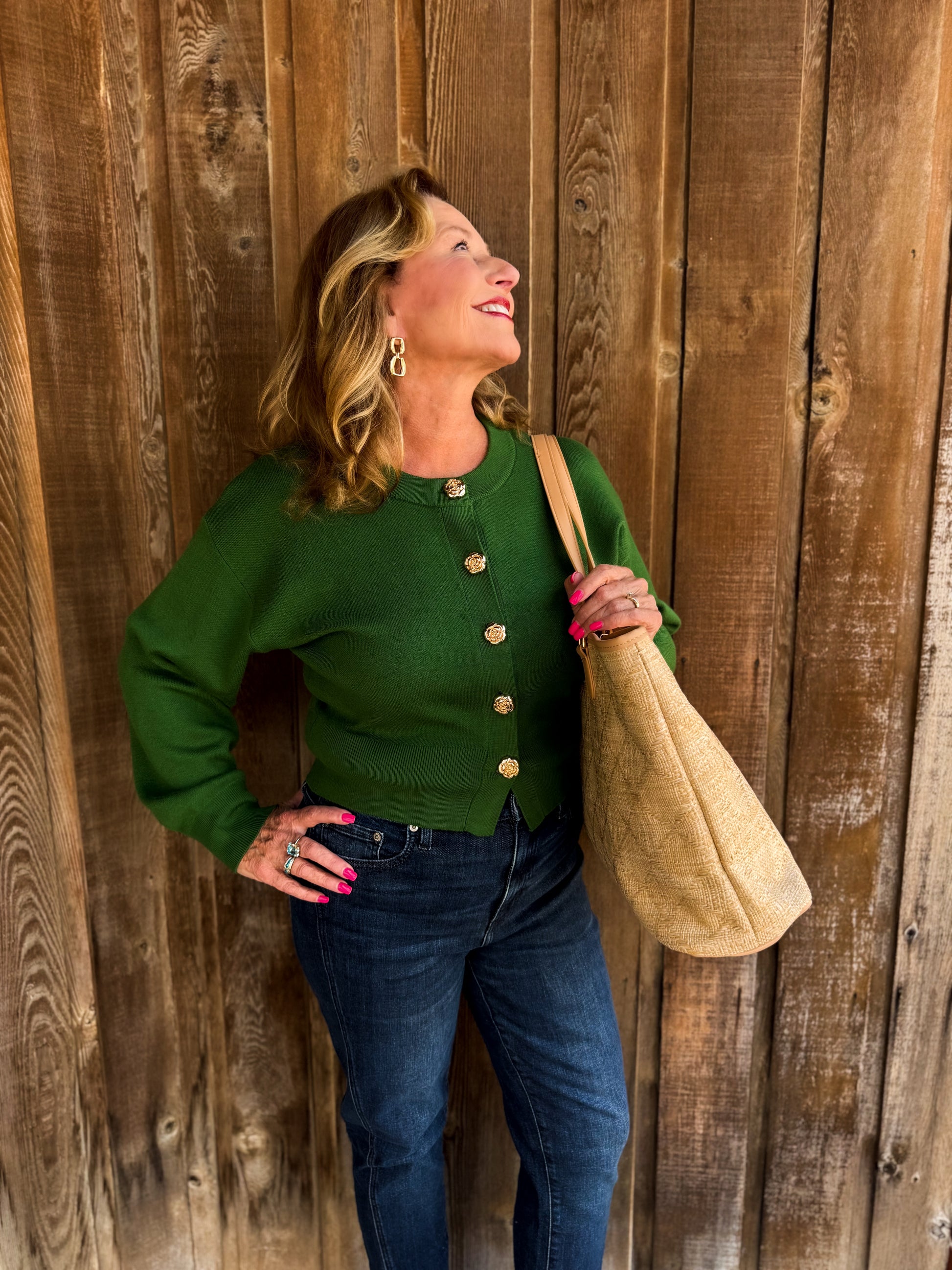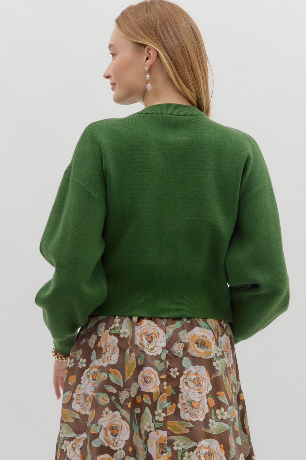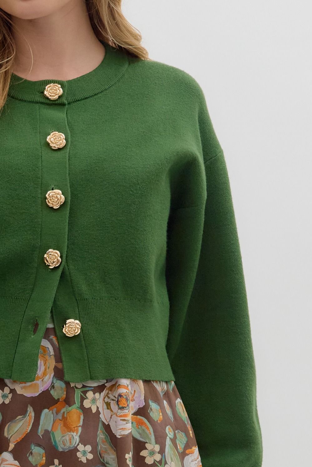Cozy up in the Forest Femme Cardigan, a playful twist on your classic sweater. This cropped cardigan features long sleeves and a soft knit fabric that feels like a warm hug. The gold accent buttons add a touch of sparkle, making it perfect for layering or wearing solo on cooler days. Elevate your look with this charming and comfy staple!