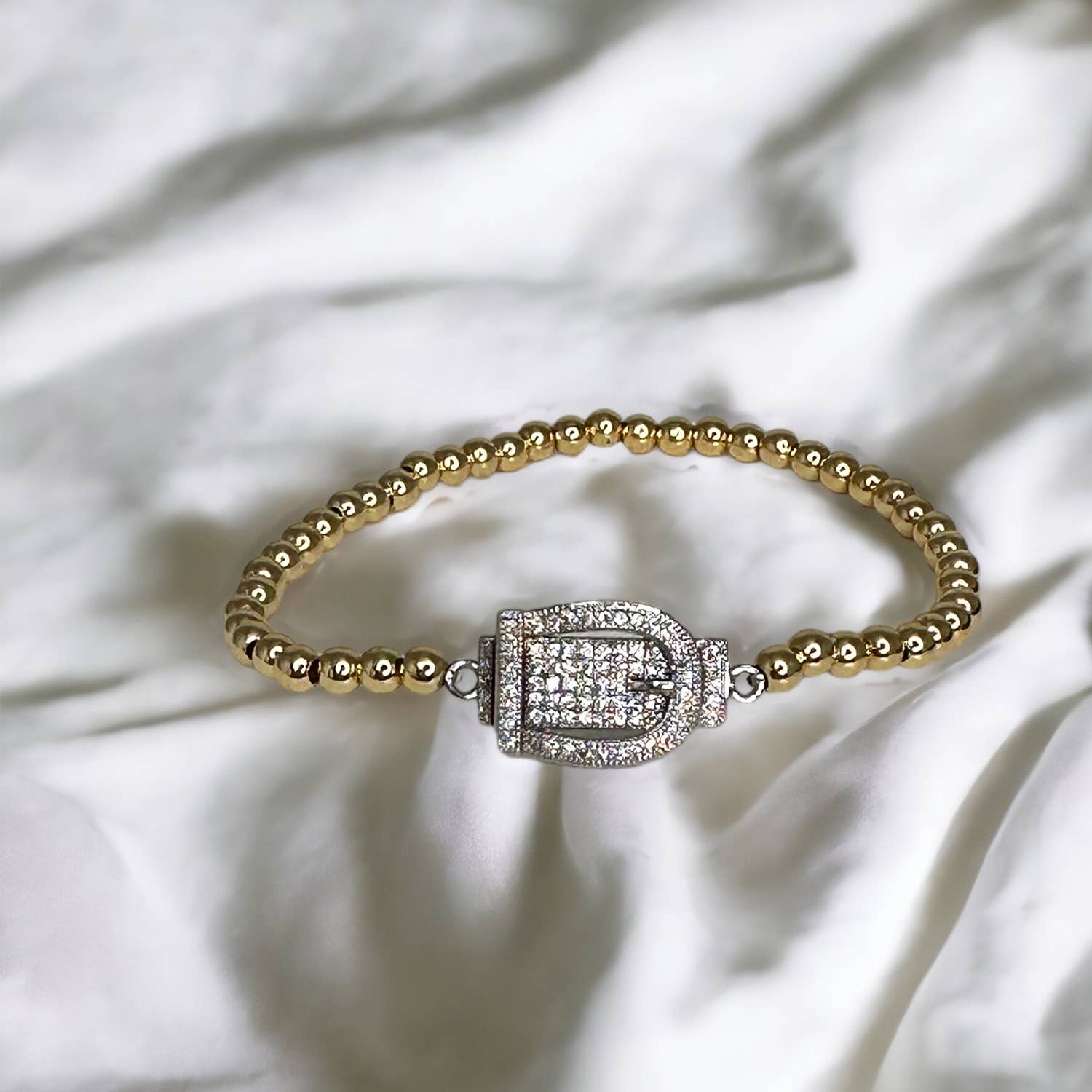 Wrap your wrist in pure bling with this stylish Adorable Buckle Bracelet, featuring 4mm brass beads and a glamorous buckle with dazzling pave crystals for the perfect hint of sparkle. Show off your wrist, sass, and wow factor in one dazzling piece! Measuring 6.85".