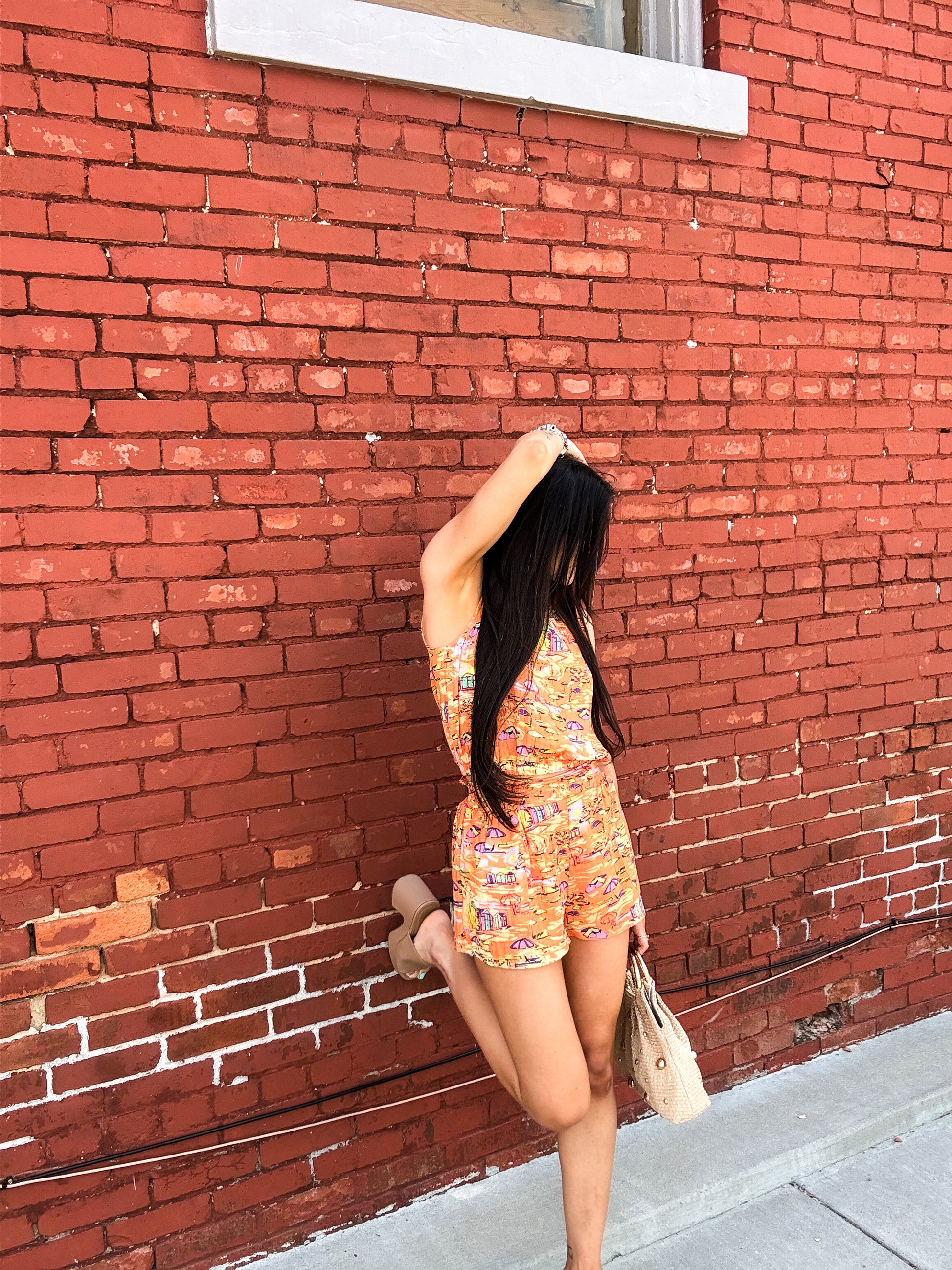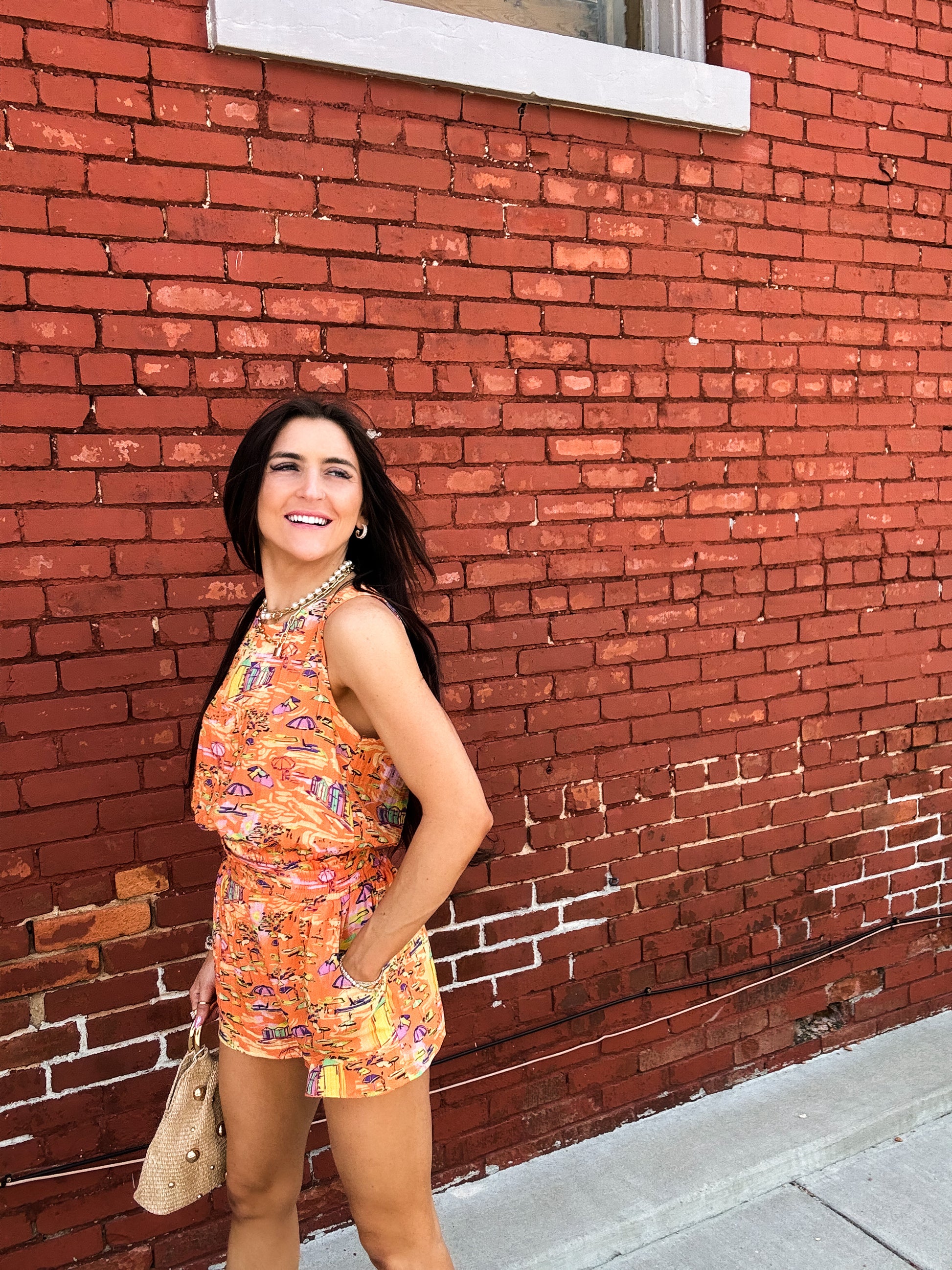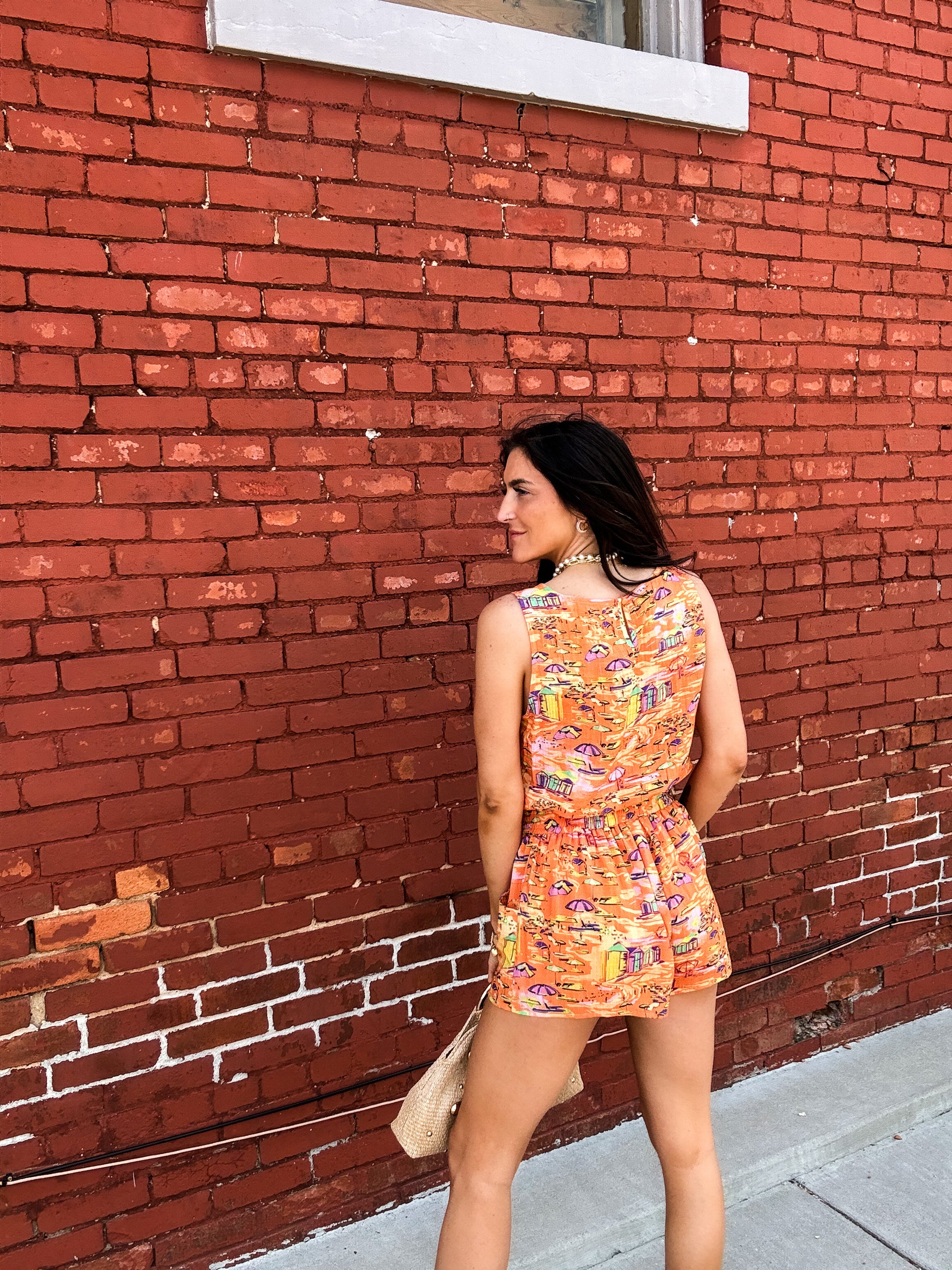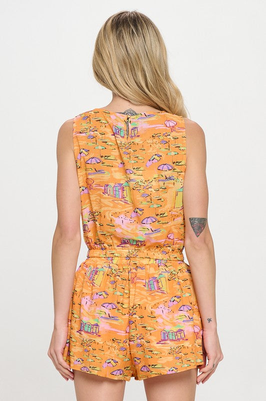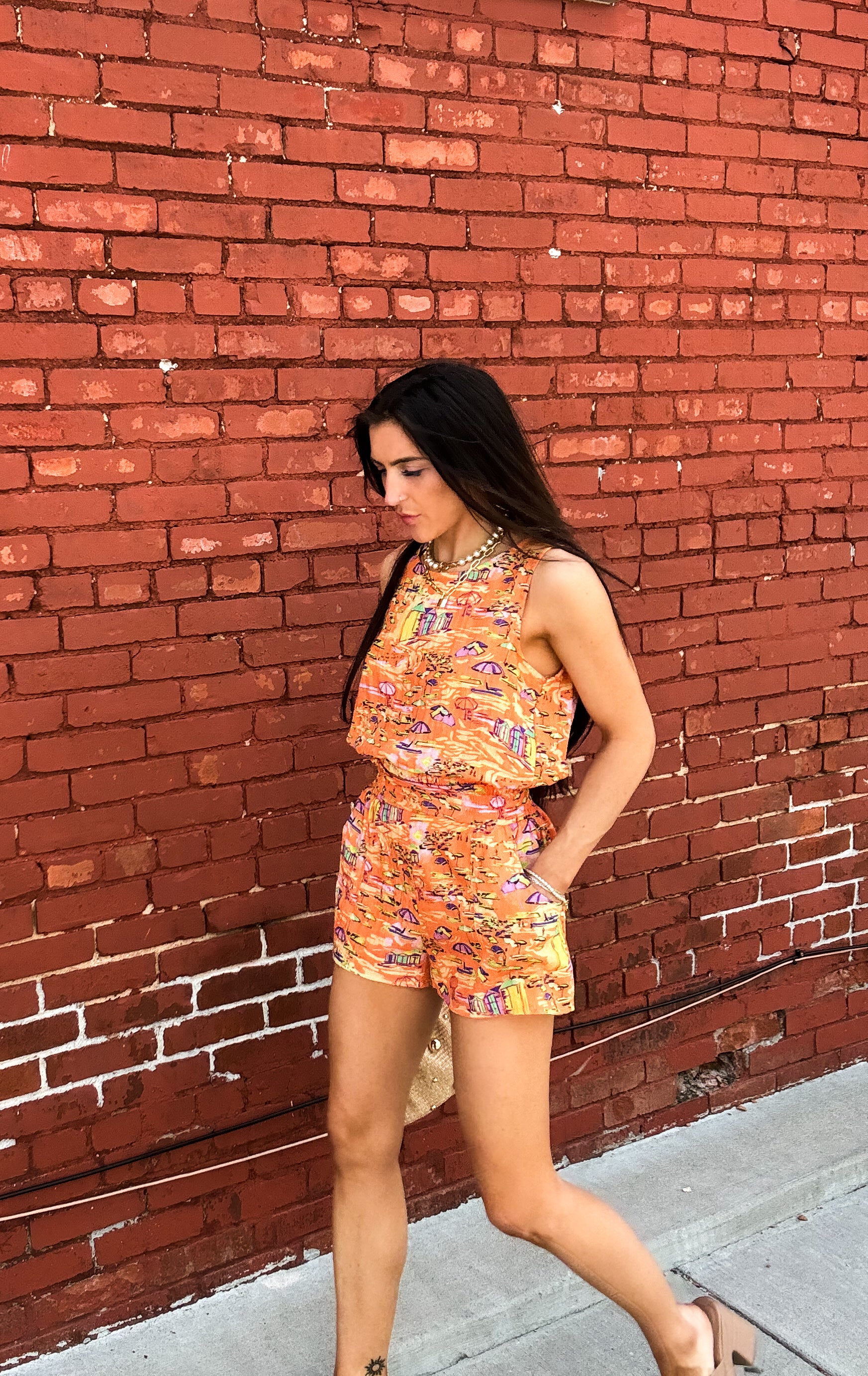 The Golden Shoreline Set features a sleeveless round-neck tank top and coordinating high-waisted shorts in a vibrant beachscape print on lightweight woven rayon. The top offers a relaxed fit while the shorts feature an elastic waistband and side pockets for comfort and functionality. Perfect for resort, coastal, and summer collections, this set delivers effortless vacation style in a standout print.