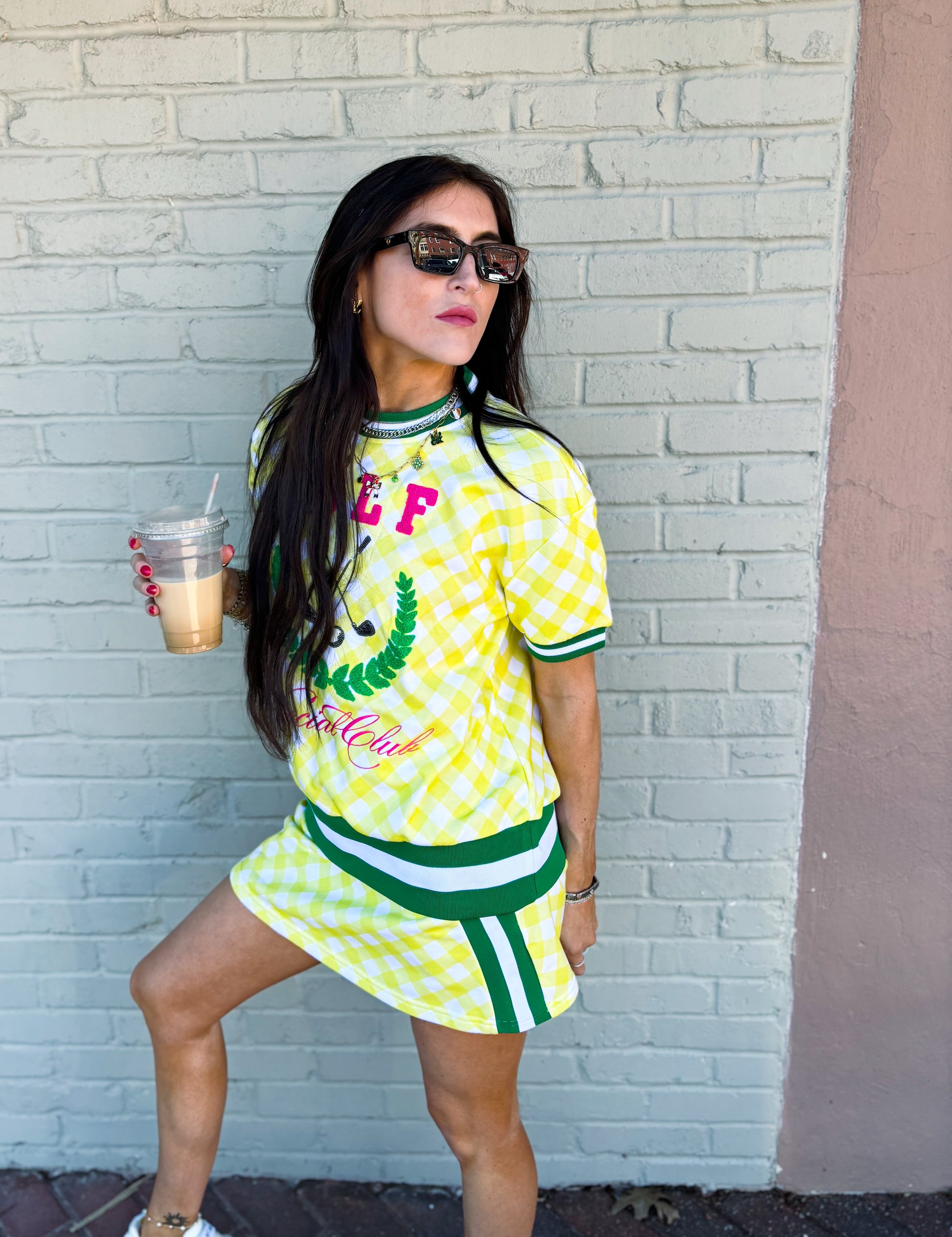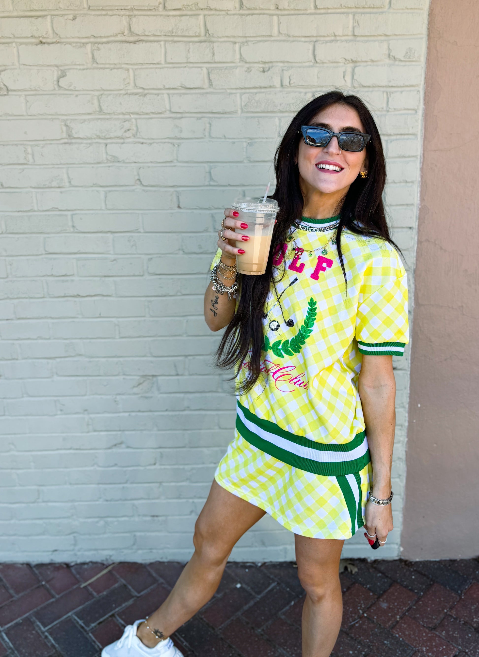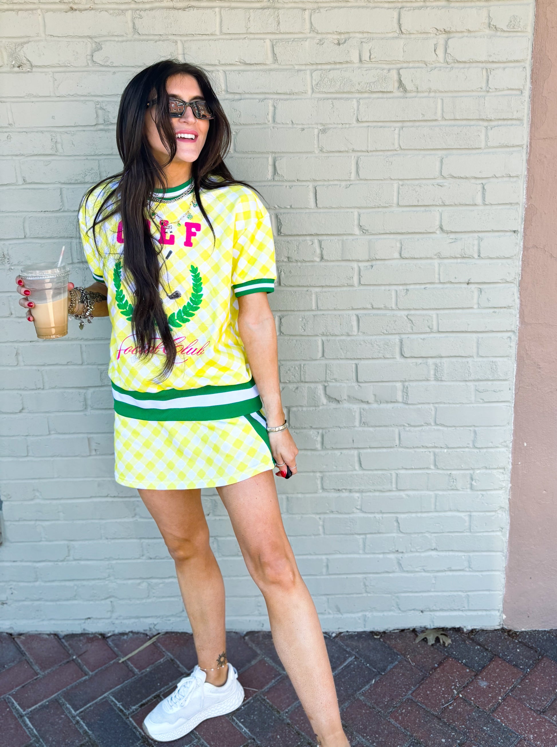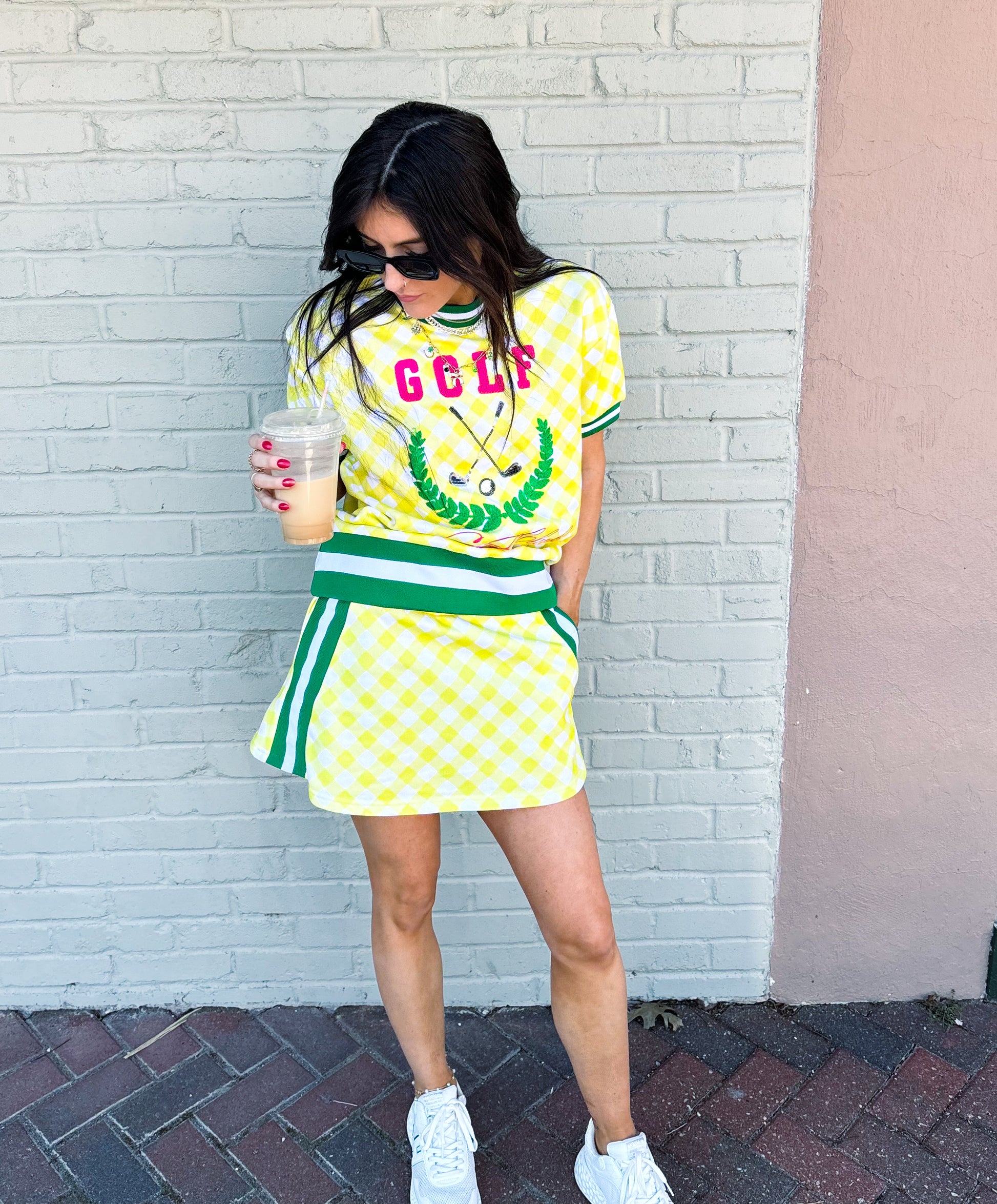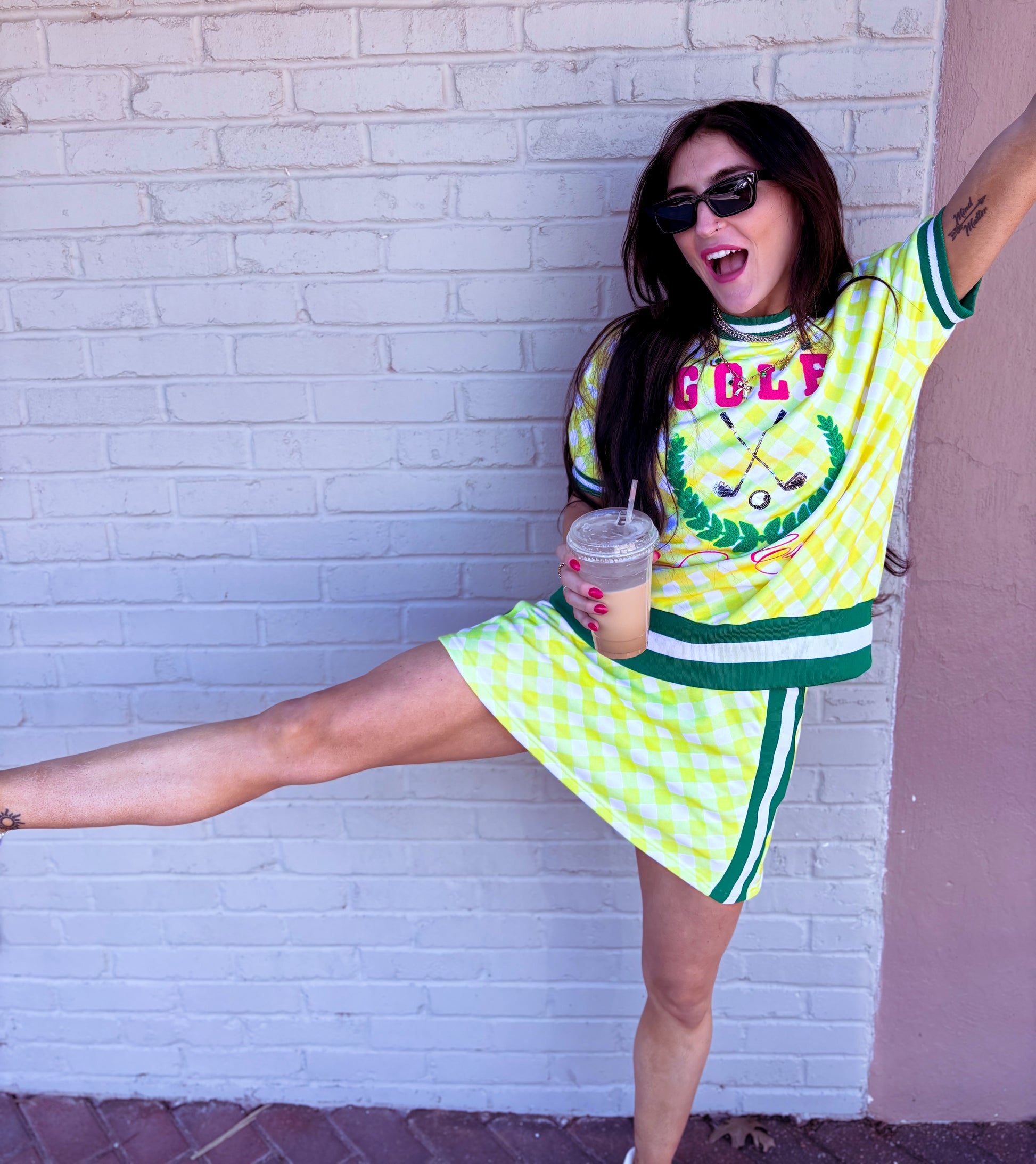 - Skirt features green athletic shorts attached underneath, elastic waistband, and pockets