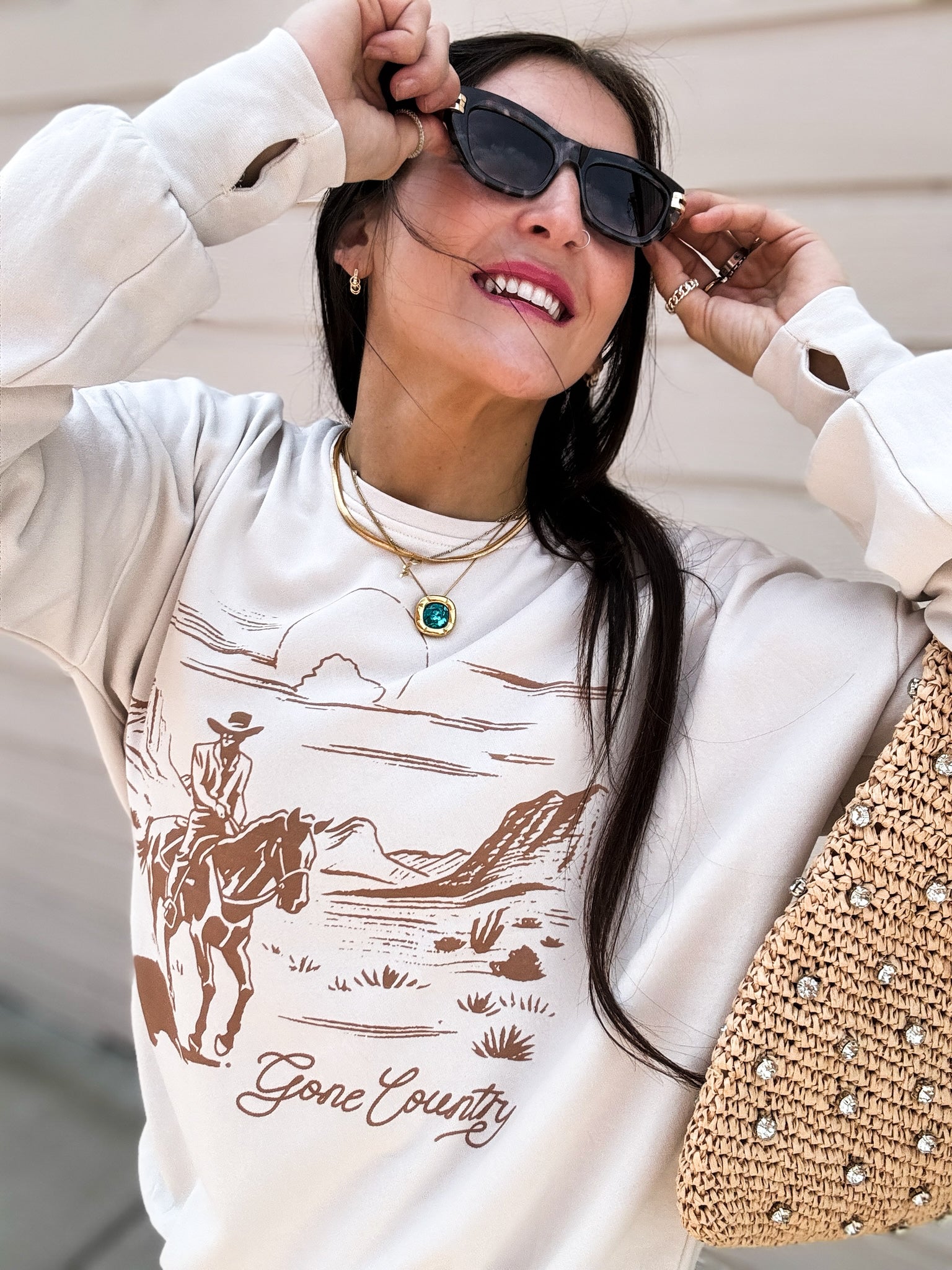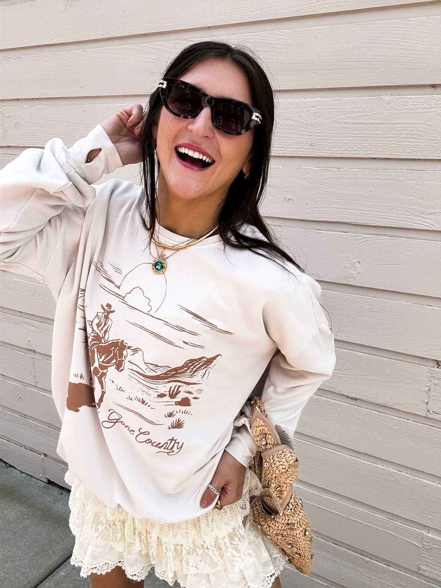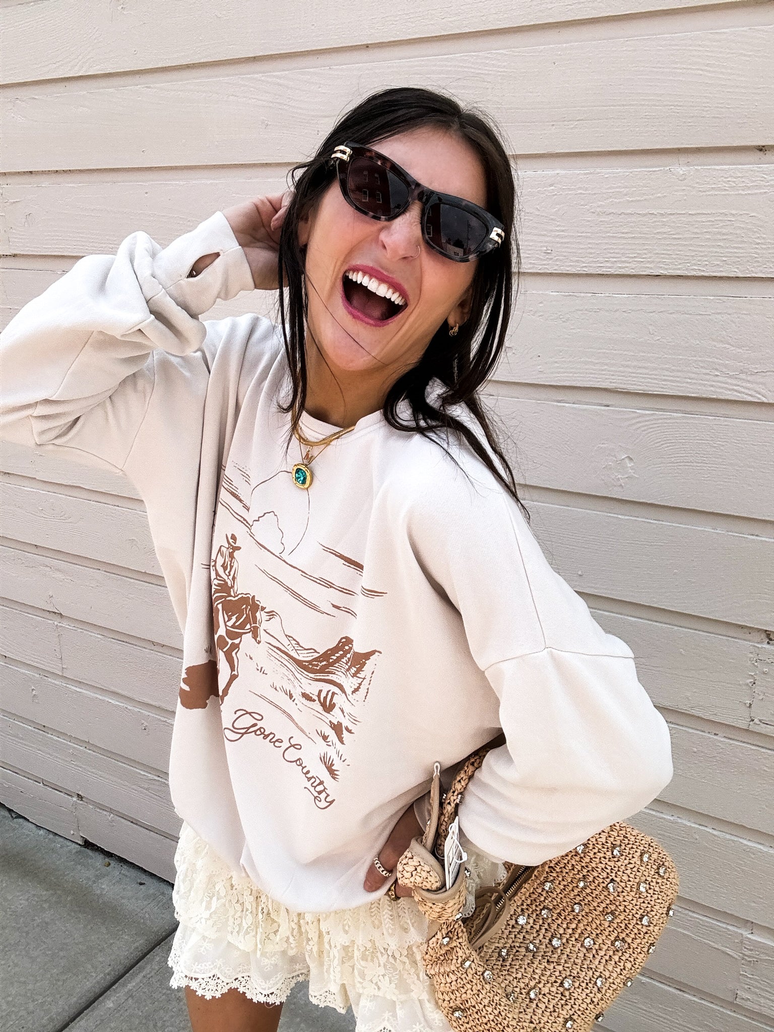 Cozy up in the oversized Gone Country Sweatshirt from The Laundry Room. Featuring a fun country-inspired graphic, this sweatshirt brings laid-back charm and extra comfort to your casual wardrobe. Perfect for relaxing days or weekend adventures, it’s your new go-to for effortless style with a playful twist.