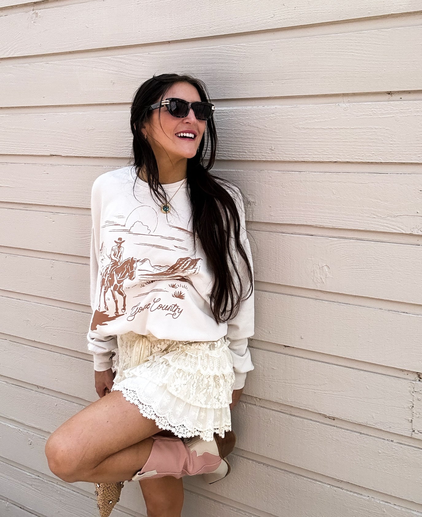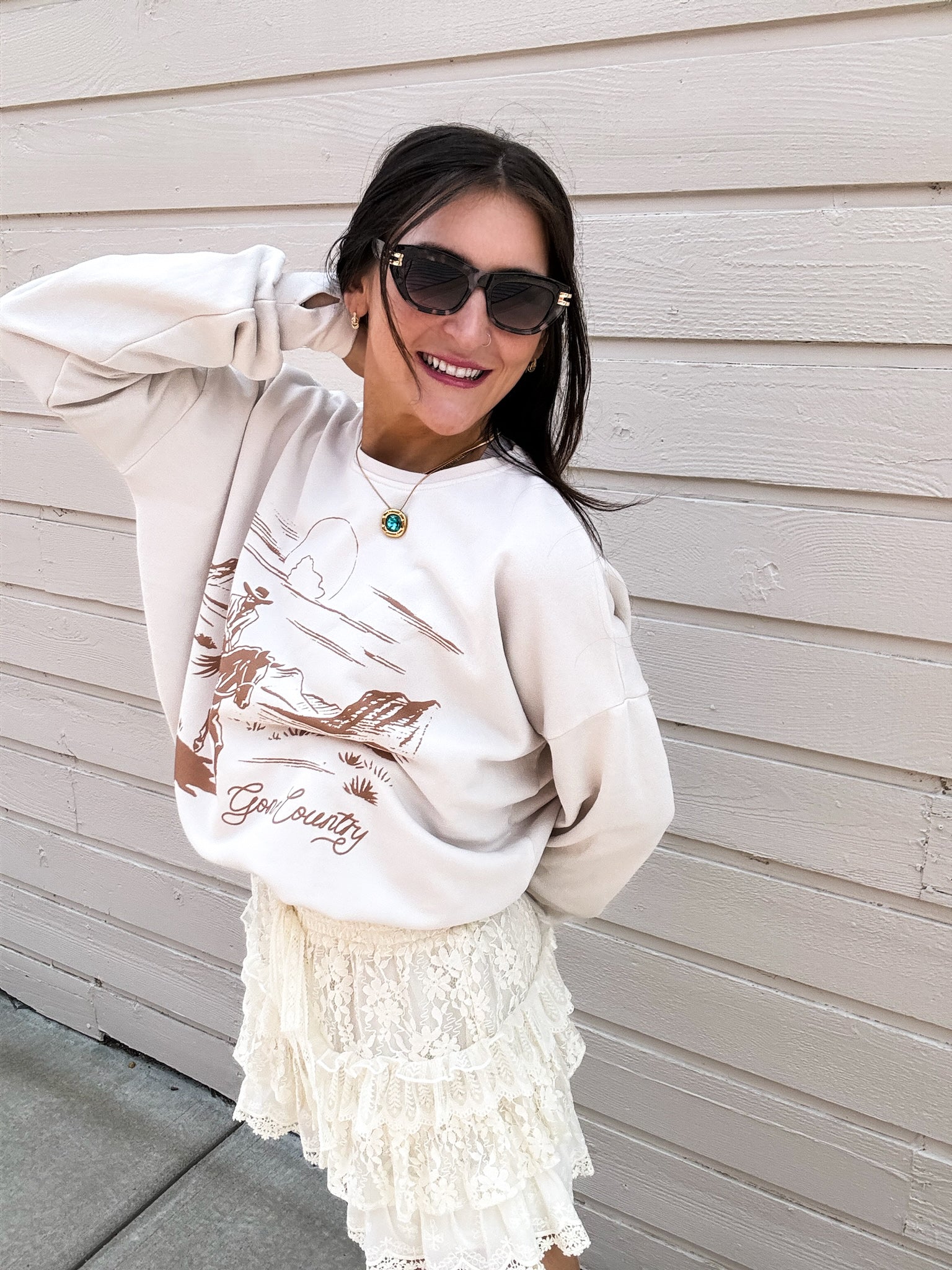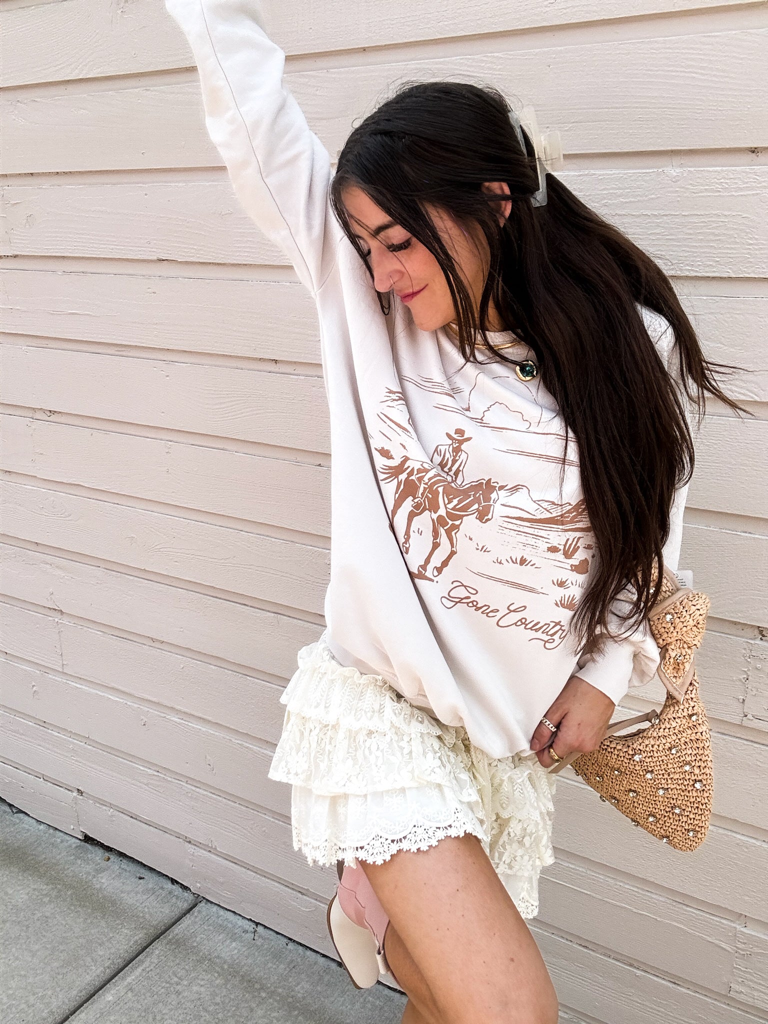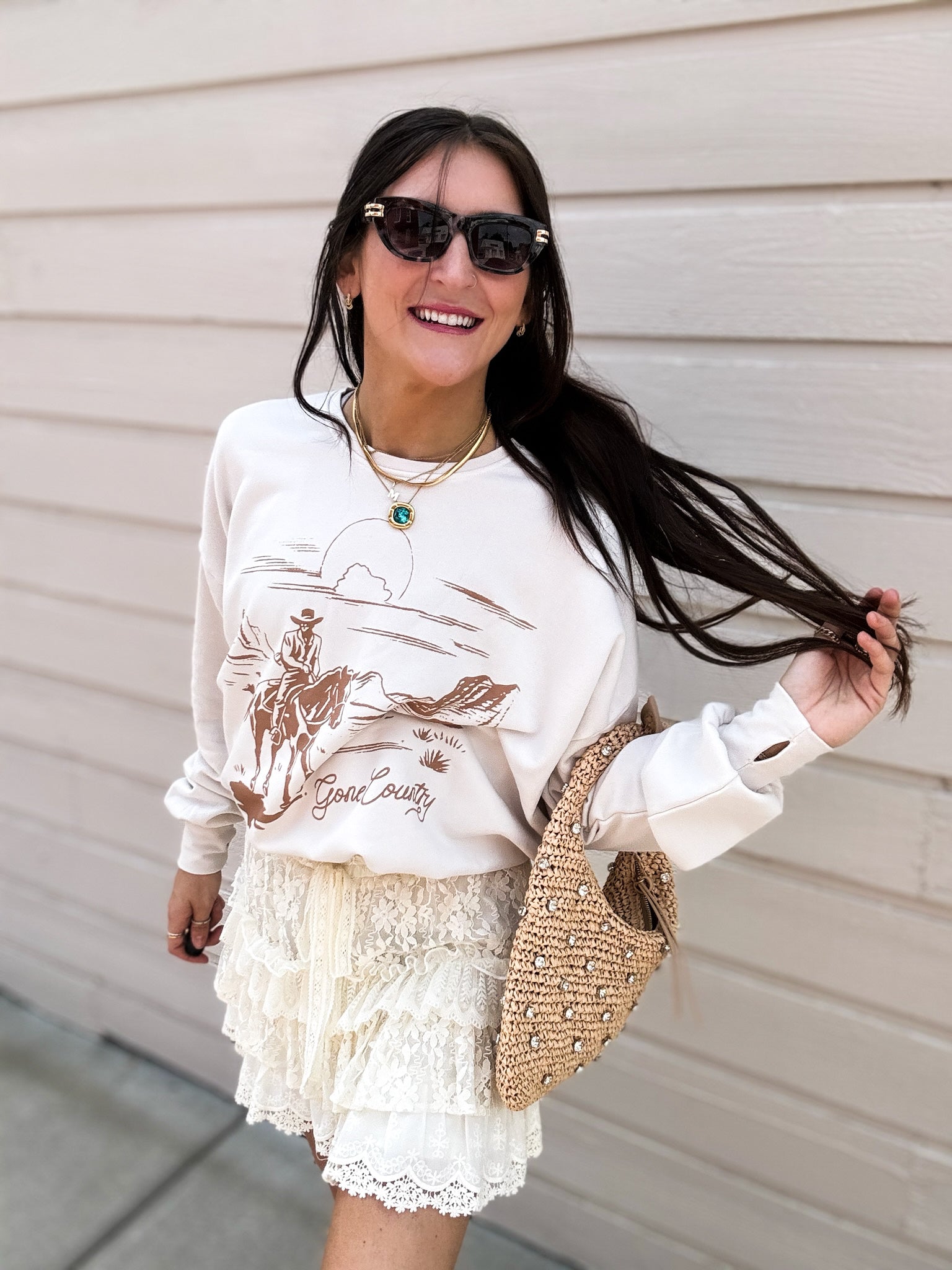 Cozy up in the oversized Gone Country Sweatshirt from The Laundry Room. Featuring a fun country-inspired graphic, this sweatshirt brings laid-back charm and extra comfort to your casual wardrobe. Perfect for relaxing days or weekend adventures, it’s your new go-to for effortless style with a playful twist.