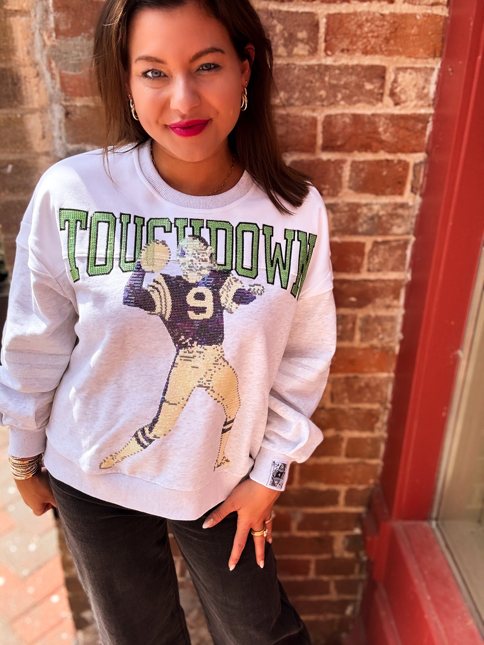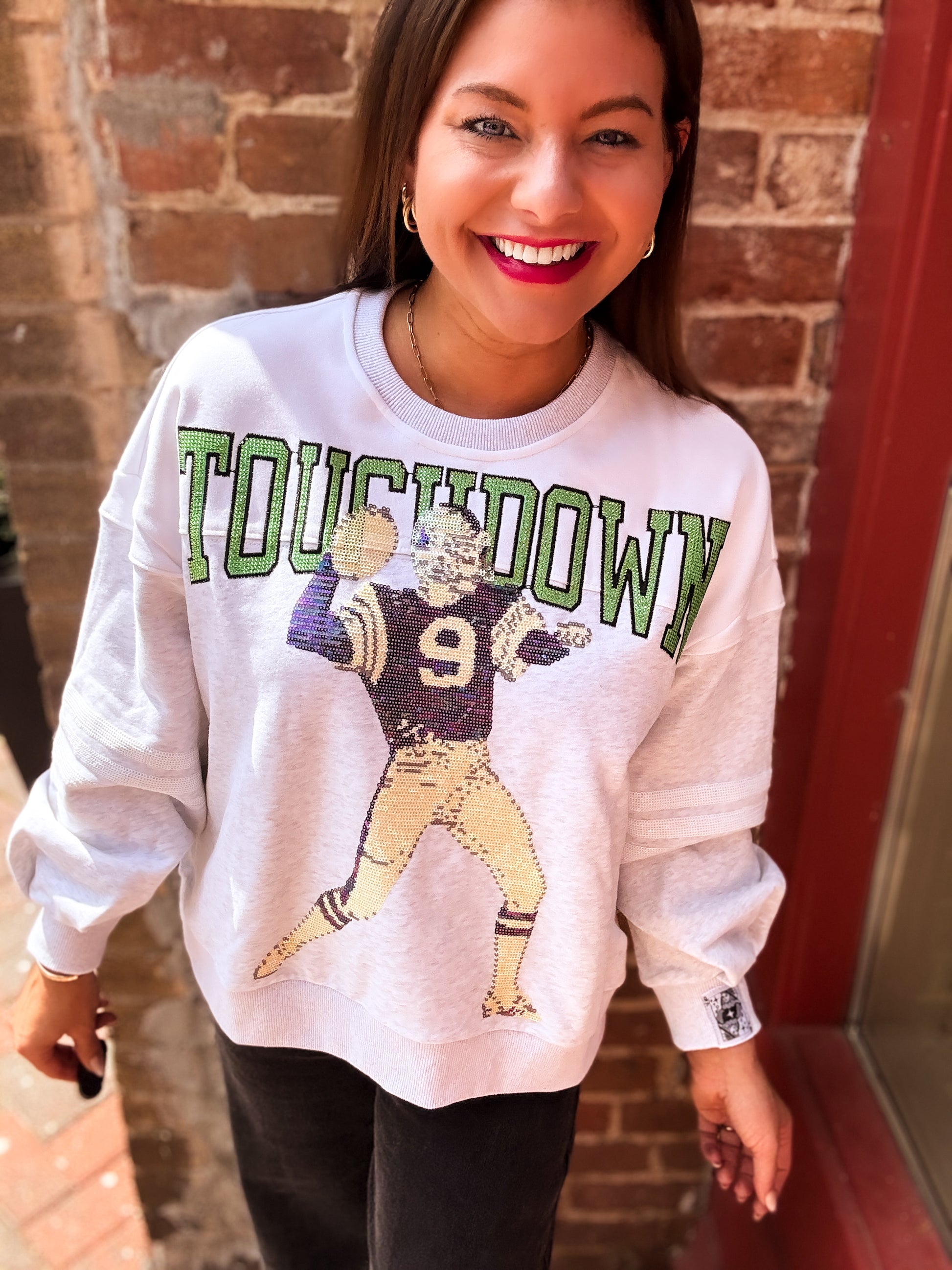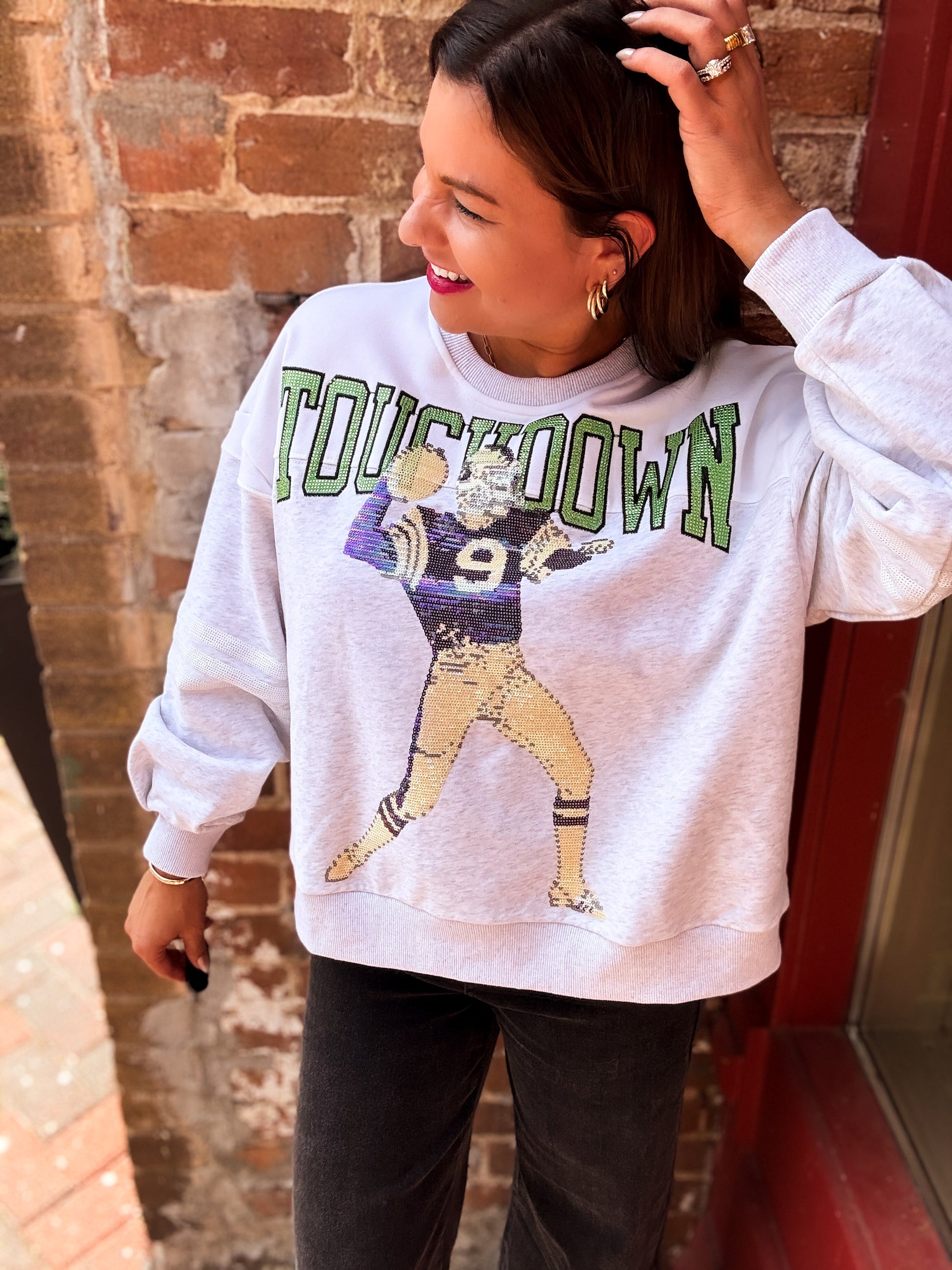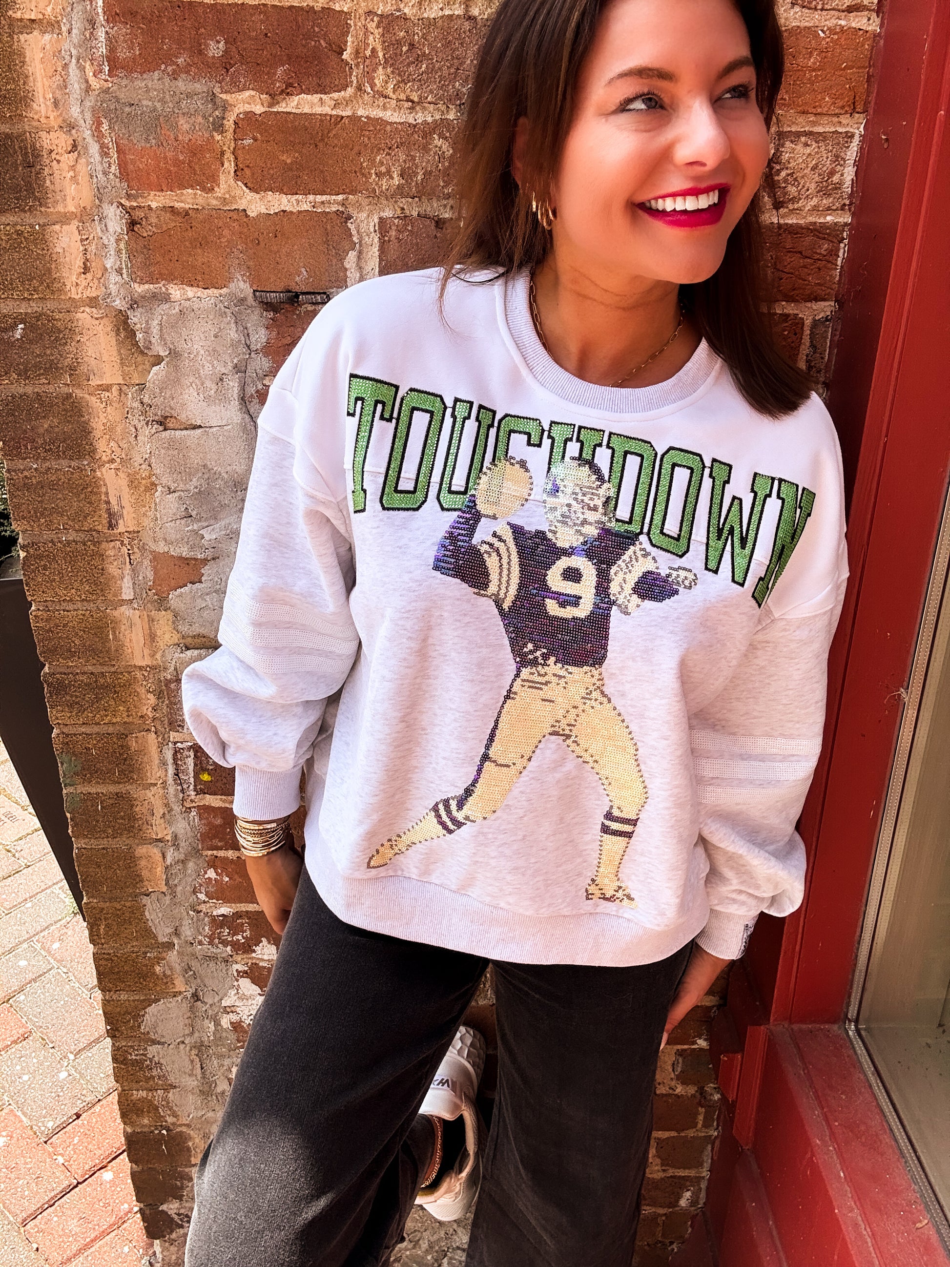 Show off your sporty sparkle with this Grey Touchdown Football Player Sweatshirt from Queen of Sparkles. Featuring a fun sequined football player graphic and eye-catching sequined varsity stripes on the sleeves, it’s perfect for game day or casual wear. Comfortable and playful, this sweatshirt adds a touch of glam to your athletic style.