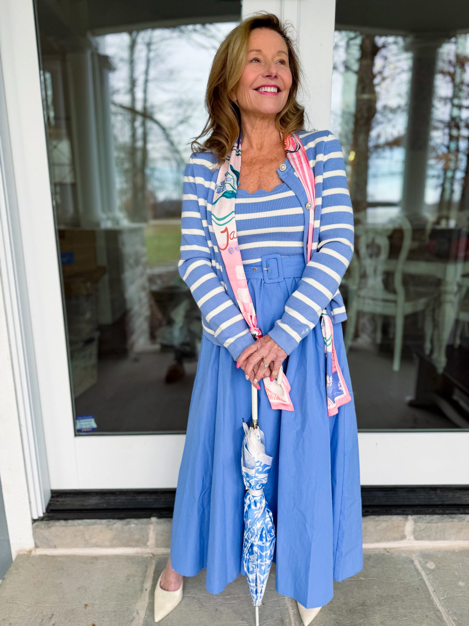 Layer up in style with the Kennedy Cardigan in Spa Blue. This striped knit beauty features lustrous pearl buttons that add a touch of elegance to your everyday look. Perfect for throwing over your favorite tee or dress, it's the cozy companion that makes getting dressed feel like playtime. Soft, versatile, and undeniably chic—your new go-to piece awaits.