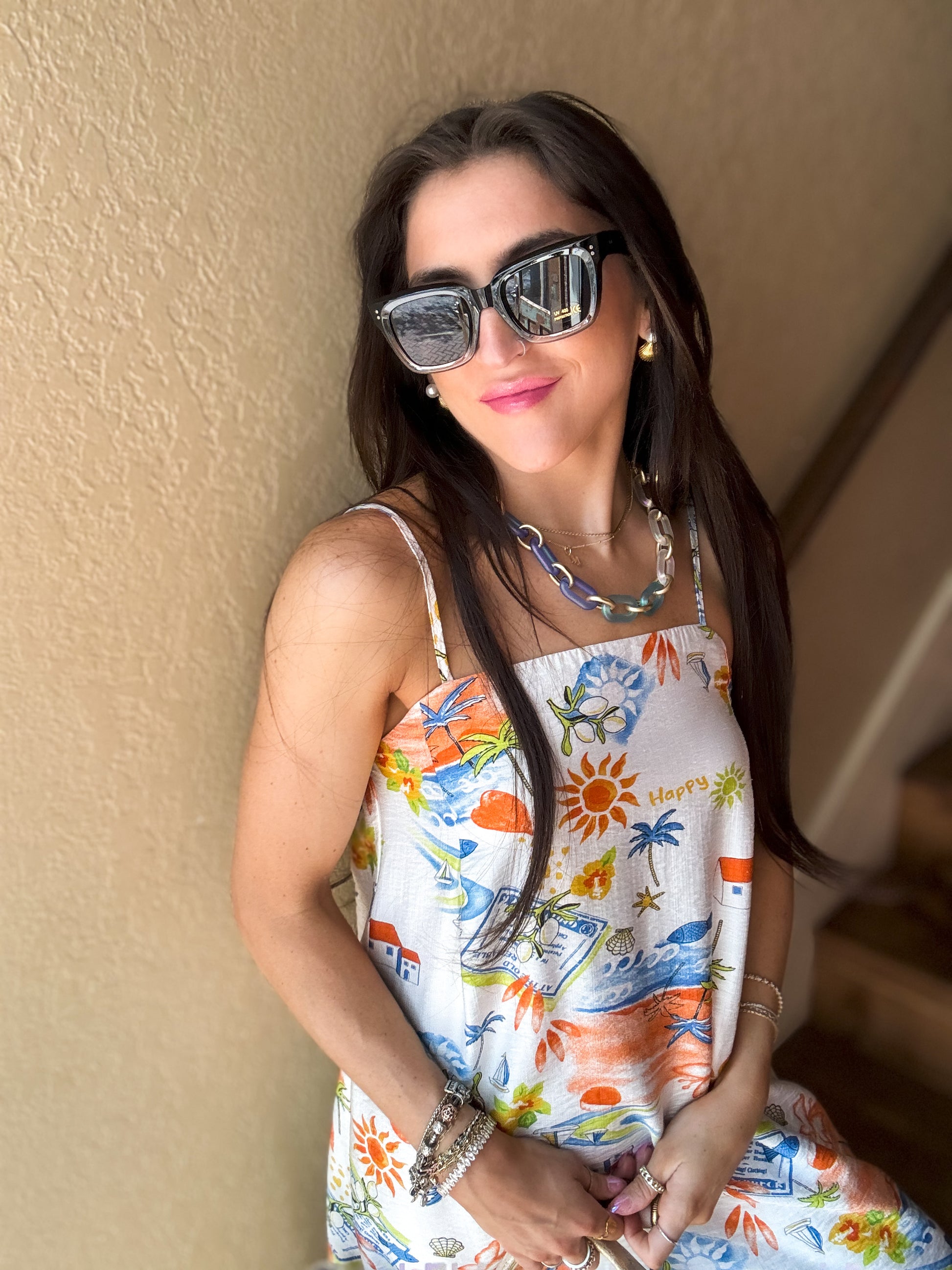 The Mediterranean Daydream Cami Dress features a breezy coastal print on lightweight woven rayon, designed for effortless summer styling. This dress includes adjustable spaghetti straps, a straight neckline, and an easy A-line silhouette for comfortable wear. Its vivid resort-inspired pattern makes it ideal for vacations!