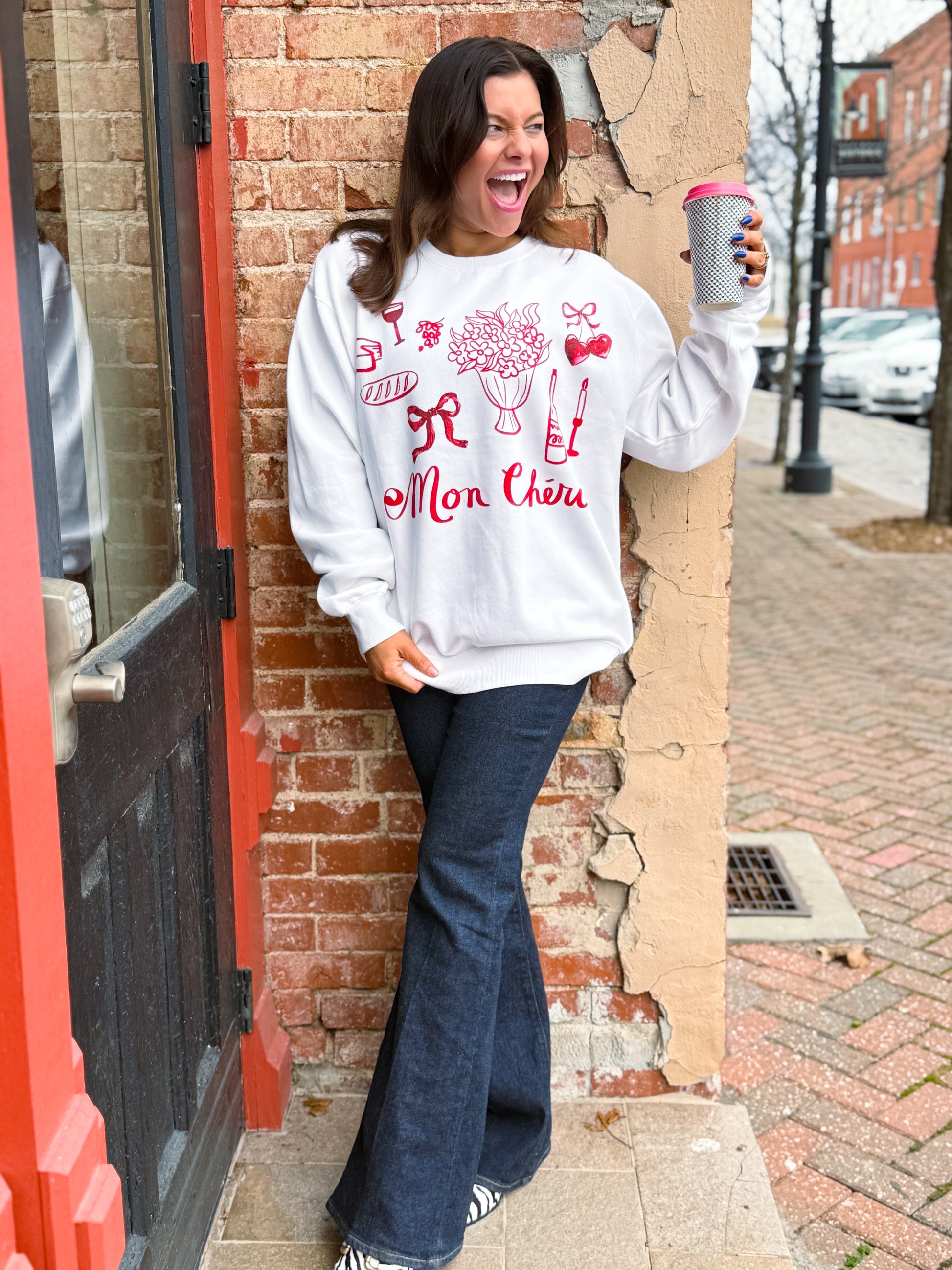 Put a little pep in your step with this oversized cute graphic sweatshirt in our classic crew neck cut. An easy throw on outfit for running errands with denim and chunky kicks.
