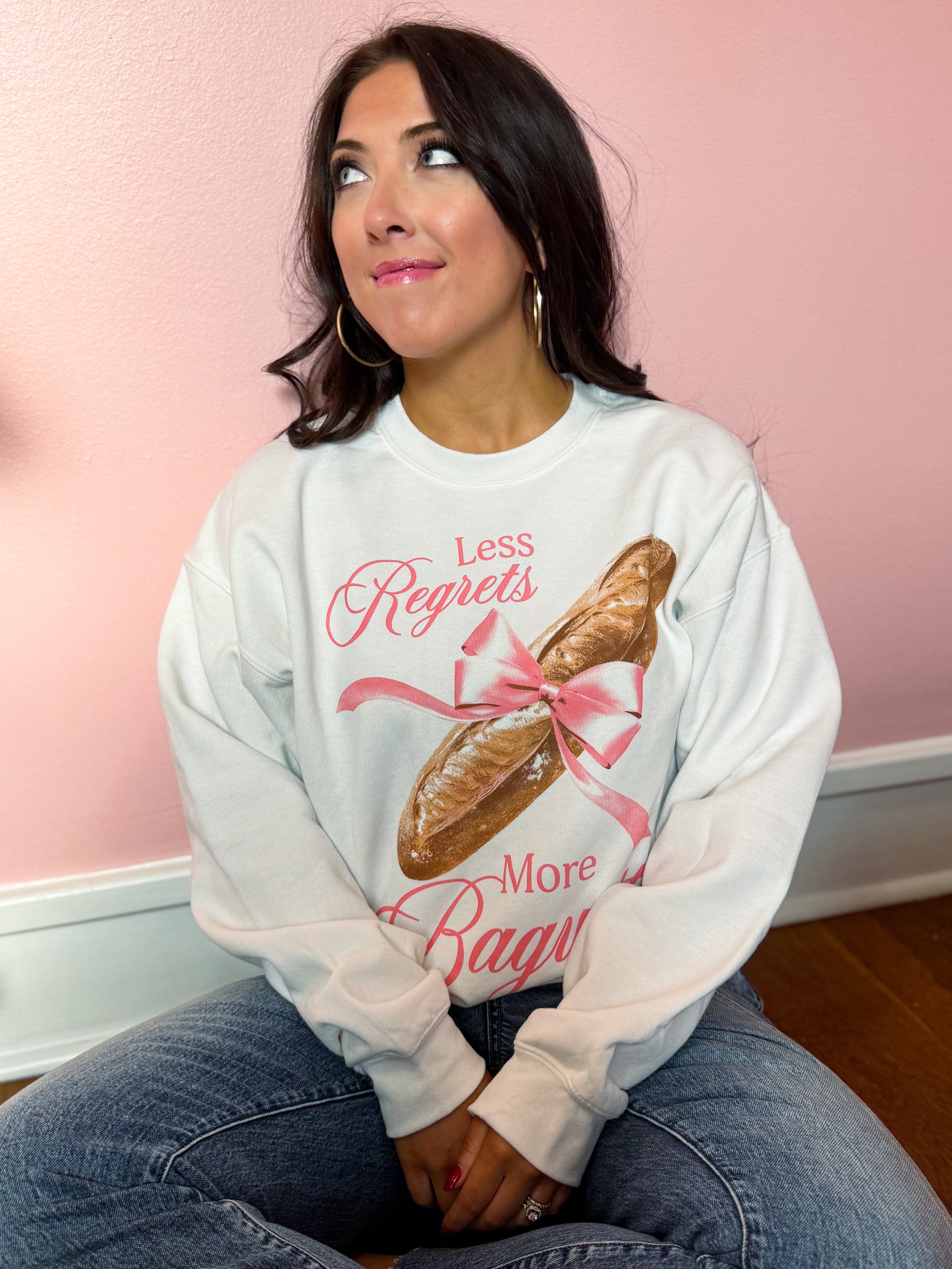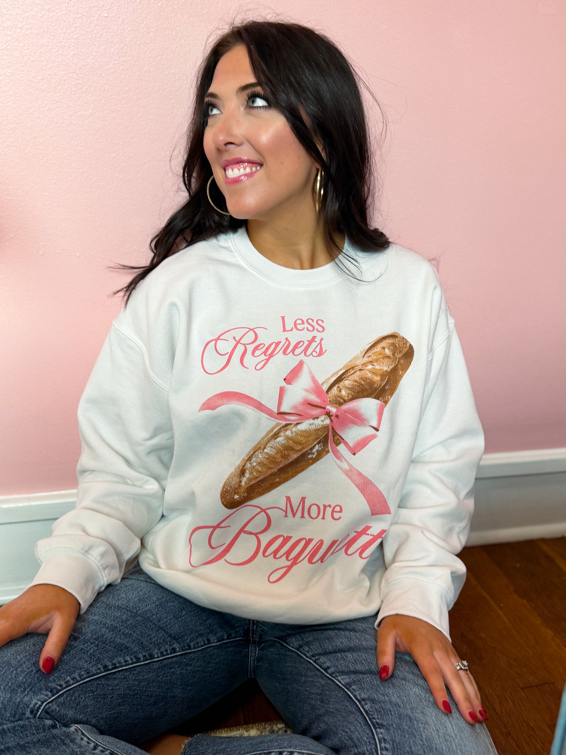 Indulge in comfort and style with our More Baguettes sweatshirt! This long sleeve, oversized sweatshirt features a playful "Less Regrets More Baguettes" graphic on the front. Perfect for cozy nights in or running errands (and maybe picking up some baguettes)!