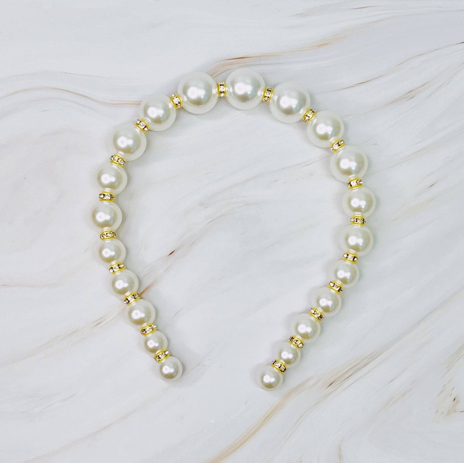 This headband features a stunningly pearled design with a cool pearl growing effect. Each pearl is placed next to a sparkling jewel, making it perfect for both everyday wear and special occasions like weddings.