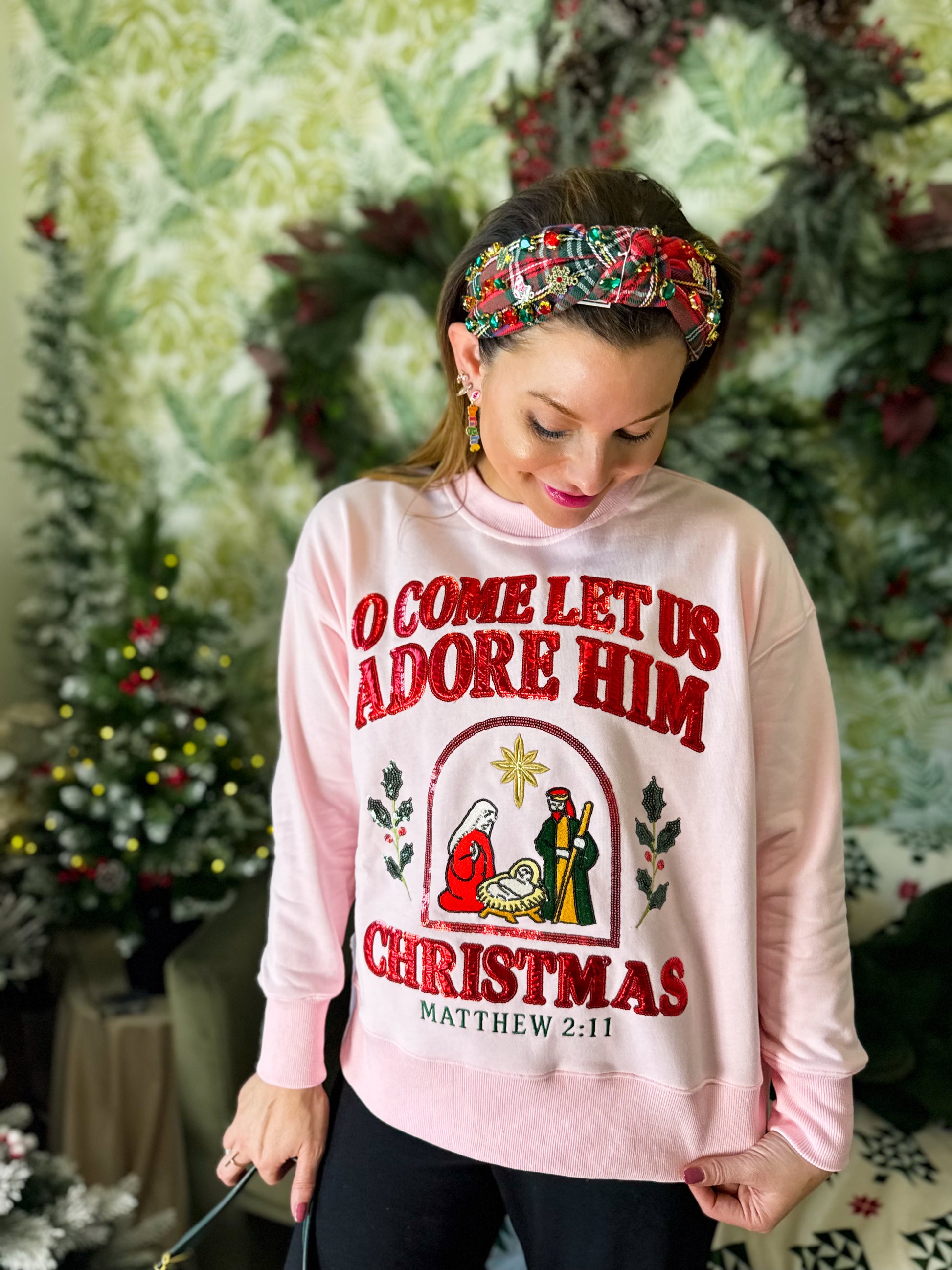 * Faith-inspired Christmas sweatshirt perfect for seasonal gatherings and celebrations * Featuring “O Come Let Us Adore Him” design with Nativity scene * Crafted from soft cotton Terry sweatshirt material * Material: 80% Cotton, 20% Polyester * STYLE NOTE: This sweatshirt is made to fit oversized. You should purchase your normal size if you want the oversized look and fit. If you want a more fitted look, we recommend sizing down.