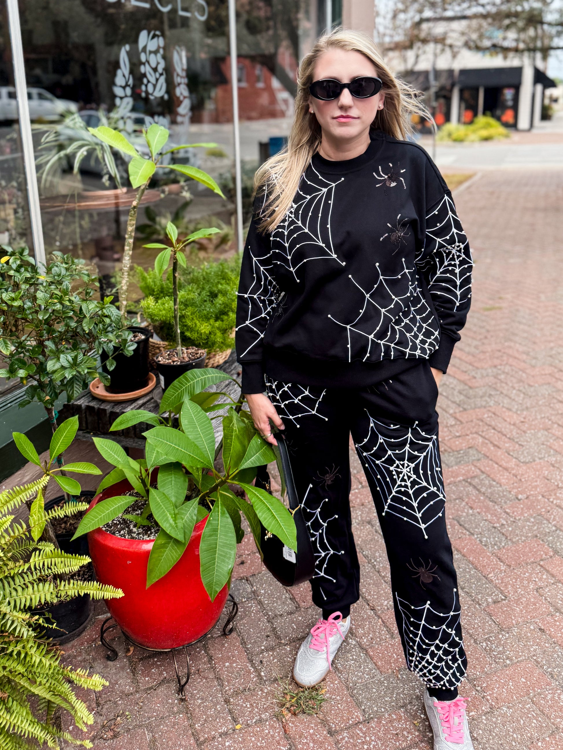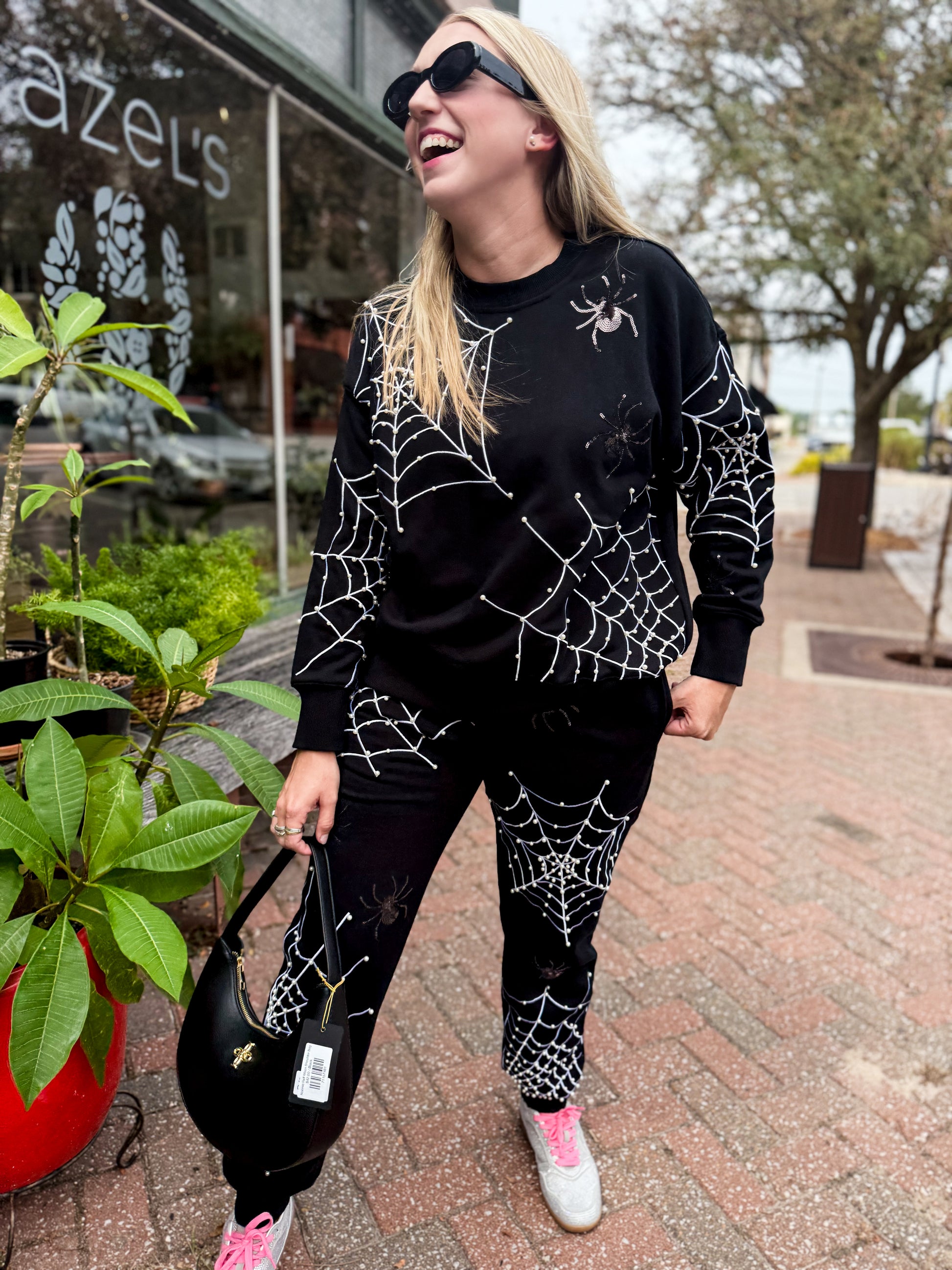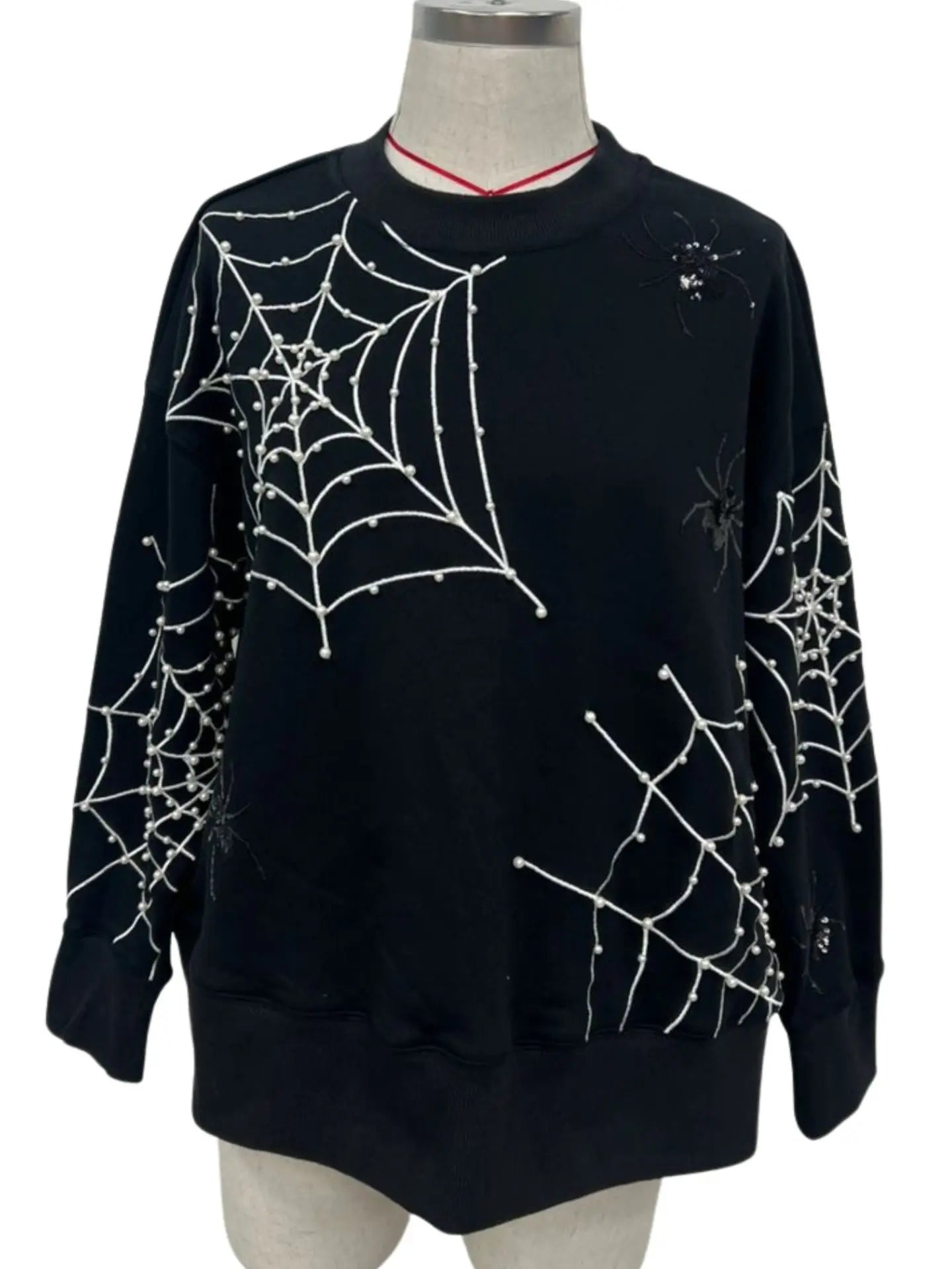 Get cozy in the Pearl Spiderweb Sweatshirt, made from soft cotton Terry material that's perfect for chilled days. Featuring a fun Pearl Webs Spider design, it pairs effortlessly with matching sweatpants or skorts to complete your spooky-chic look. Whether lounging or out and about, this Brianna Cannon piece adds playful charm to your wardrobe.