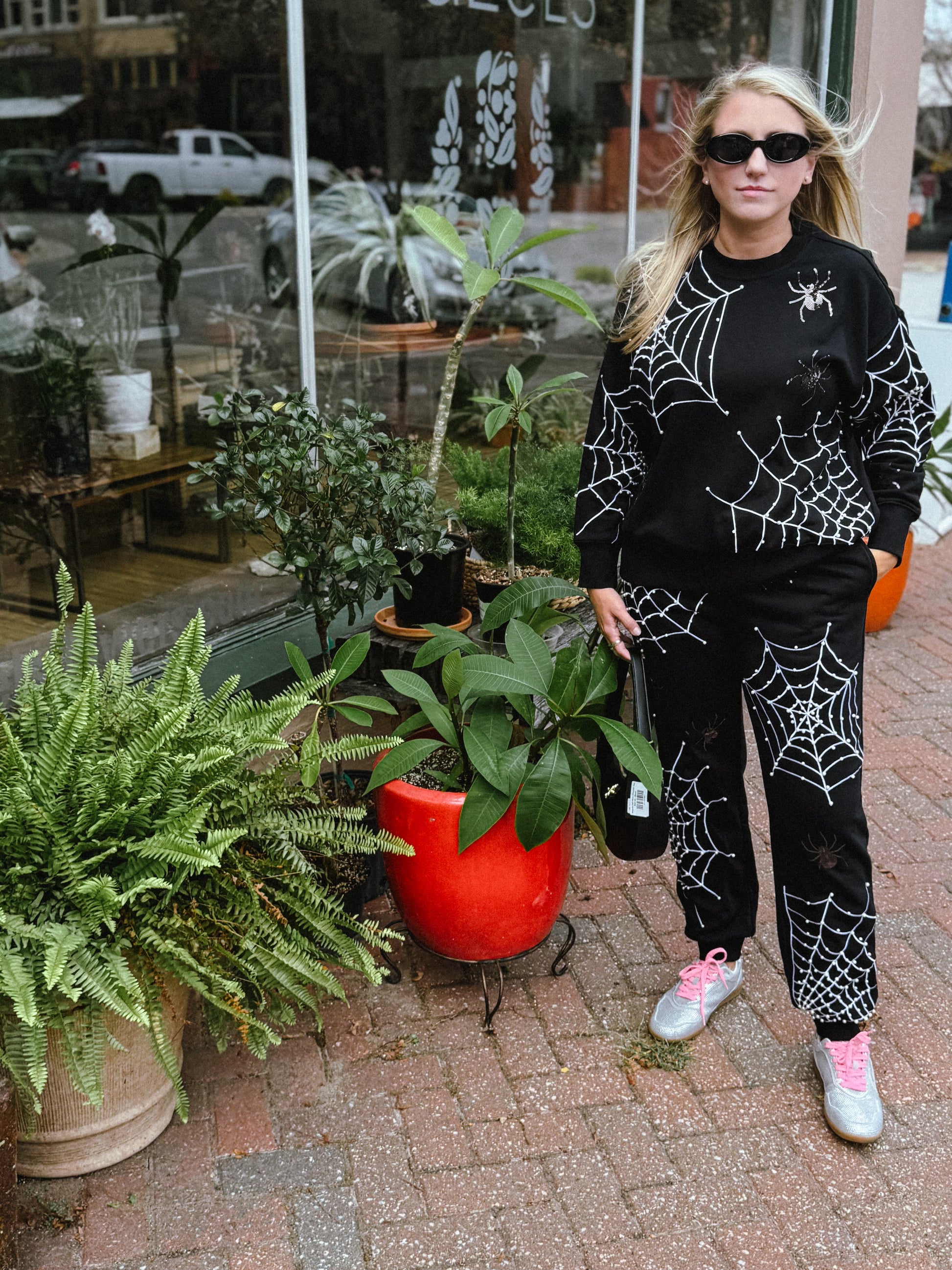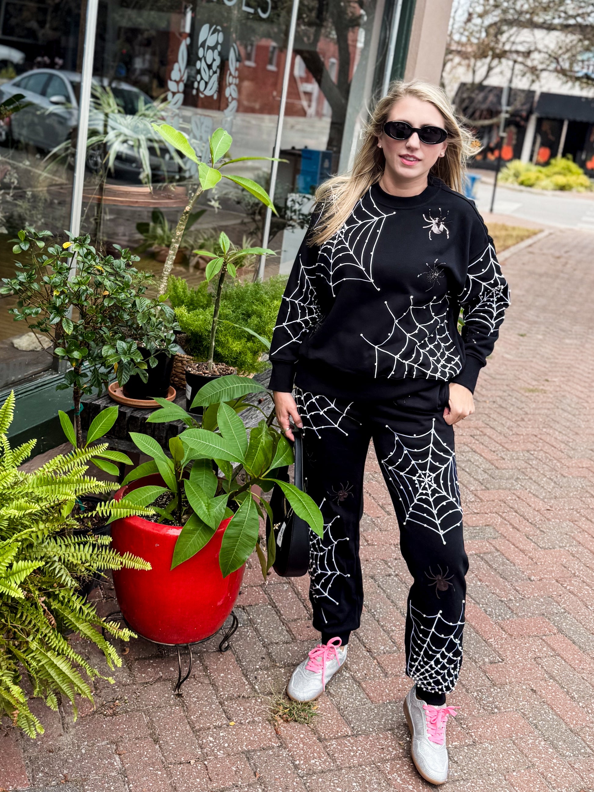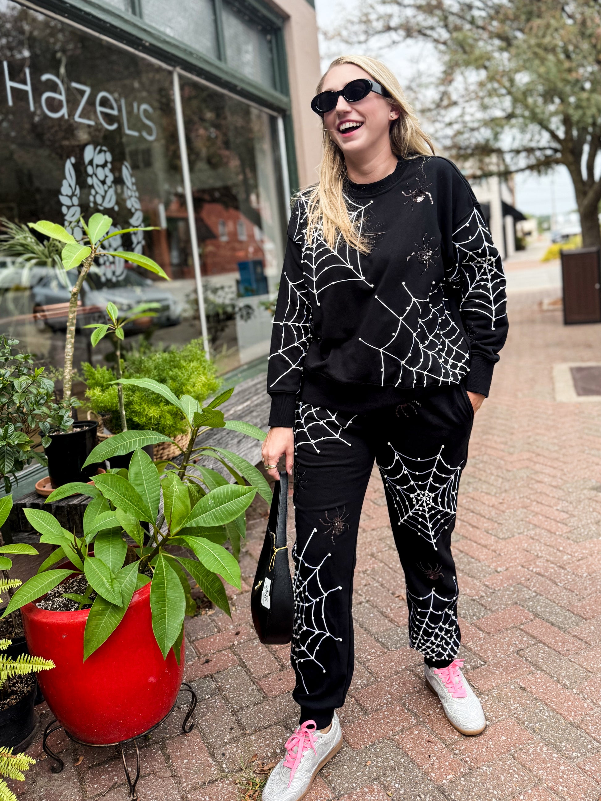 Get cozy in the Pearl Spiderweb Sweatshirt, made from soft cotton Terry material that's perfect for chilled days. Featuring a fun Pearl Webs Spider design, it pairs effortlessly with matching sweatpants or skorts to complete your spooky-chic look. Whether lounging or out and about, this Brianna Cannon piece adds playful charm to your wardrobe.