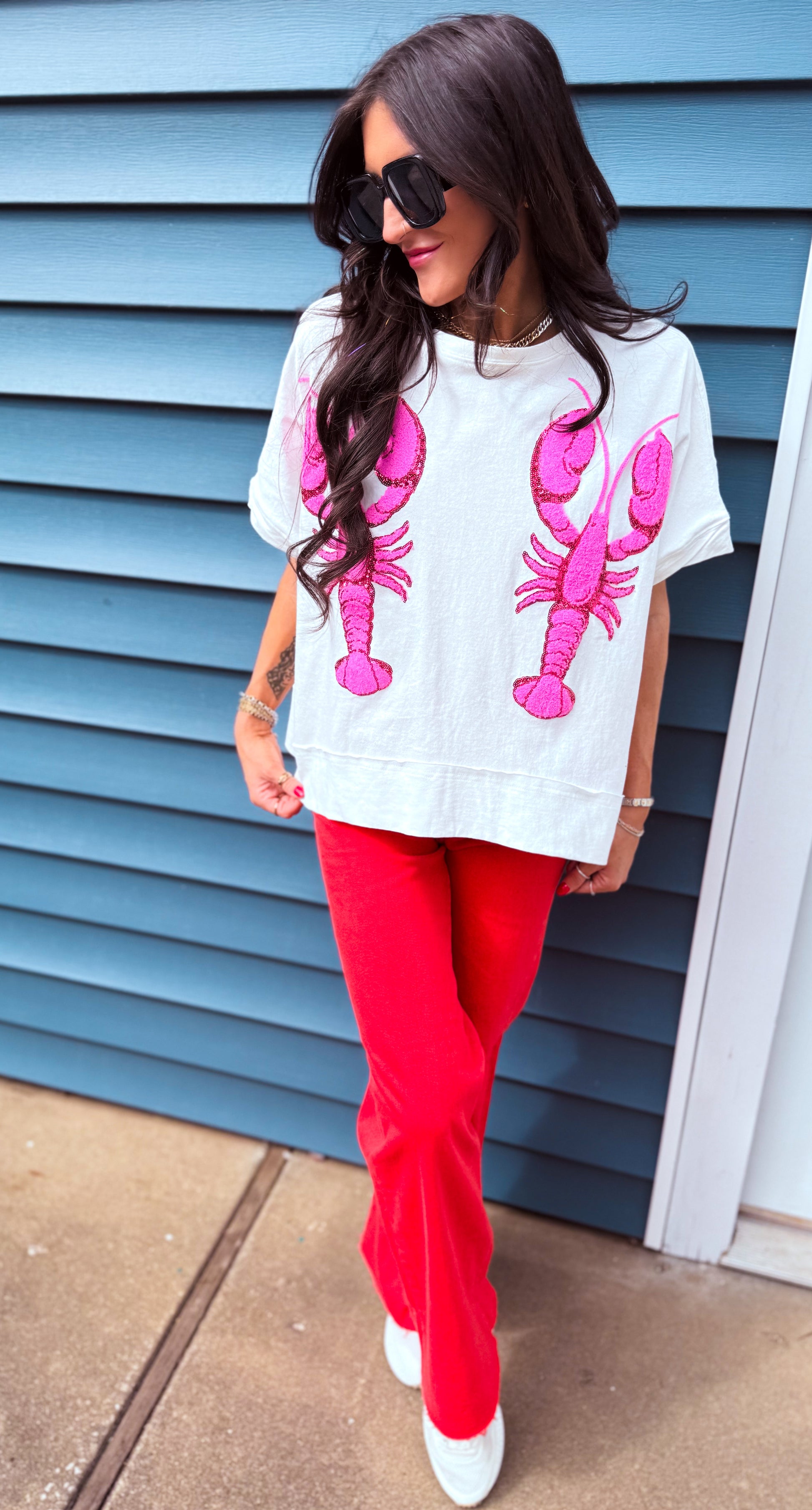 Indulge in some Louisiana charm with the Pinch Me Pretty Tee. Crafted in soft cotton jersey, this oversized tee features an embossed crawfish towel design and sparkling sequins. Perfect for a playful statement, this short sleeve tee is a must-have for your wardrobe.