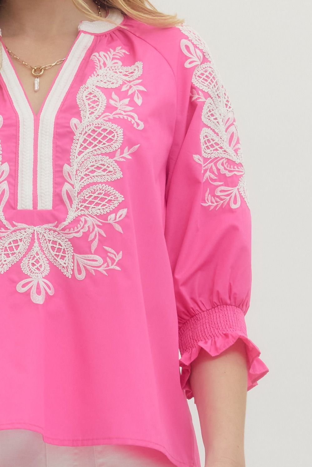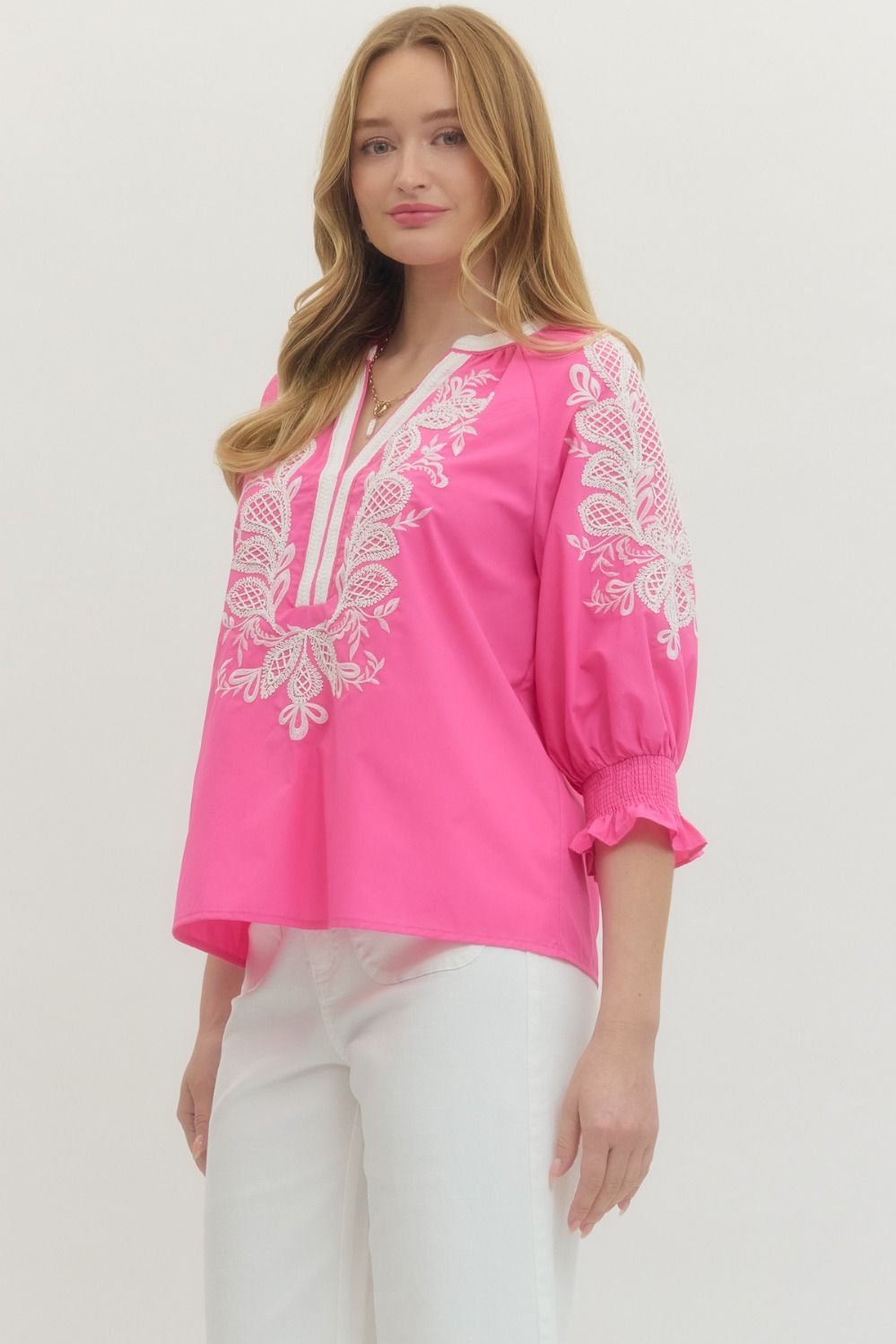 Elevate your everyday wardrobe with this charming Pink Petal Top! Crafted from lightweight woven fabric, this piece features a flattering split V-neck with contrast binding that adds a touch of sophistication. The three-quarter sleeves are finished with elasticated cuffs for a polished look, while delicate embroidery details bring personality to the design. Unlined and non-sheer, it's perfect for layering or wearing solo. Whether you're heading to brunch or a casual day out, this versatile top pairs effortlessly with your favorite jeans or skirts for an instantly put-together vibe.