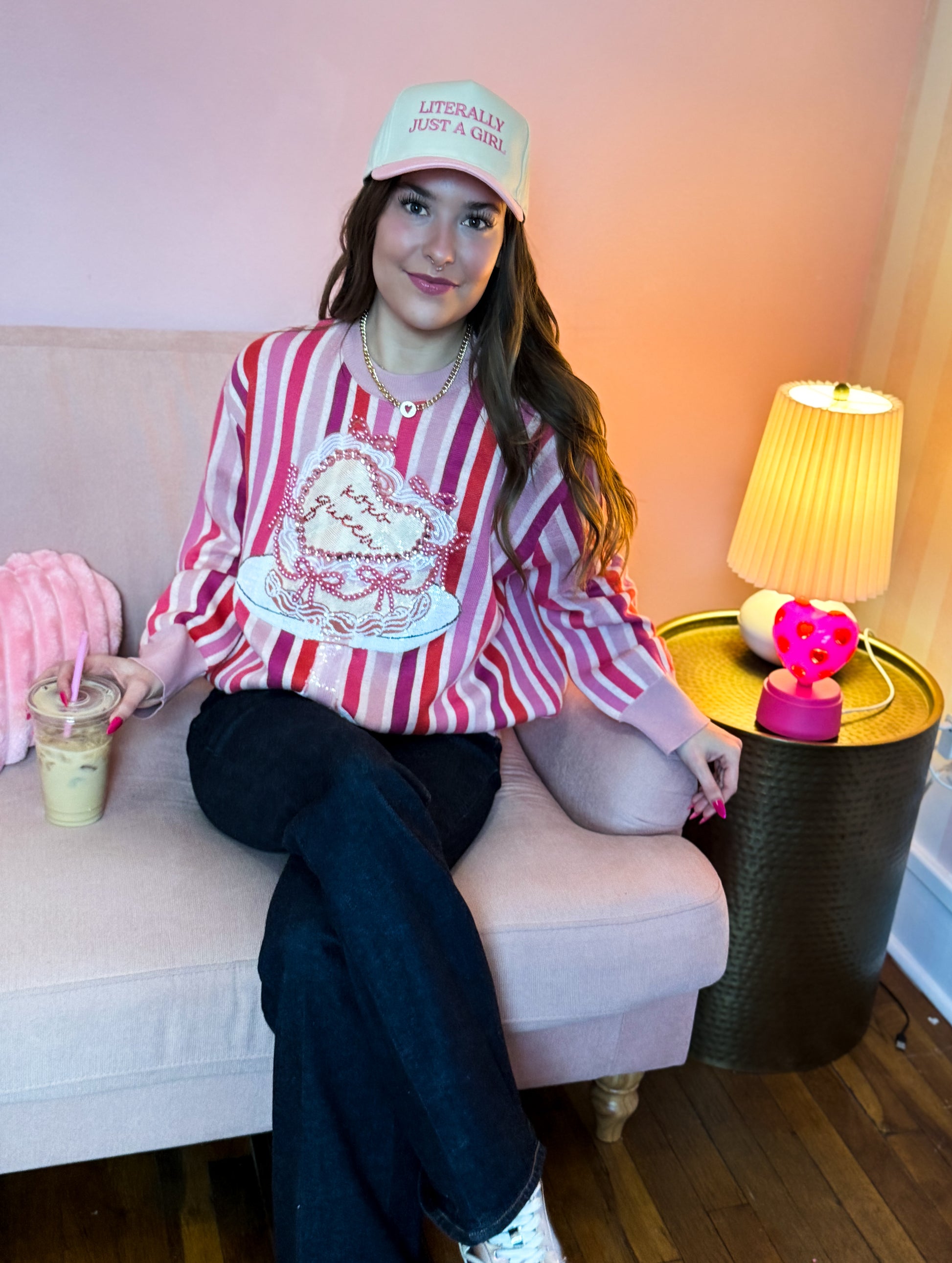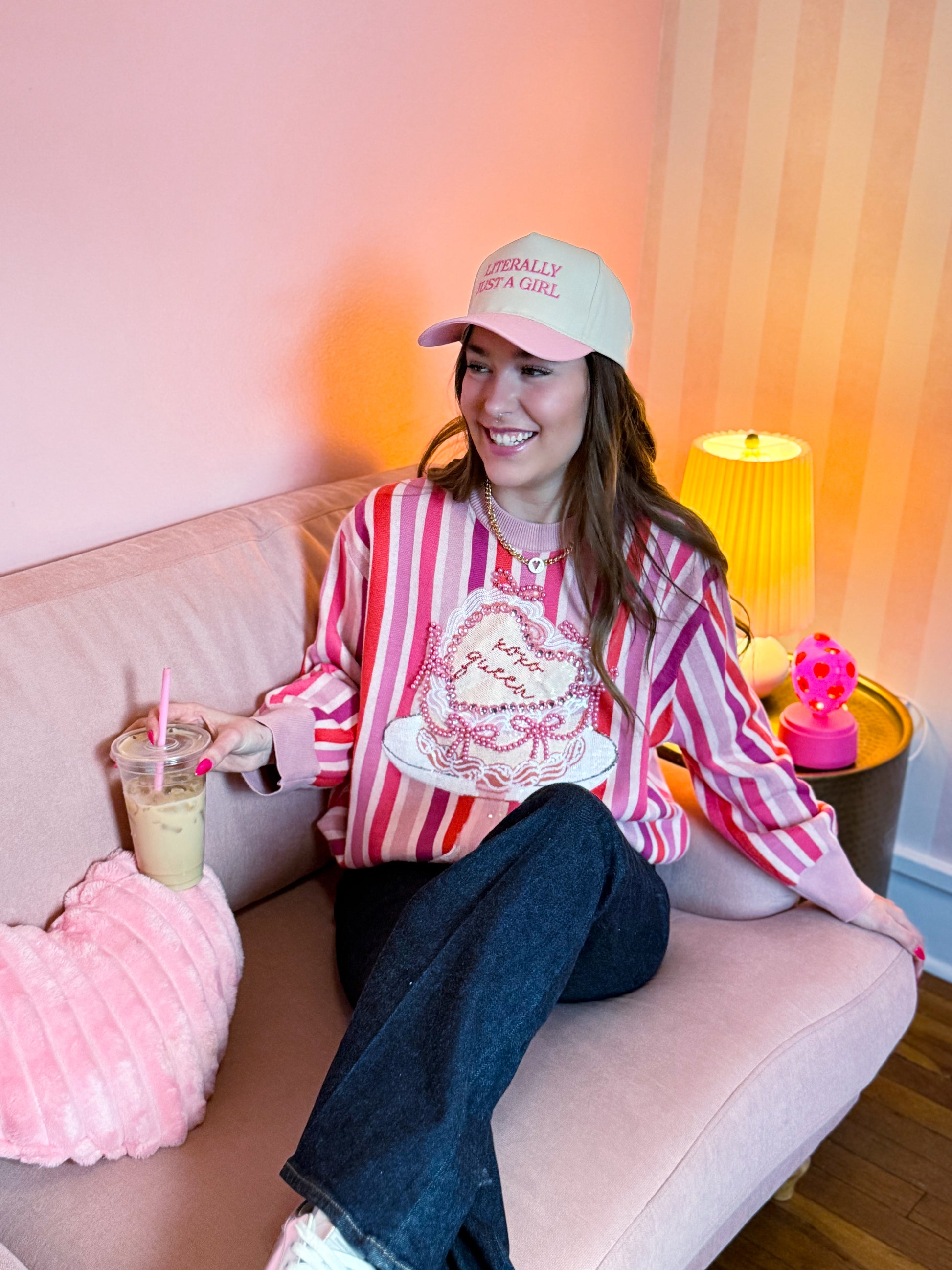 This Queen of Sparkles sweater is pure Valentine magic with a playful, couture twist. Featuring bold pink and coral stripes, it’s finished with an oversized heart motif adorned in pearls, beads, bows, and delicate embroidery that reads “xoxo queen” Every detail feels thoughtful, whimsical, and unapologetically extra—exactly what QOS does best.
