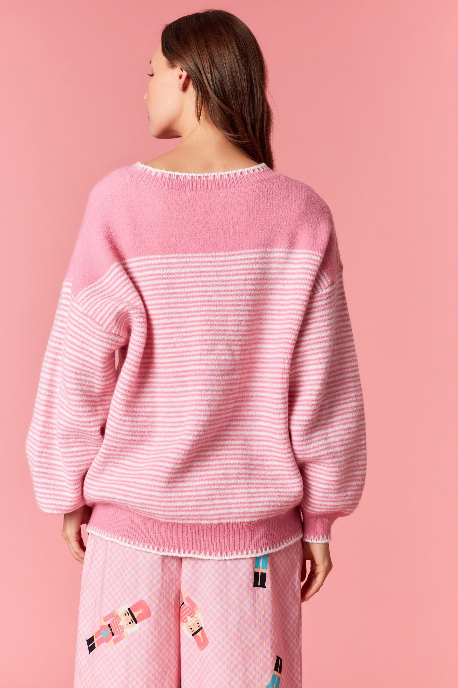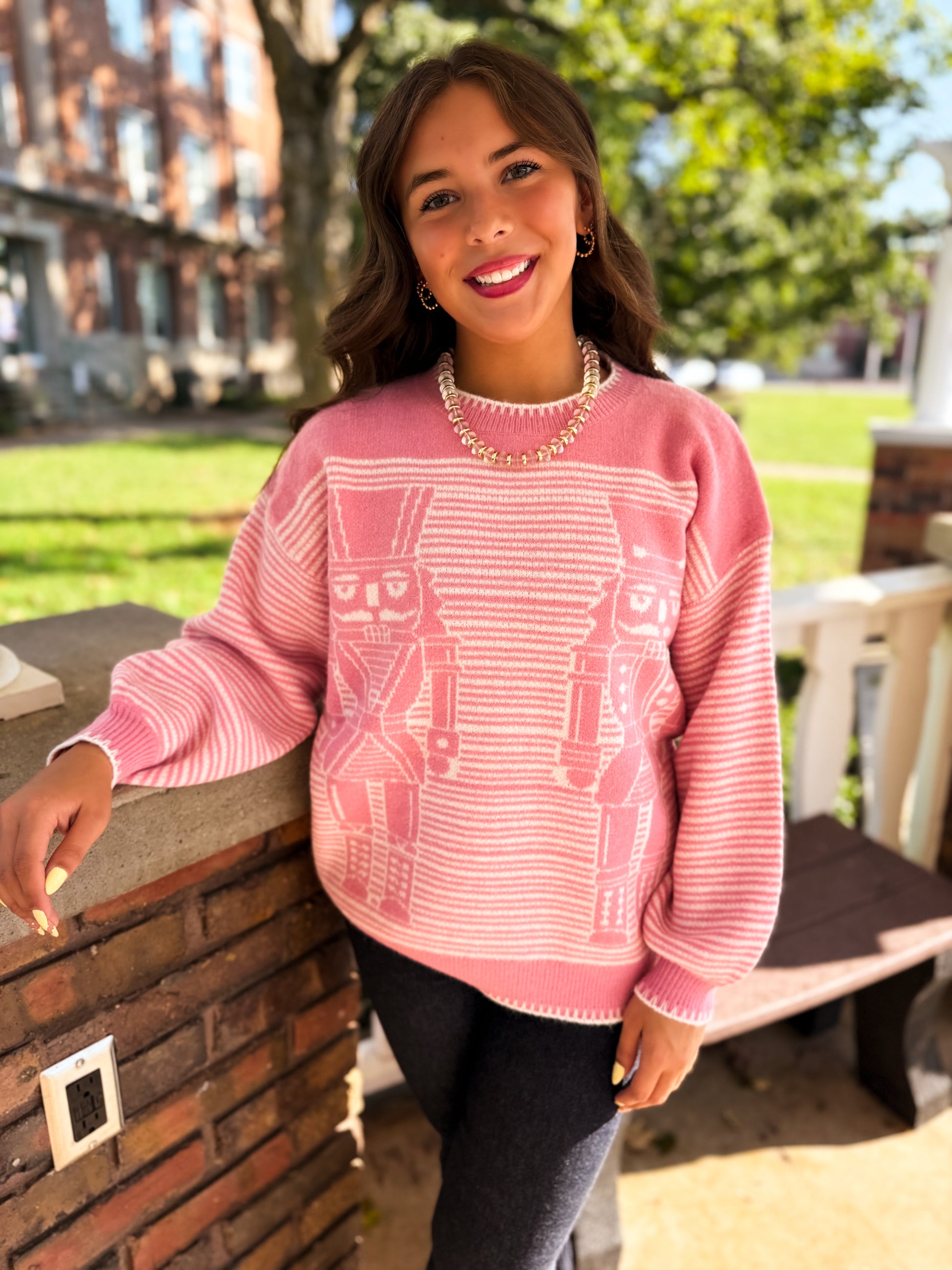 Cozy up in festive charm with our Pretty in Pink Nutcracker Sweater, featuring delightful blanket stitch detailing that adds a handcrafted touch. Playfully adorned with a classic toy soldier motif, this sweater brings holiday cheer in a fun and stylish way. Perfect for spreading joy and staying warm during all your seasonal celebrations!
