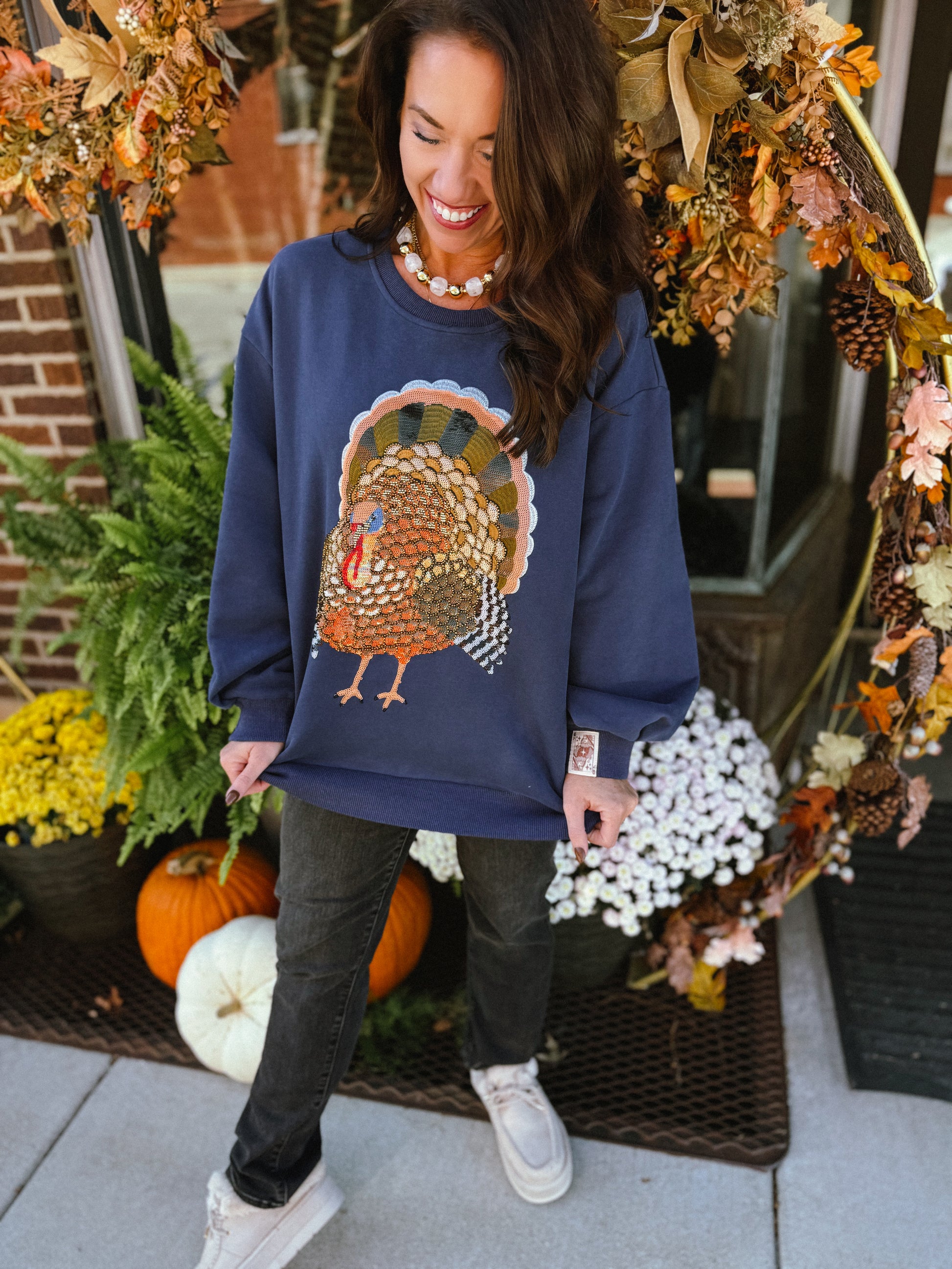 Celebrate the holidays in style with the QOS Big Turkey Sweatshirt by Queen of Sparkles. This cozy navy sweatshirt features a giant sequined turkey on the front that shines with festive sparkle, perfect for spreading cheerful vibes at any holiday gathering. Stay comfy and playful while making a bold seasonal statement!