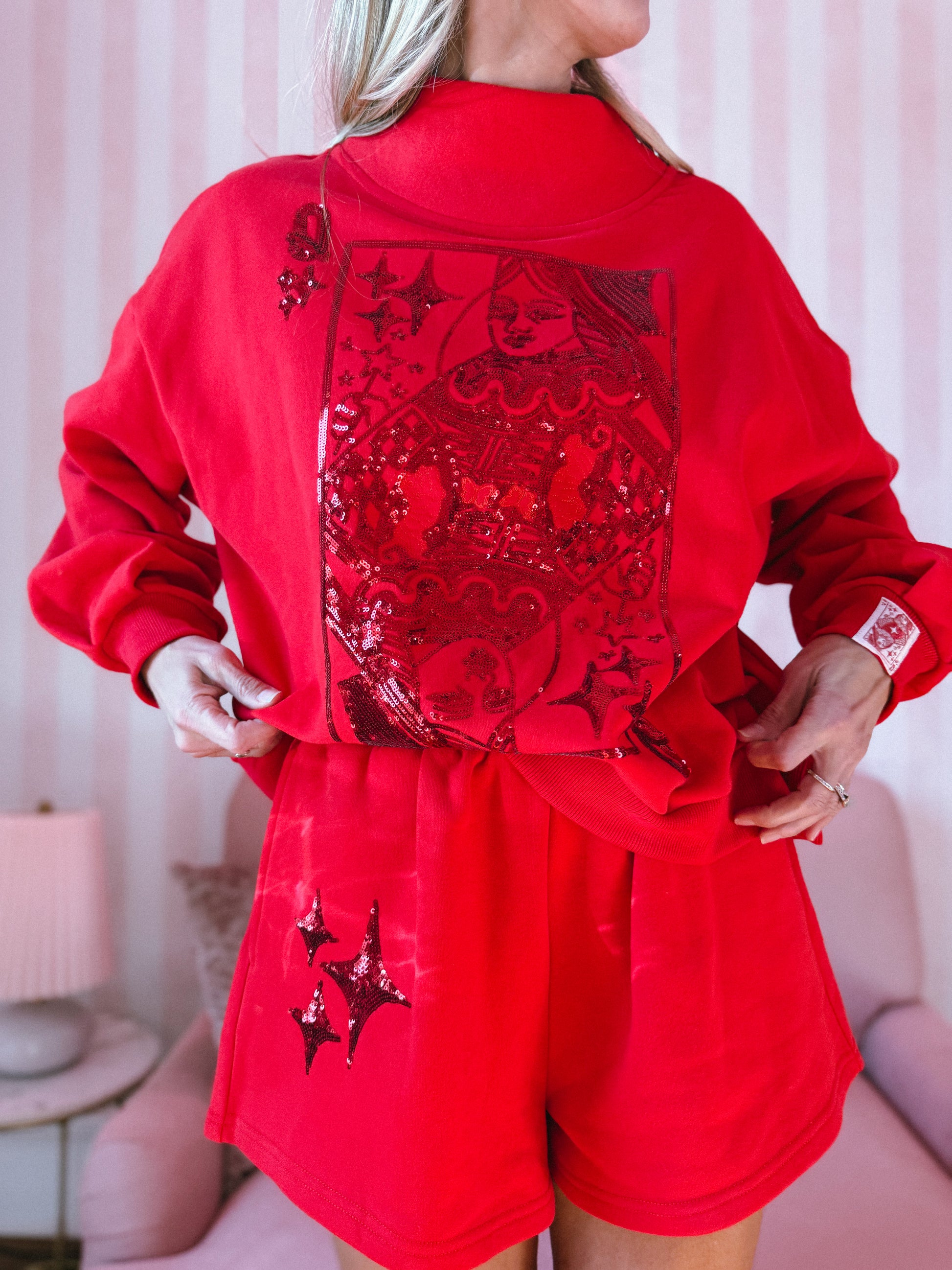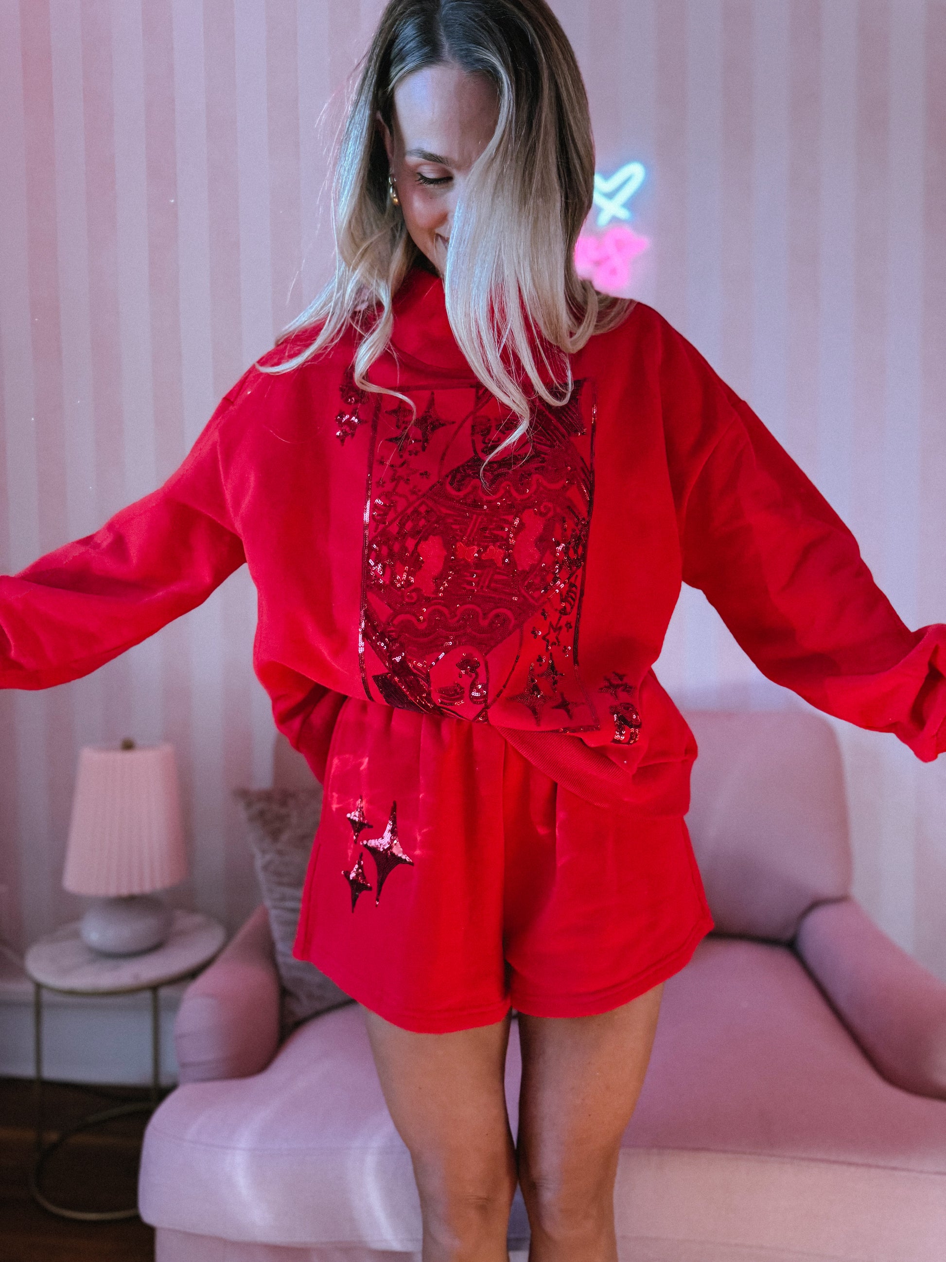 Complete the look with these bright red sequin star shorts! Designed with a comfy elastic waistband and relaxed silhouette, these shorts add sparkle to every step. Style with the matching mockneck or your favorite graphic tee for a festive, sporty-chic look.