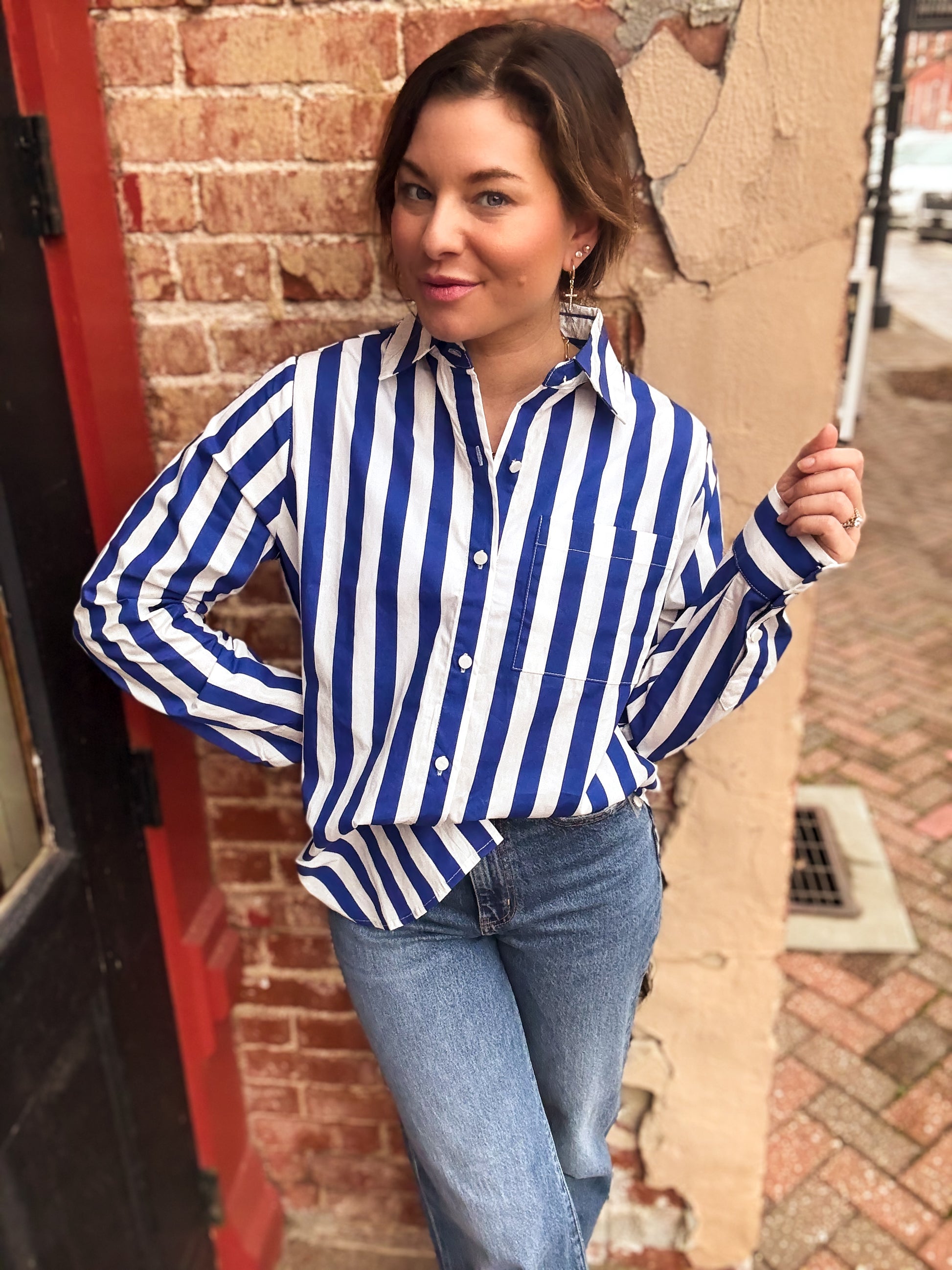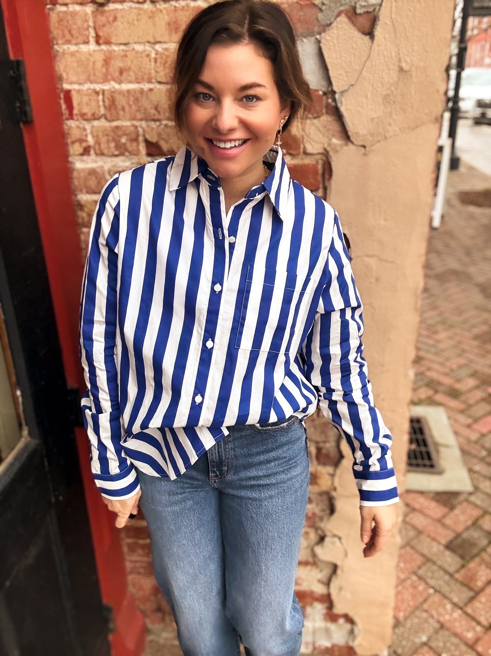 Meet your new wardrobe MVP! This royal blue striped button-front top is crafted from 100% cotton, making it breathable and comfortable for all-day wear. The classic design pairs effortlessly with jeans, skirts, or trousers, while the crisp stripes add just the right amount of visual interest. Whether you're dressing it up for the office or keeping it casual on the weekend, Paula delivers timeless style with a modern twist. A closet essential that never goes out of style.
