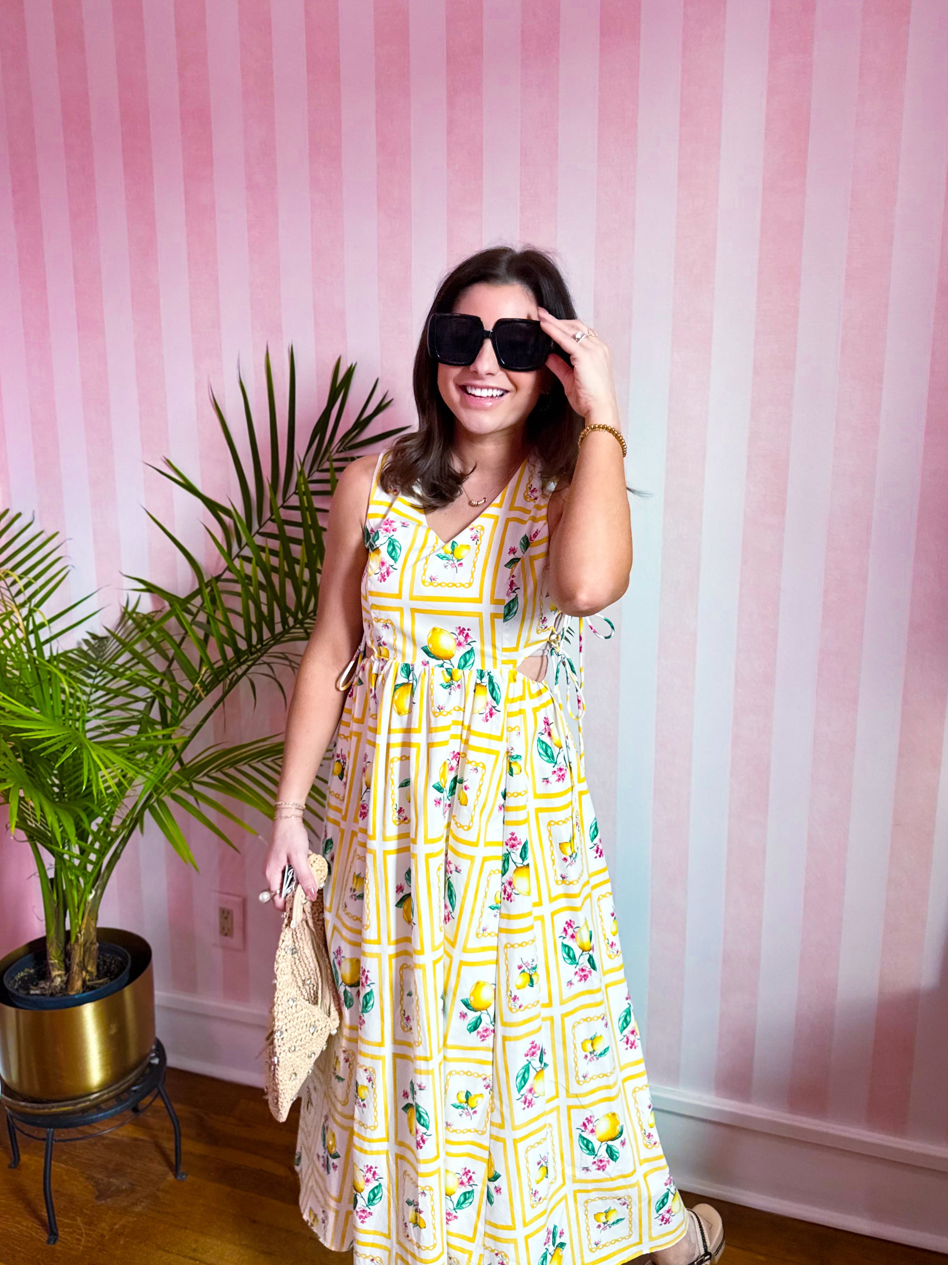 Channel your inner sunshine with our Santorini Citrus Maxi Dress. Featuring playful side cut outs with ties and a fun stripe lemon print, this dress will have you feeling fresh and flirty. Perfect for warm weather and beach days. Dress to impress (and maybe even make some lemonade!).