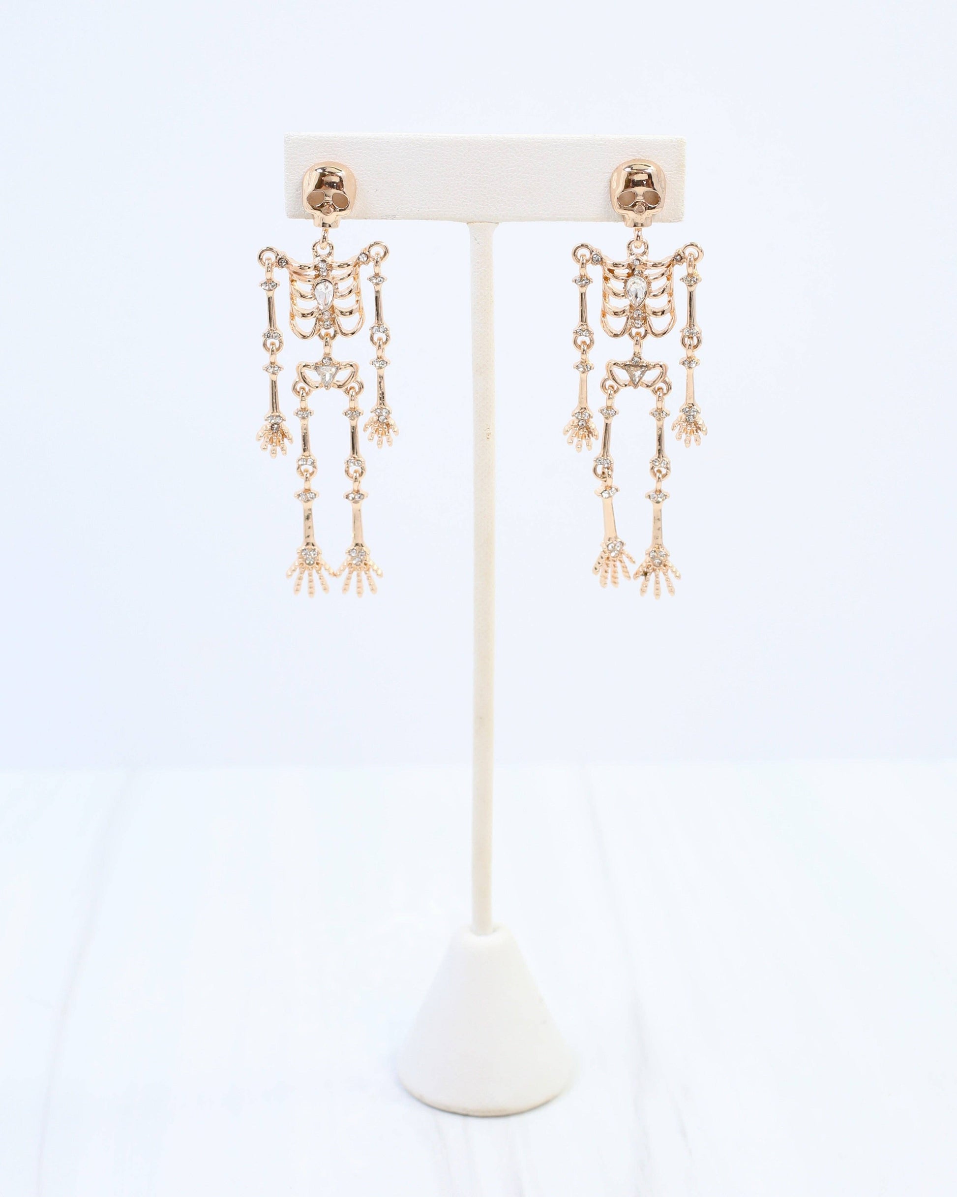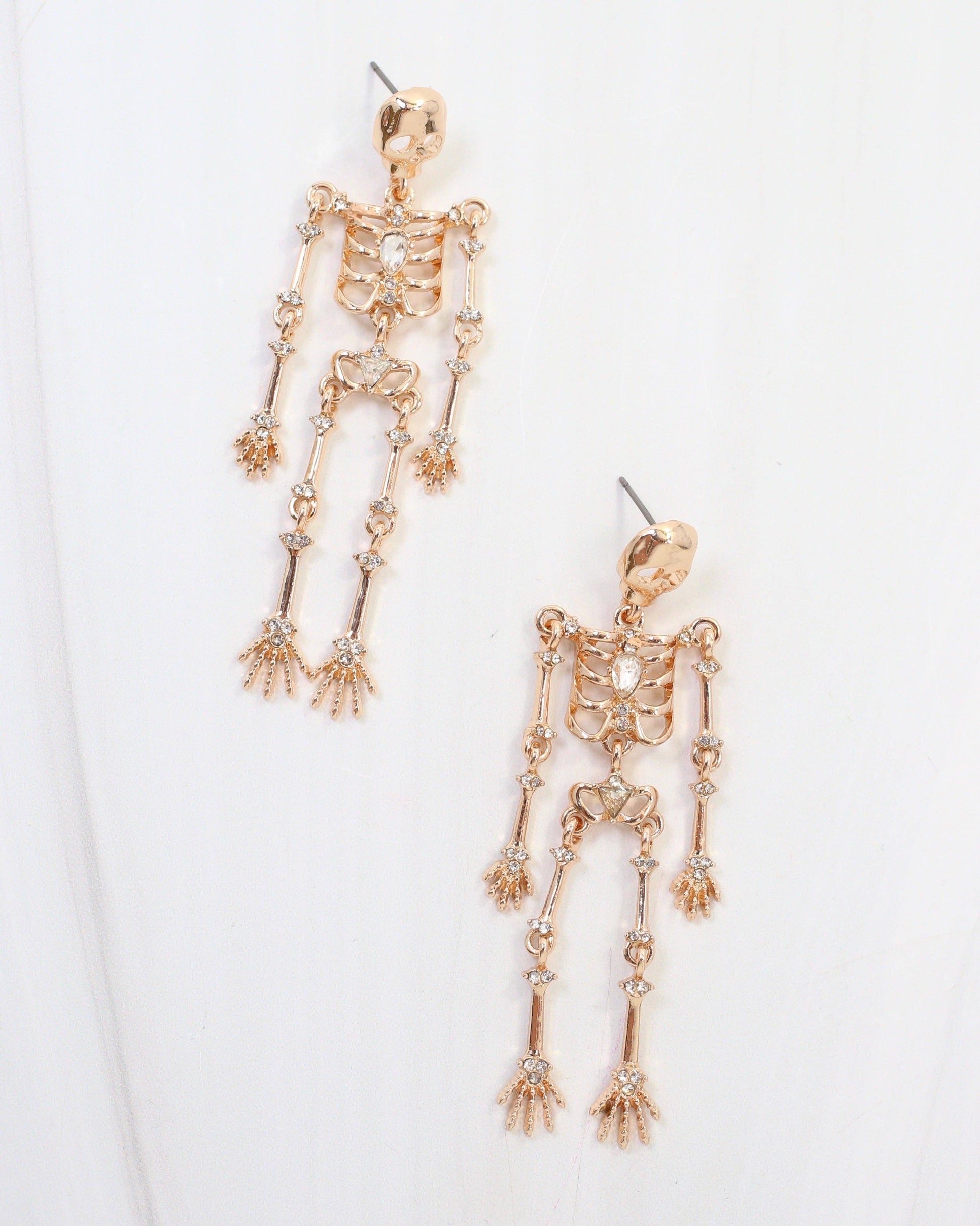 Make a stylish statement with the Spooky Skeleton Earring in Gold. Featuring a swingy Gold metal skeleton with crystal accents at the joints, this earring attaches securely at the skull for a chic, edgy look.