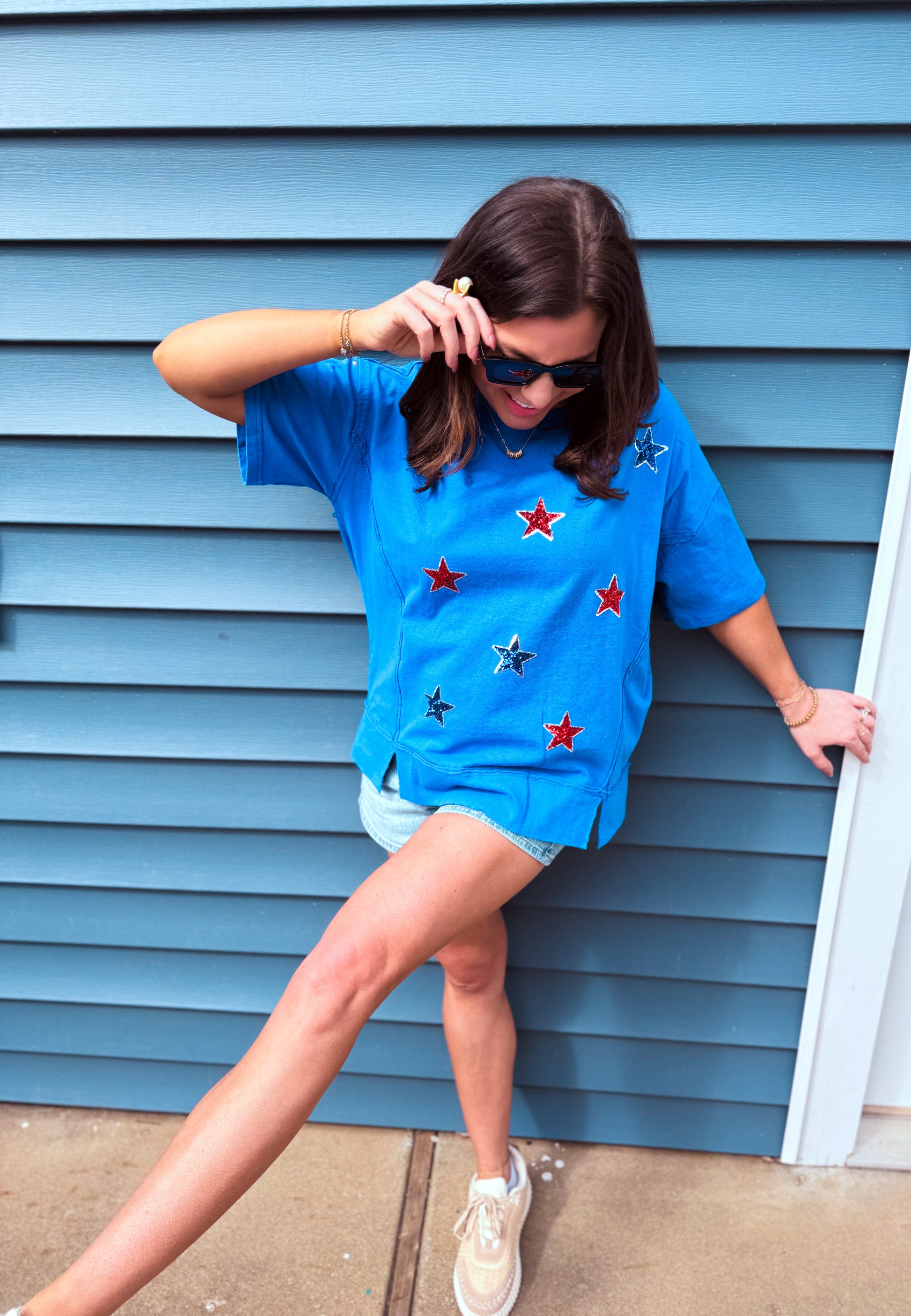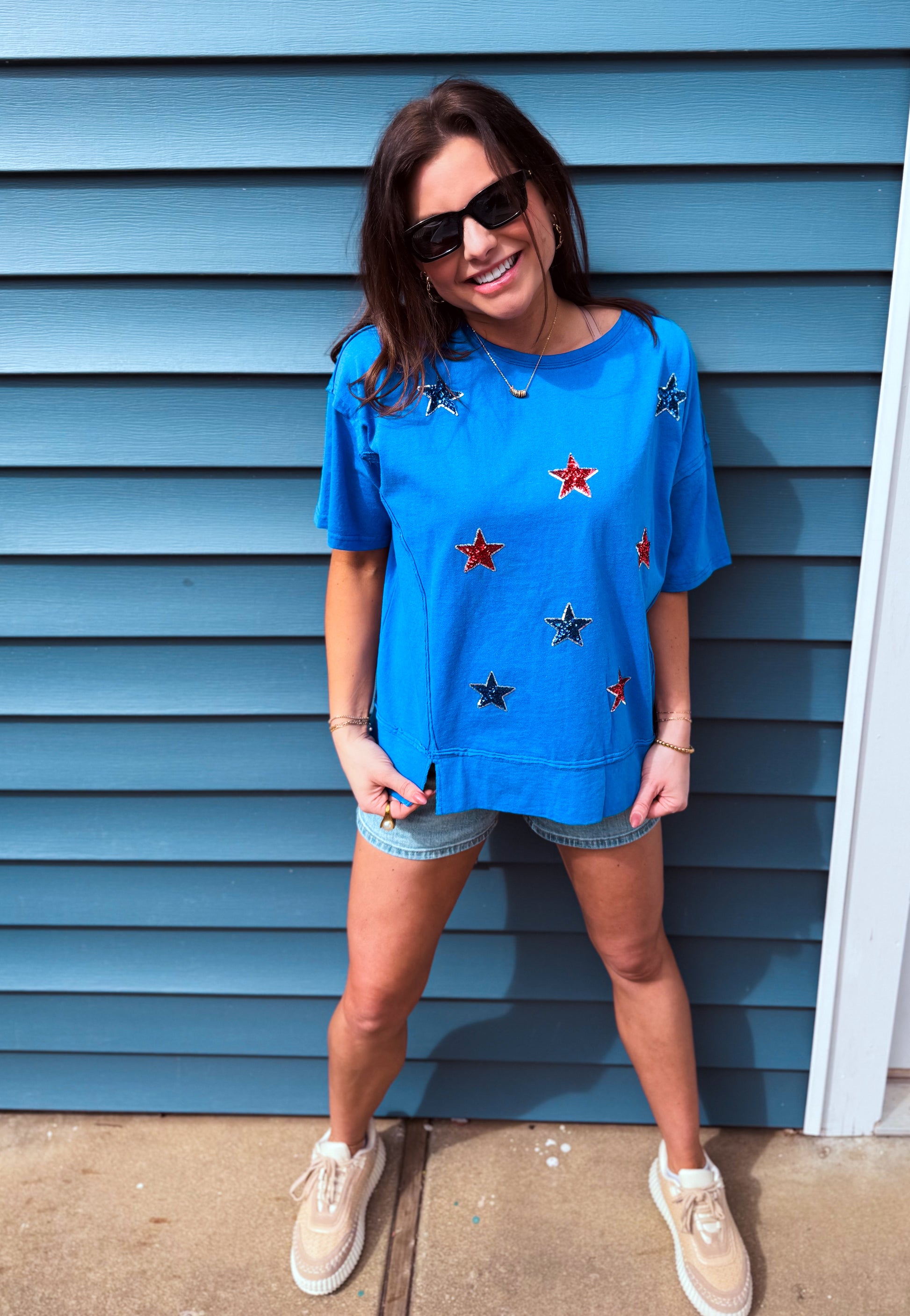 Add some sparkle to your wardrobe with our Star Spangled Sparkle Tee! Featuring star sequin embroidery, short sleeves, and a round neck, this oversized tee is perfect for showing off your American pride (and love for all things shiny).