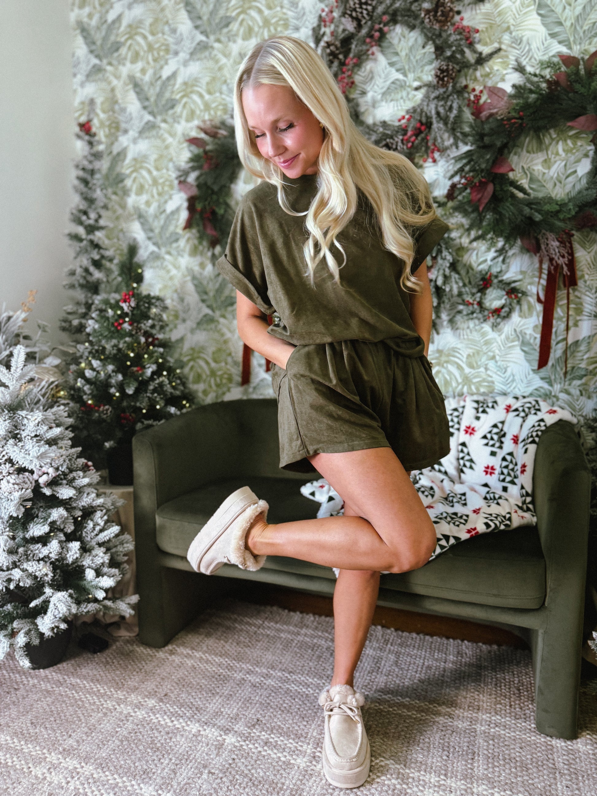 Slip into ultimate comfort with the Sunday Suede Set—your new go-to for laid-back vibes. This relaxed two-piece features a breezy top paired with shorts that actually have pockets (yes, really!). Crafted from soft 100% polyester in a gorgeous olive tone, it's perfect for lounging at home, running errands, or casual hangouts. Easy to wear, even easier to love.