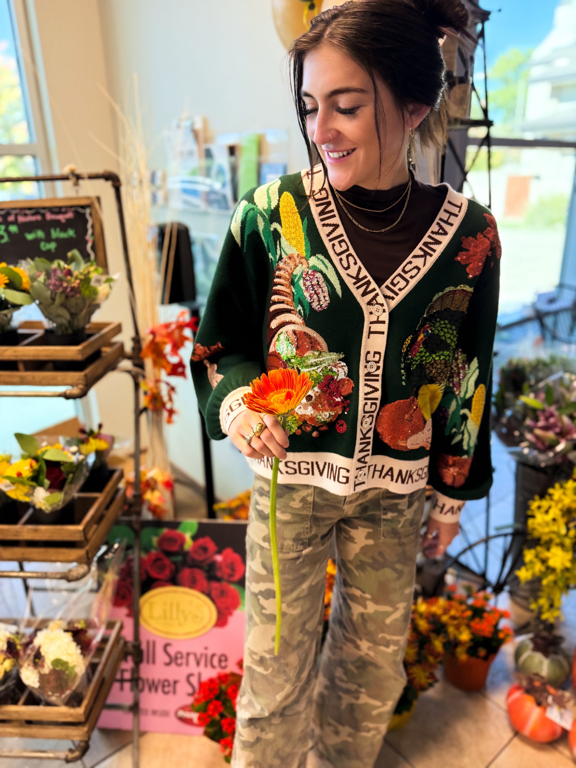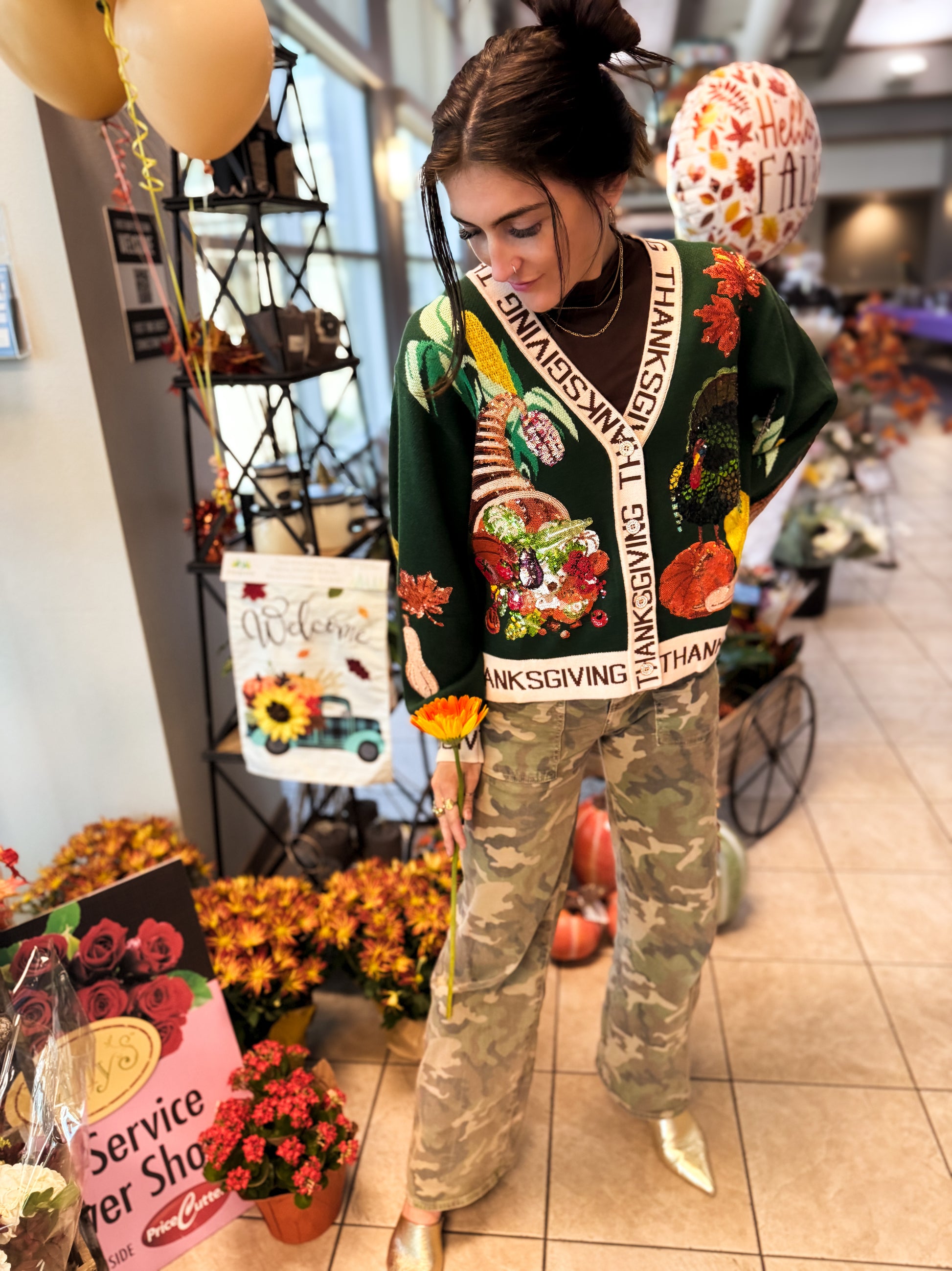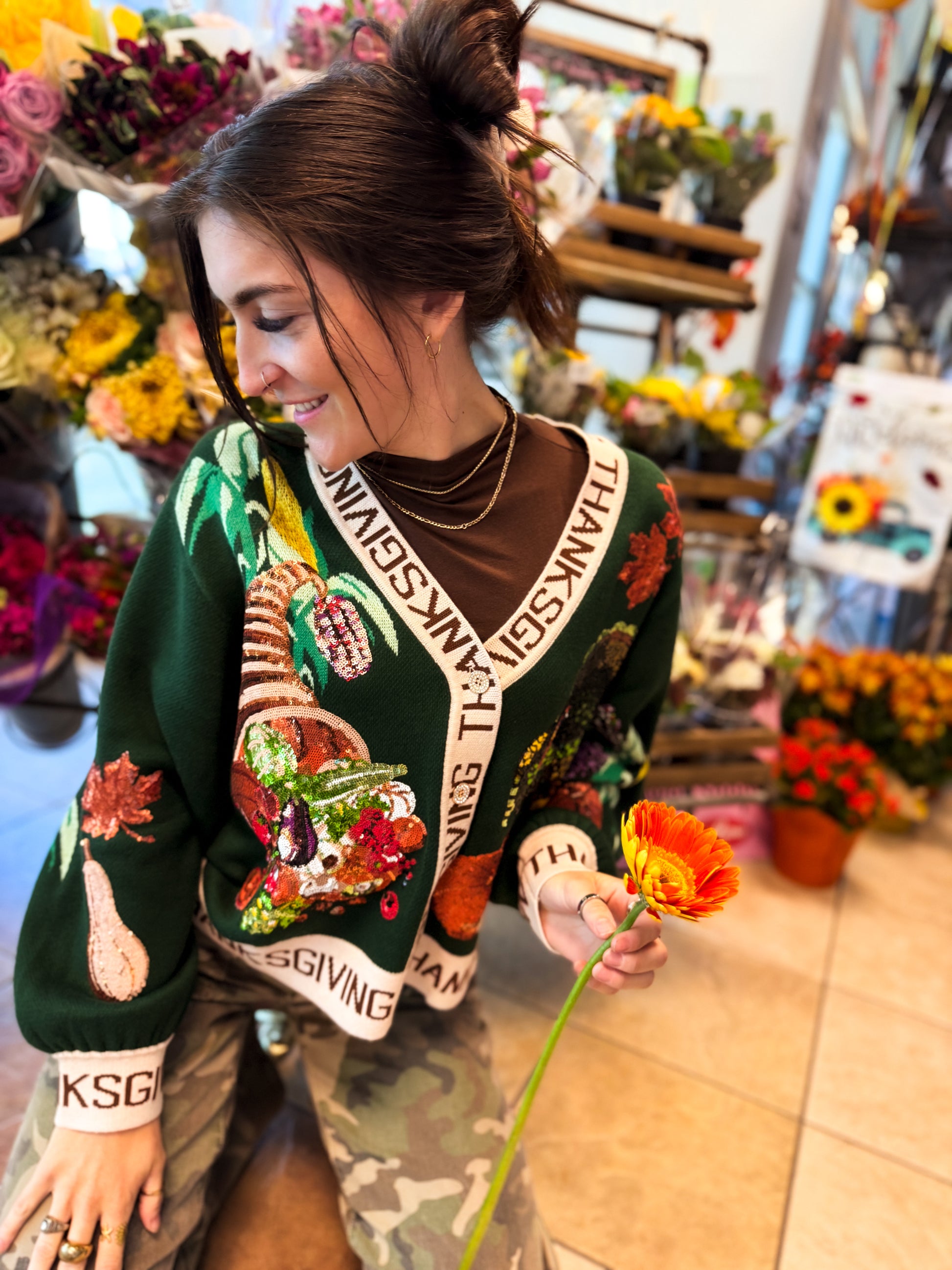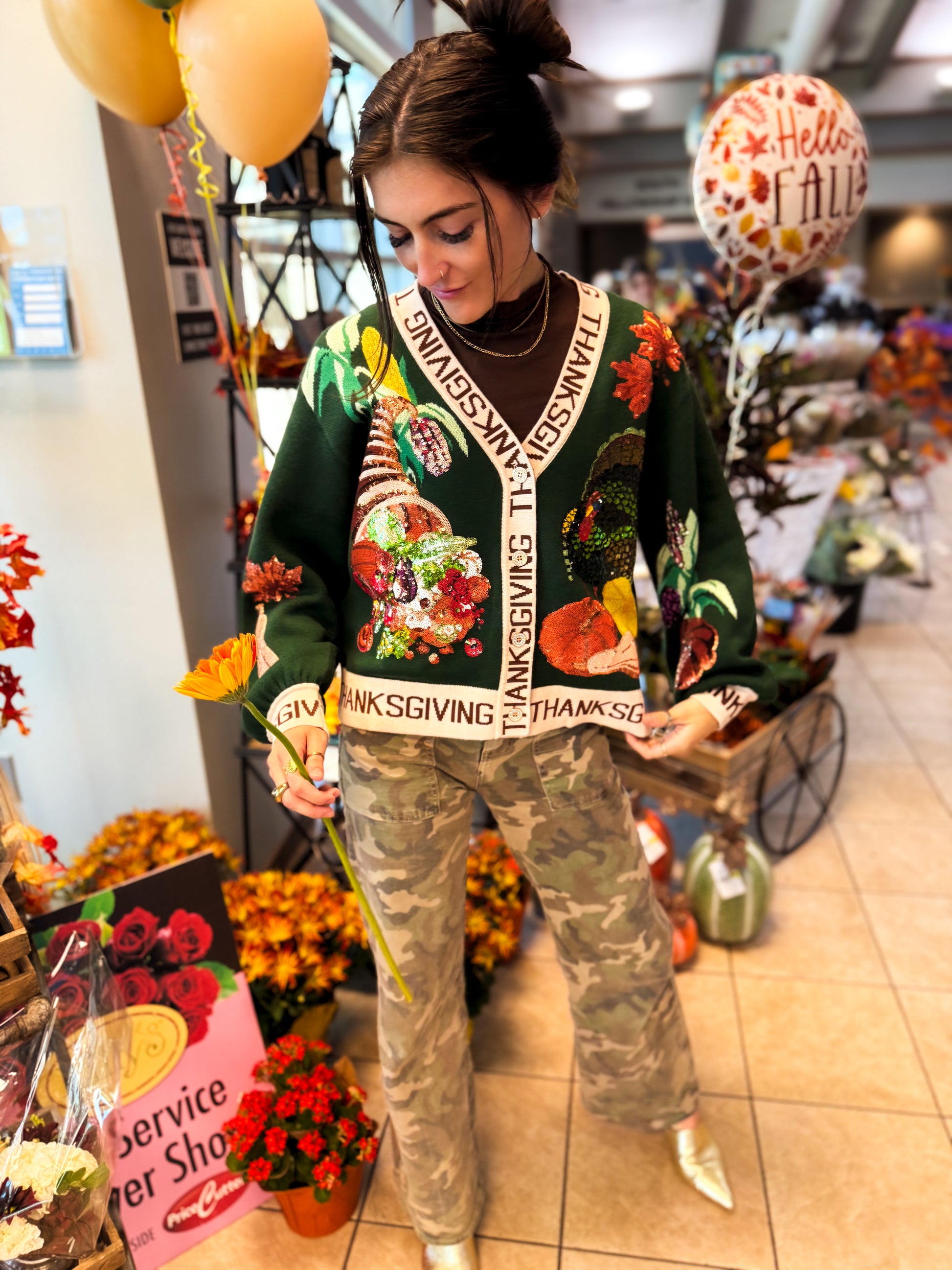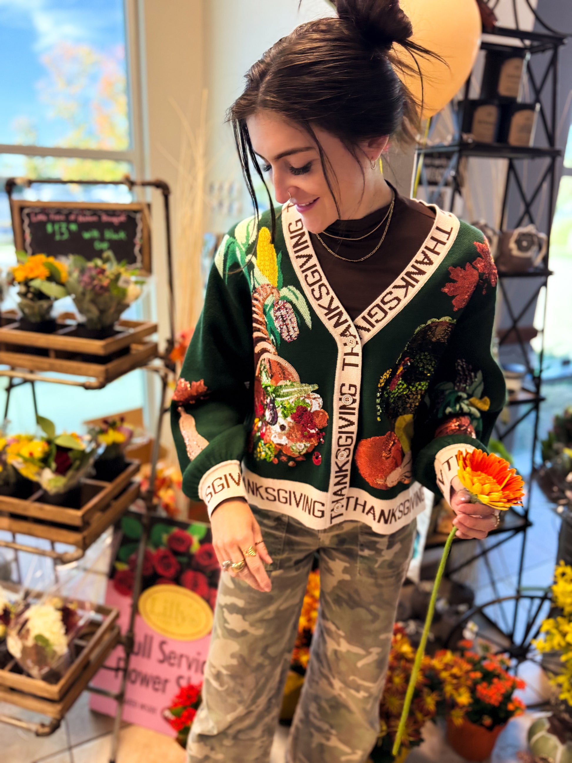 Make your Thanksgiving outfit unforgettable with this Queen of Sparkles sequin cardigan, a true feast for the eyes! This cozy forest green knit features vibrant, hand-sequined fall motifs — from pumpkins and pies to cornucopias and autumn leaves — all trimmed with bold “THANKSGIVING” lettering for the ultimate statement look.