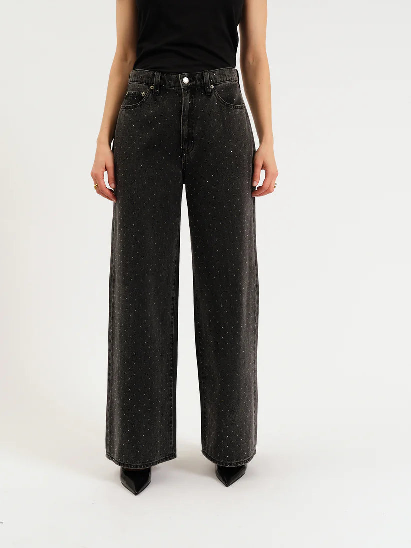 These mid-rise palazzo jeans bring party-ready sparkle to your everyday wardrobe with festive studs scattered throughout the relaxed, wide-leg silhouette. In classic black with just enough shimmer, they're the perfect balance of comfortable and eye-catching—because who says you can't sparkle on a Tuesday?