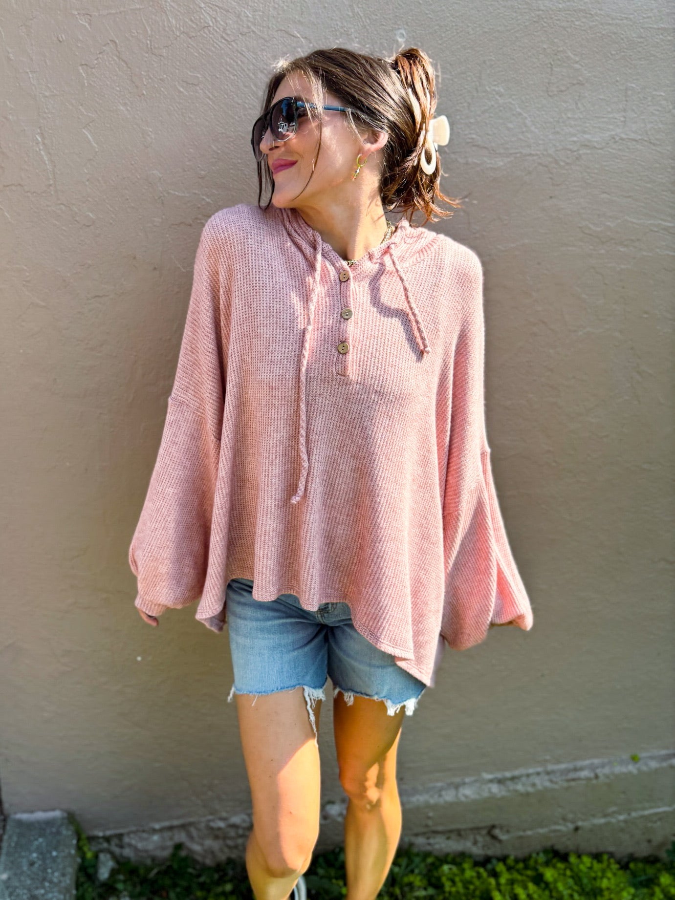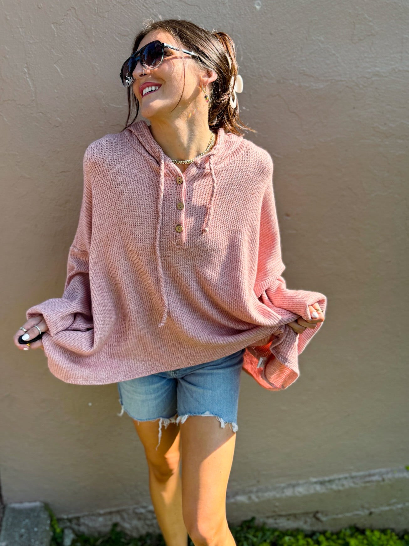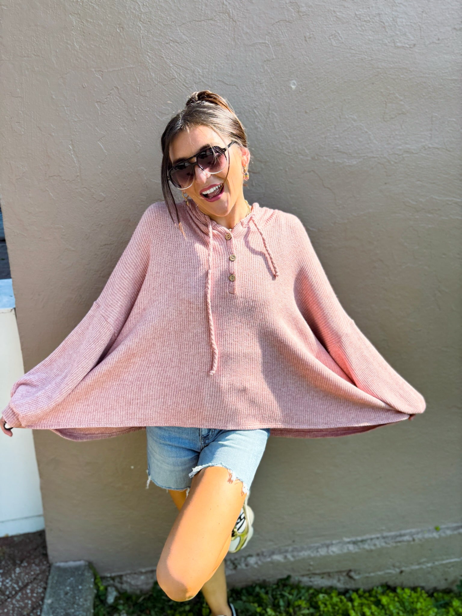 Meet your new cozy essential! This oversized tunic sweater comes in a gorgeous dusty pink hue that flatters every skin tone. It features a roomy hood for laid-back vibes and a chic 3-button neckline so you can style it open or closed. The relaxed, flowy fit pairs perfectly with leggings or denim for an effortlessly cute look.
