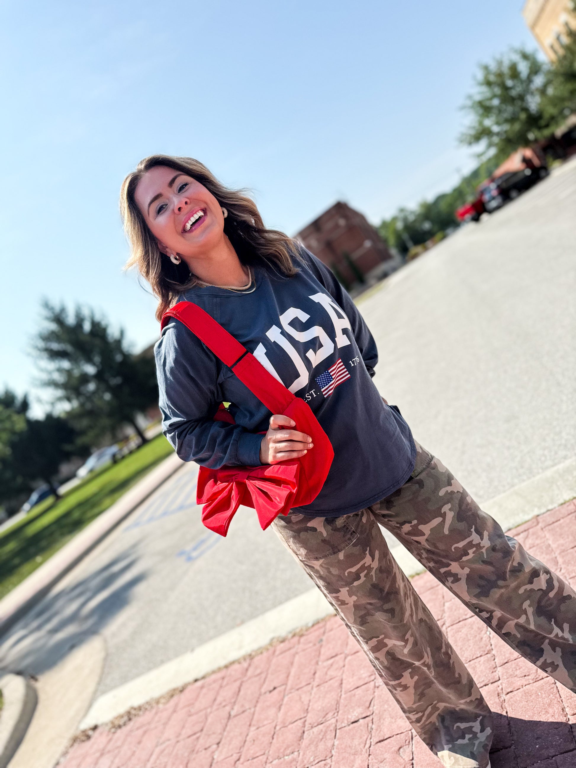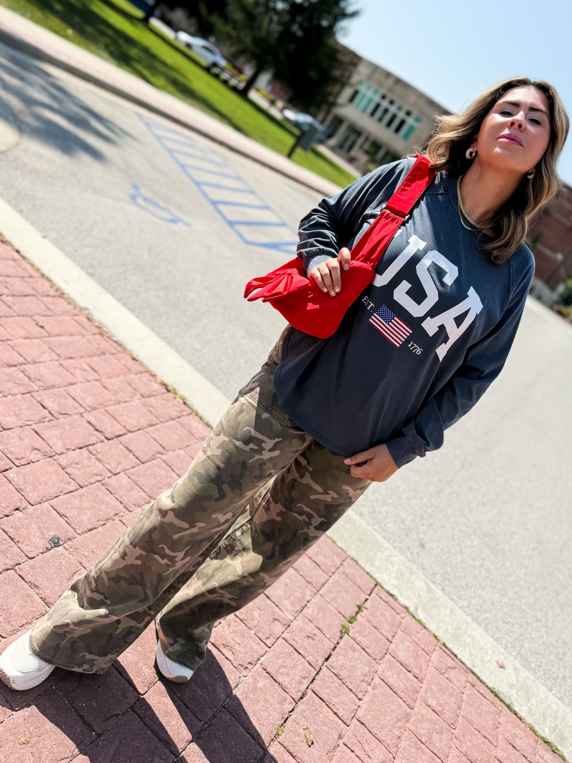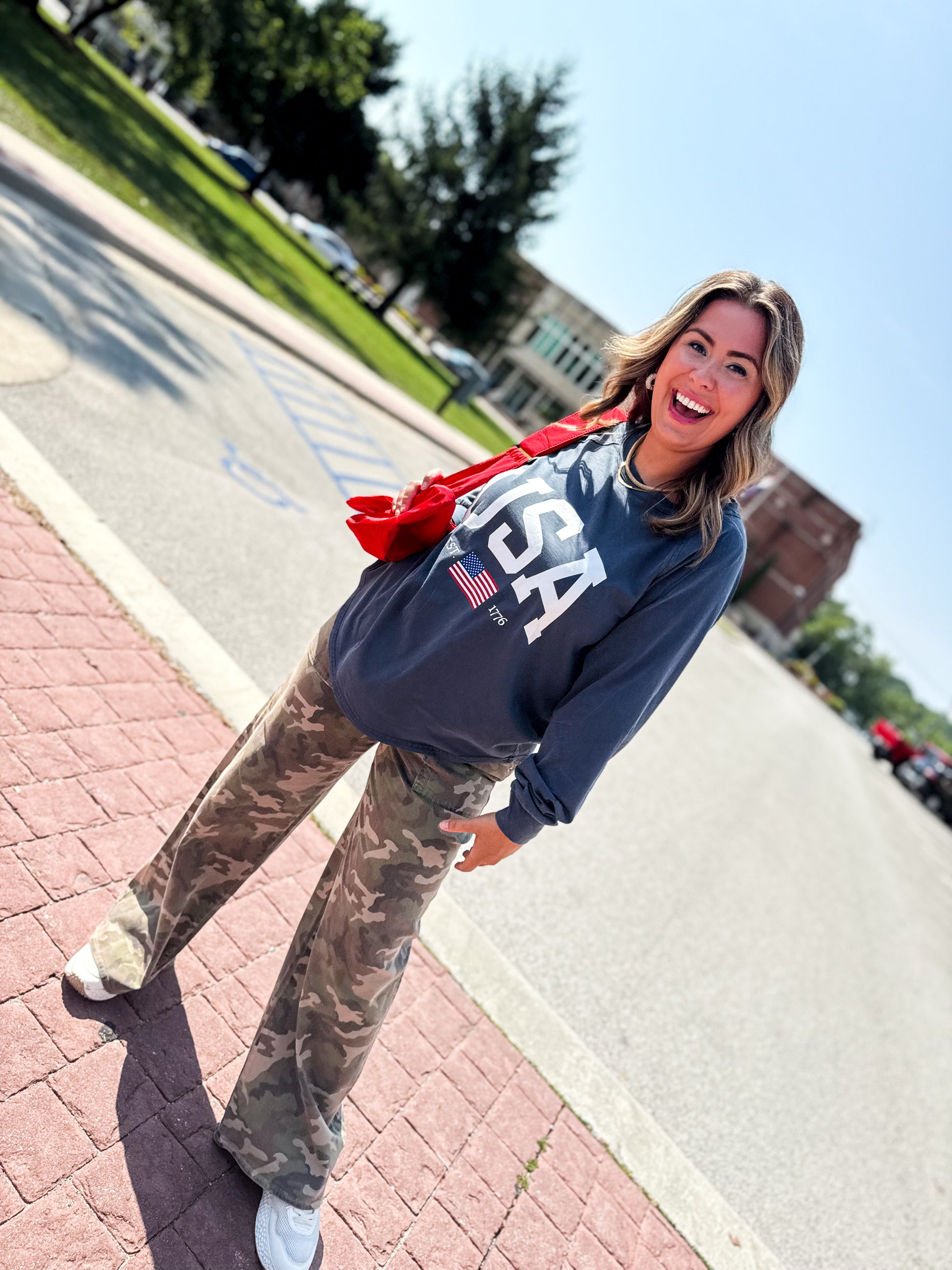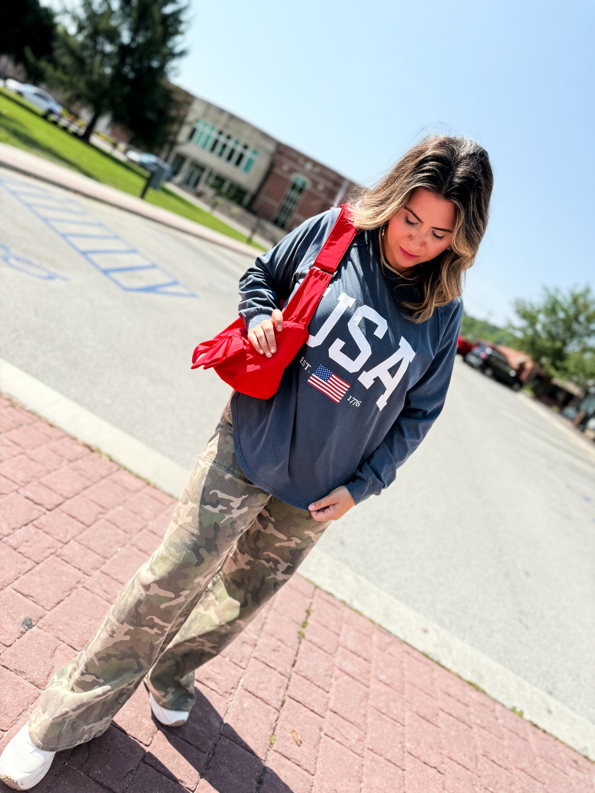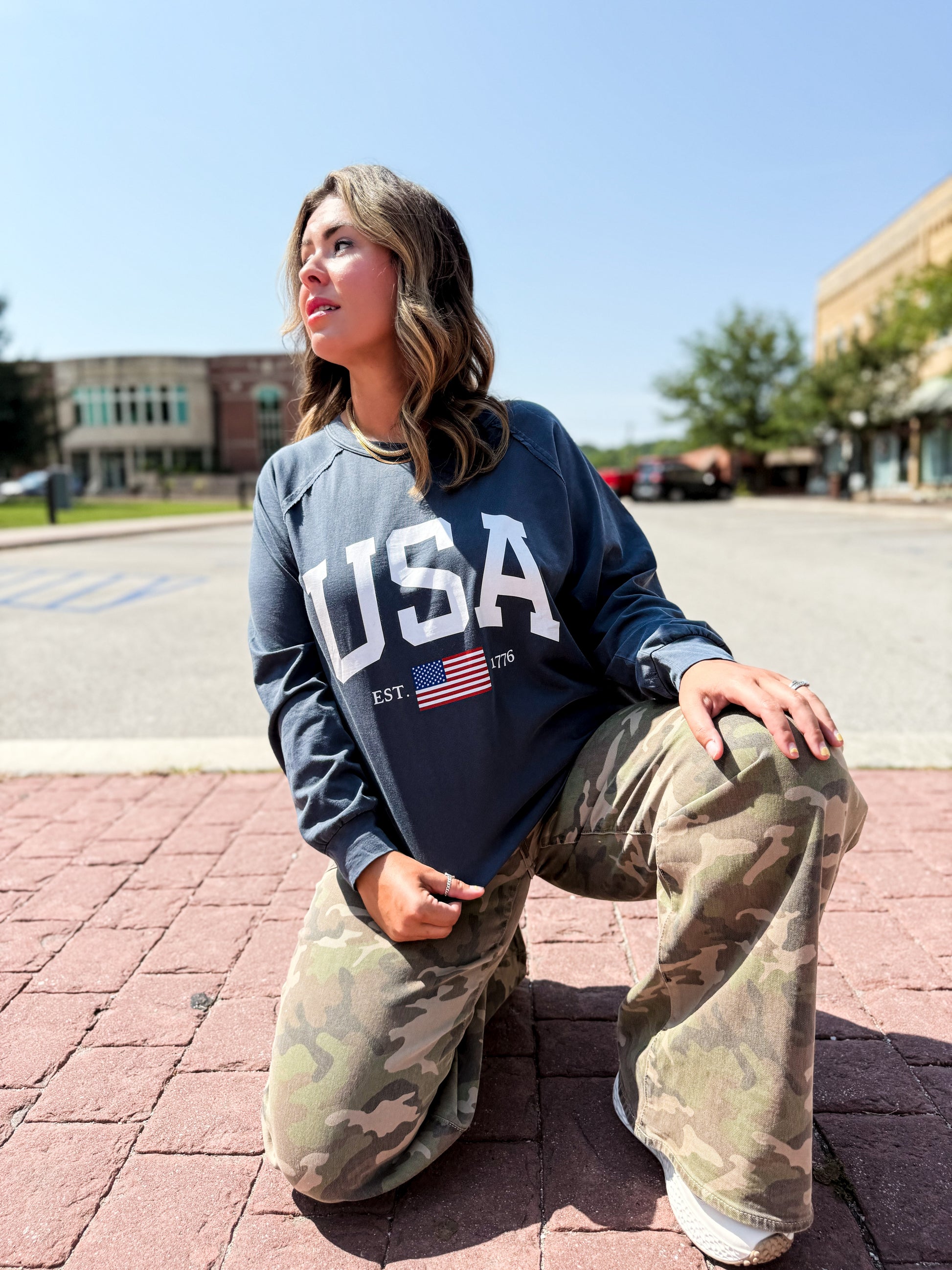 Celebrate your patriotic spirit with this USA Graphic Raglan Long Sleeve Tee! Featuring a comfy relaxed fit, raglan sleeves, and a classic round neckline, this solid knit top is perfect for layering or wearing solo. The bold "USA Est. 1776" graphic adds a fun, vintage vibe that’s ready to turn heads wherever you go. Cozy, casual, and full of charm—this tee is your new go-to for showing off your American pride in style!