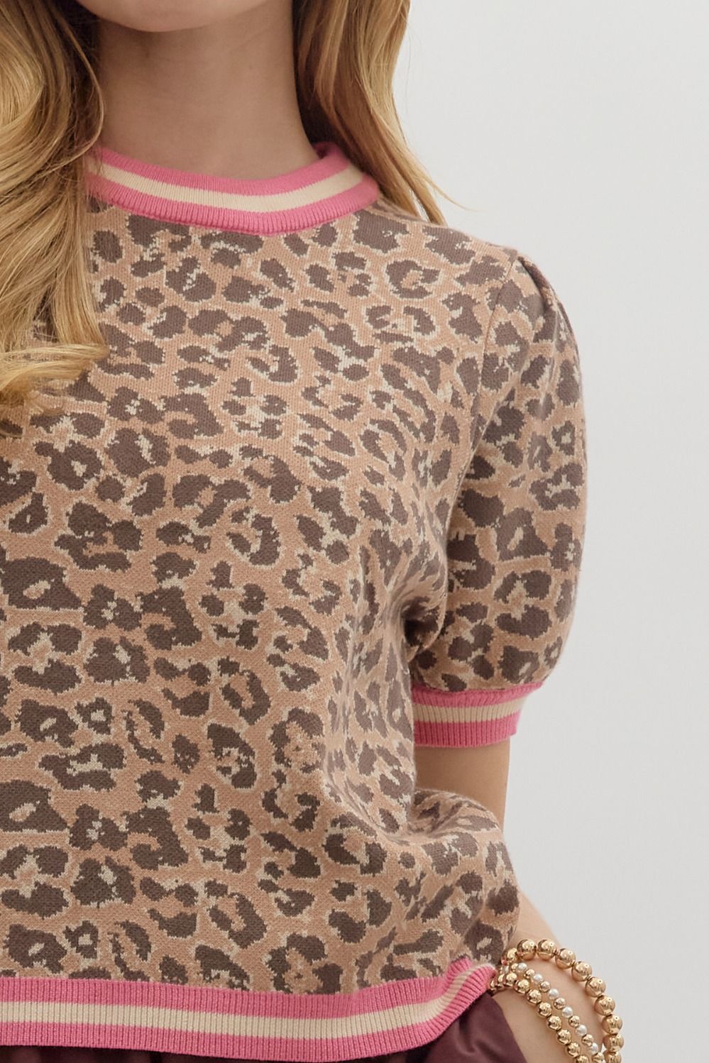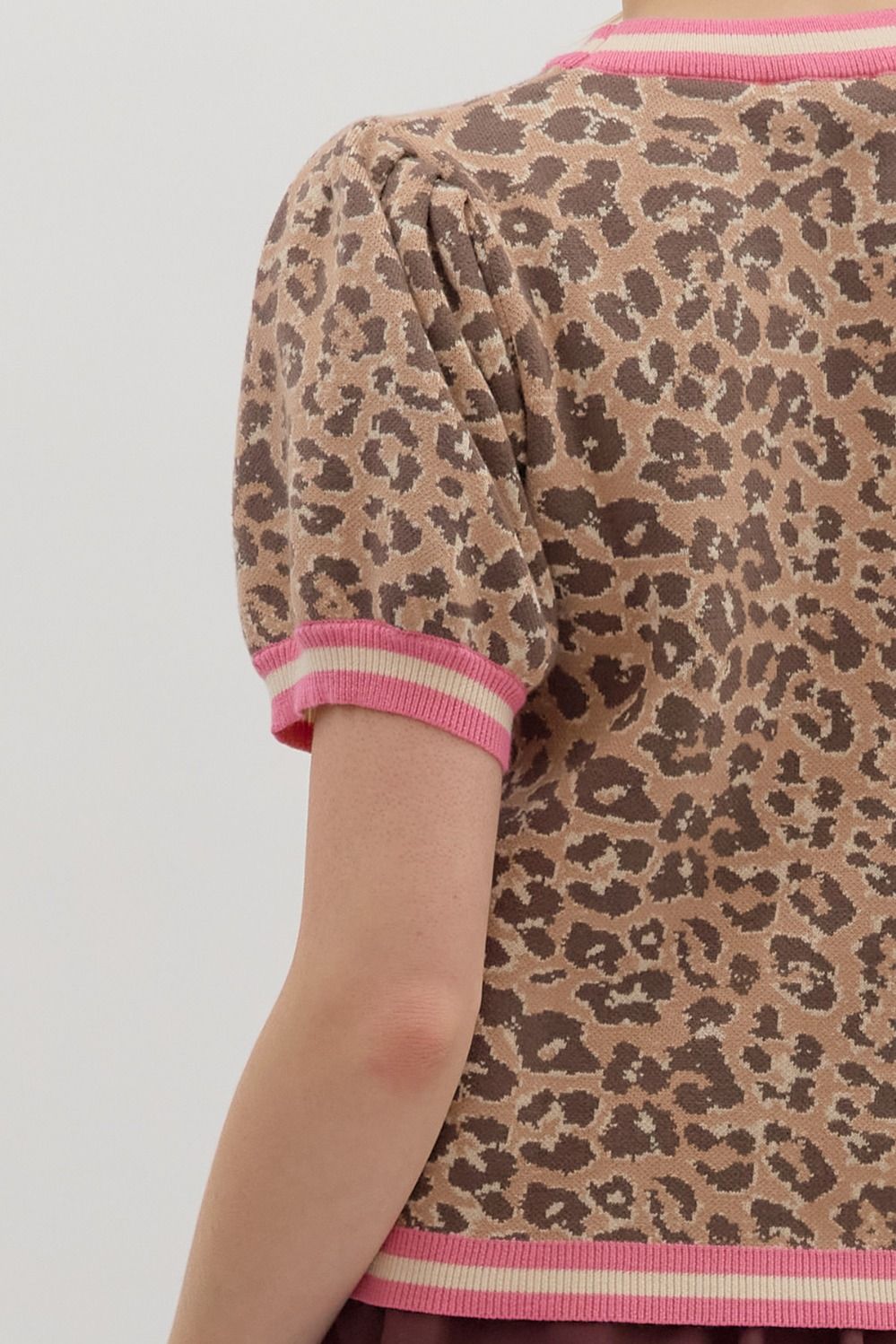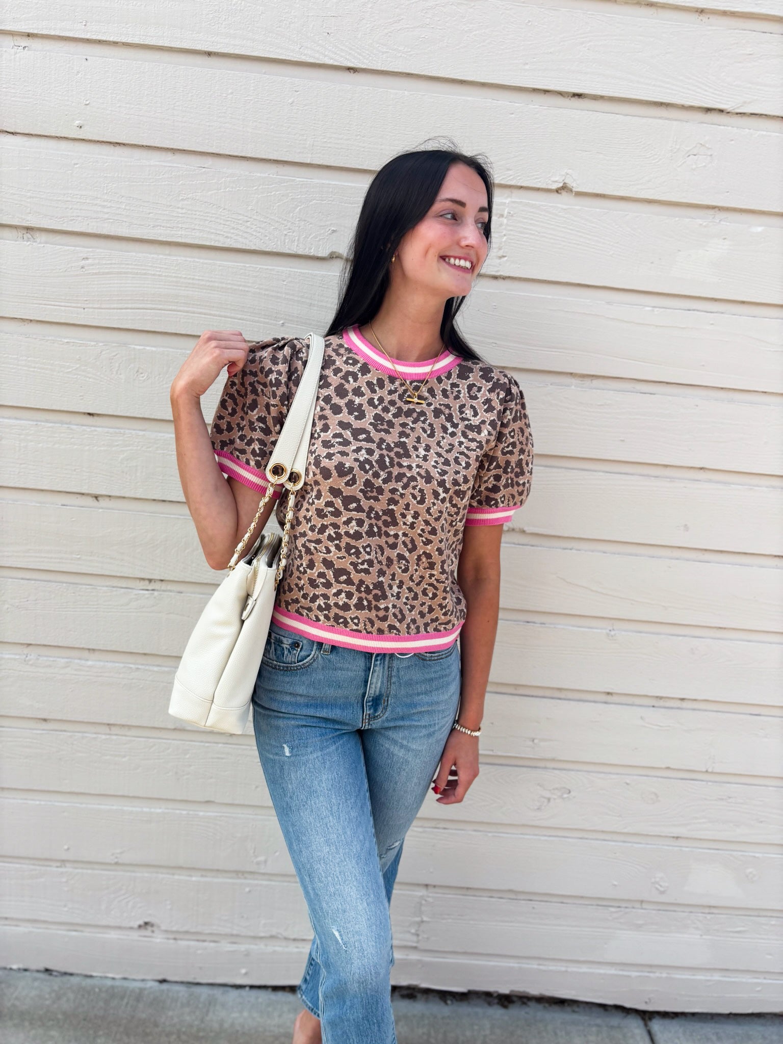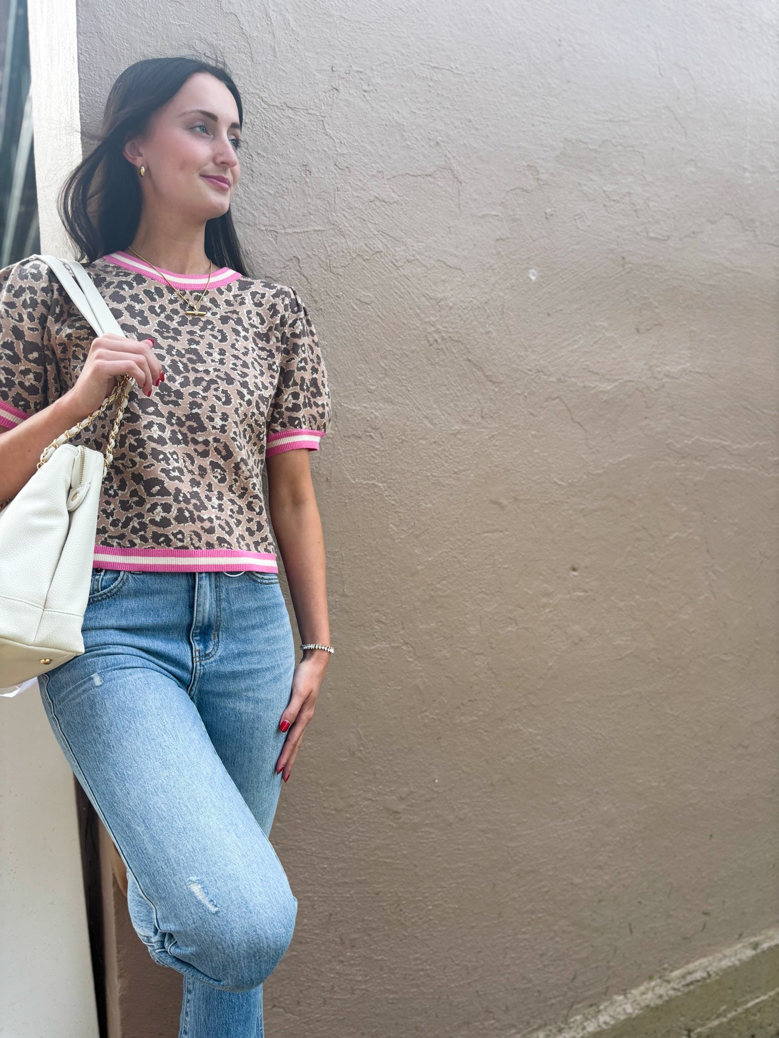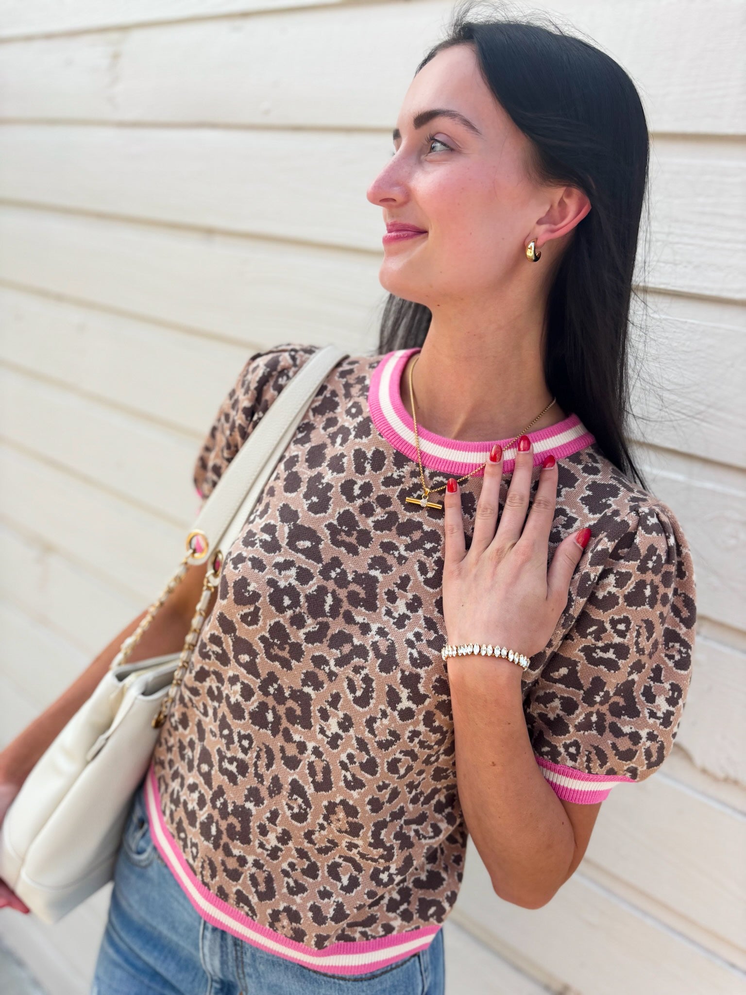Add a pop of play to your wardrobe with this short-sleeved leopard print sweater tee. The soft, knit feel gives cozy-chic vibes, while the bold print is balanced with pink and white striped trim along the collar, sleeves, and hem for the cutest touch of contrast.